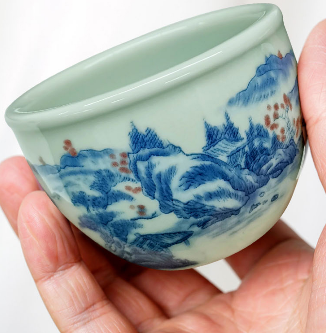 这款主人杯就是柴窑瓷器,景德镇知名窑口钟家窑烧造而成,柴窑青花是他们的招牌之一。松木烧窑,使杯子表面细腻光滑、釉面肥润,其上的纹样如墨染山水画一般,有晕染之感。