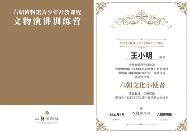 通过结营考核后,将获得六朝博物馆颁发的“文物演讲训练营”结营证书。