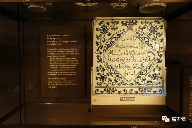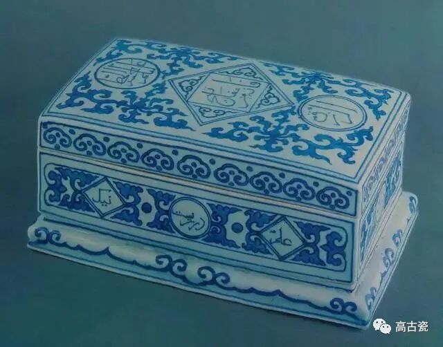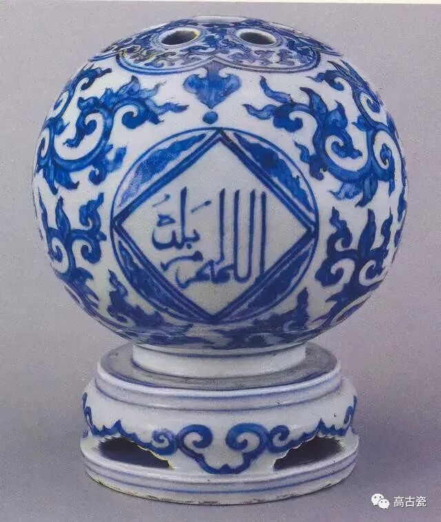 目前所见正德官窑回回文作品有青花与釉上红彩两种品类,且大部分以圆形、菱形及正方形等简易开光围绕回回文字,如寄存于大英博物馆的〈青花阿拉伯文砚瓶〉,在一外接圆的菱形开光中完整写入《古兰经》第72章的第18、19、20句:“一切清真寺的,都是真主的,故你们应当祈祷真主,不要祈祷任何物。当真主的仆人起来祈祷他的时候,他们几乎群起而攻之。你说:我只祈祷我的主,我不以任何物配他。”(《中文译解古兰经》,前引书,页573。)