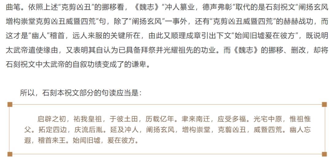 维太平真君四年癸未岁七月廿五日,天子臣焘使谒者仆射库六官、中书侍郎李敞傅用骏足、一元大武、柔毛之牲,敢昭告于皇天之神。启辟之初,祐我皇祖。于彼土田,历载亿年。聿来南迁。应受多福,光宅中原。惟祖惟父,拓定四边。庆流后胤,延及冲人。阐扬玄风,增构崇堂。克剪凶丑,威暨四荒。幽人忘遐,稽首来王。始闻旧墟,爰在彼方。悠悠之怀,希仰余光。王业之兴,起自皇祖。绵绵瓜瓞,时惟多祜。归以谢施,推以配天。子子孙孙,福禄永延。荐于皇皇帝天,皇皇后土。以皇祖先可寒配、皇妣先可敦配。尚飨。东作帅使念凿。用骏足、一元大武敢昭告于皇天之灵。自启辟之初,祐我皇祖。于彼土田,历载亿年,聿来南迁。惟祖惟父,光宅中原。克翦凶丑,拓定四边。冲人纂业,德声弗彰。岂谓幽遐,稽首来王。具知旧庙,弗毁弗亡。悠悠之怀,希仰余光。王业之兴,起自皇祖。绵绵瓜瓞,时惟多祜。敢以丕功,配飨于天。子子孙孙,福禄永延。我用word文档算了一下字数,石刻文本铭文主体部分共145字,《魏书》则为125字,少了二十个字,也就是少了五句。上面涂红的五句,就是完全多出来的。其余有的句子虽然两种版本都有,但是打乱了秩序。比如石室刻文“应受多福,光宅中原。惟祖惟父,拓定四边……克剪凶丑,威暨四荒”六句,《魏书》的版本是“惟祖惟父,光宅中原。克翦凶丑,拓定四边”四句,打乱了韵脚。含义也有微妙的变化,石室刻文既写了先祖“拓定四边”的丰功伟绩,也写了在位的太武帝拓跋焘“威暨四荒”的丰功伟绩,但在《魏书》的版本中,拓跋焘的丰功伟绩被删去了,“克翦凶丑”是个威猛的字,被直接从拓跋焘手中剥夺,给了他的列祖列宗。从史实来看,对拓跋焘是不公平的。学者多认为,孝文帝汉化之后,编纂者修改了刻文,删去文字中的鲜卑痕迹,表现了其对汉民族文化的全面肯定。由威震四方导致的远方人稽首来朝,改成“德声弗彰”,表示谦虚,是汉文化的风范,但焉知不是书写者对拓跋焘的否定?古代皇帝在位时,总不免自吹自擂,群臣正直的也不敢多嘴。但死去之后,是非功过,还是要看后世文人的评价。从修改情况来看,恐怕不是因为太武帝自谦,而是编纂者不喜欢他。拓跋焘在位时,制造了北魏历史上最大的文字狱事件,也就是崔浩国史事件,我想但凡是文人,对其肯定没有好感。顺手修改一下其自吹自擂的刻文,也是很正常的。有个问题值得一说,我在网上看到最新的一篇论文,《刘凯:句读与书写程序——嘎仙洞石刻祝文释读再议》,有这么一段话:我认为他新改的断句反而是有问题的,因为他完全不顾韵脚。刻文是韵文,韵脚的位置一般是语气停顿的位置。上面的修改,在“福”“父”“胤”处断开,对内容的理解会有一点影响。比如石刻文说“庆流后胤,延及冲人”,“胤”“人”押韵,是六朝时代的真部字,只是平去通押,不够精细,但也可能是和前面的几个仙韵字合韵。意思是说祖先的福善,流传给了后裔子孙,还延及到了太武帝本人(冲人),这才是一个完整的句子。但新标点却把“延及冲人”当成一个主语,来带领“阐扬玄风”一句,这是不对的。不过这倒也不是他的首倡,罗新的《民族起源的想像与再想像——以嘎仙洞的两次发现为中心》一文中,也是这样标点的,我认为都是没有顾及韵脚导致的疏忽。最后可以提及的是,这段铭文大量引用六经的词语,比如《书·尧典序》:“昔在帝尧,聪明文思,光宅天下。”“于彼土田”的“土田”,出自《诗·鲁颂·宫》篇,其云:“乃命鲁公,俾侯于东。锡之山川,土田附庸。”增构崇堂,无疑和《书·大诰》:“若考作室,既底法,其子乃弗肯堂,矧肯构”有关,其实也是讲承袭家业,继承先祖遗志,而有些学者理解为实际的建造庙宇,无疑是不谙典故。“玄风”学者大多说是指太武帝崇尚道教,但其实也可能兼指其采用清静无为的治国方针。《文选·庾亮<让中书令表>》:“遂阶亲宠,累忝非服,弱冠濯缨,沐浴玄风。” 即是例子。史书记载,拓跋焘在位时,虽然有征战,但经济上也注意轻徭薄赋,与民休息。石室刻文“归以谢施”中的“谢施”,出自《庄子·秋水》,《魏书》所载版本改为“敢以丕功”,可知原刻文字更为深奥。