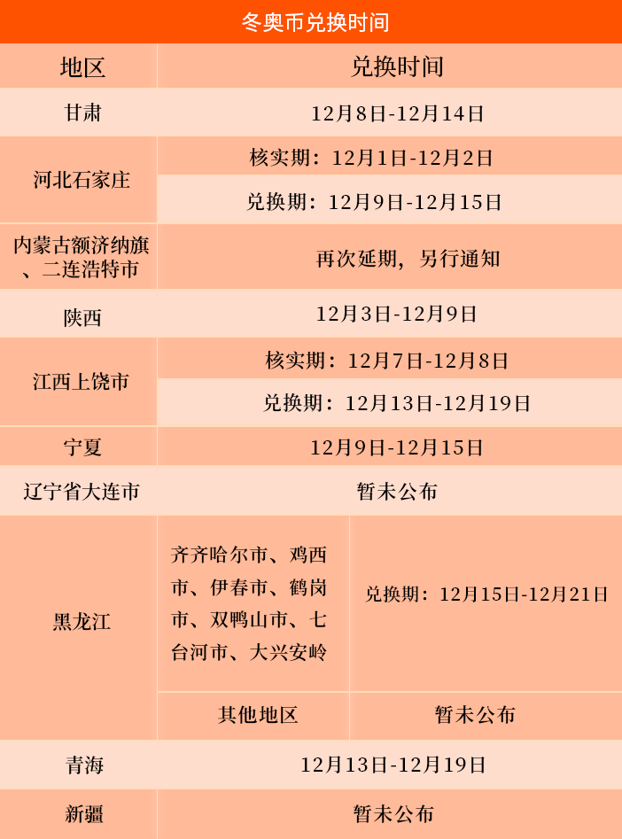 青海省、黑龙江部分地区也明确了冬奥币的兑换时间。