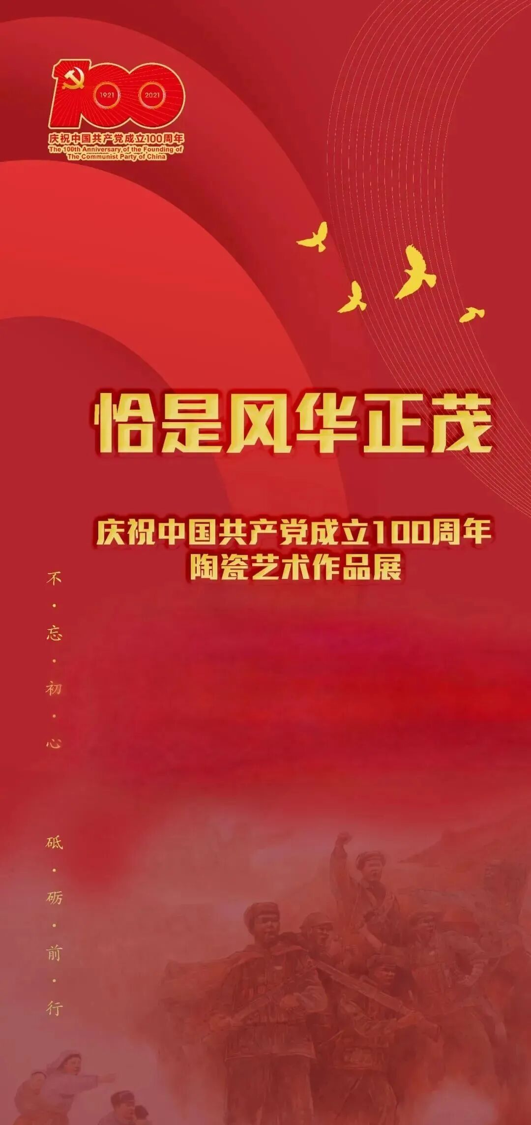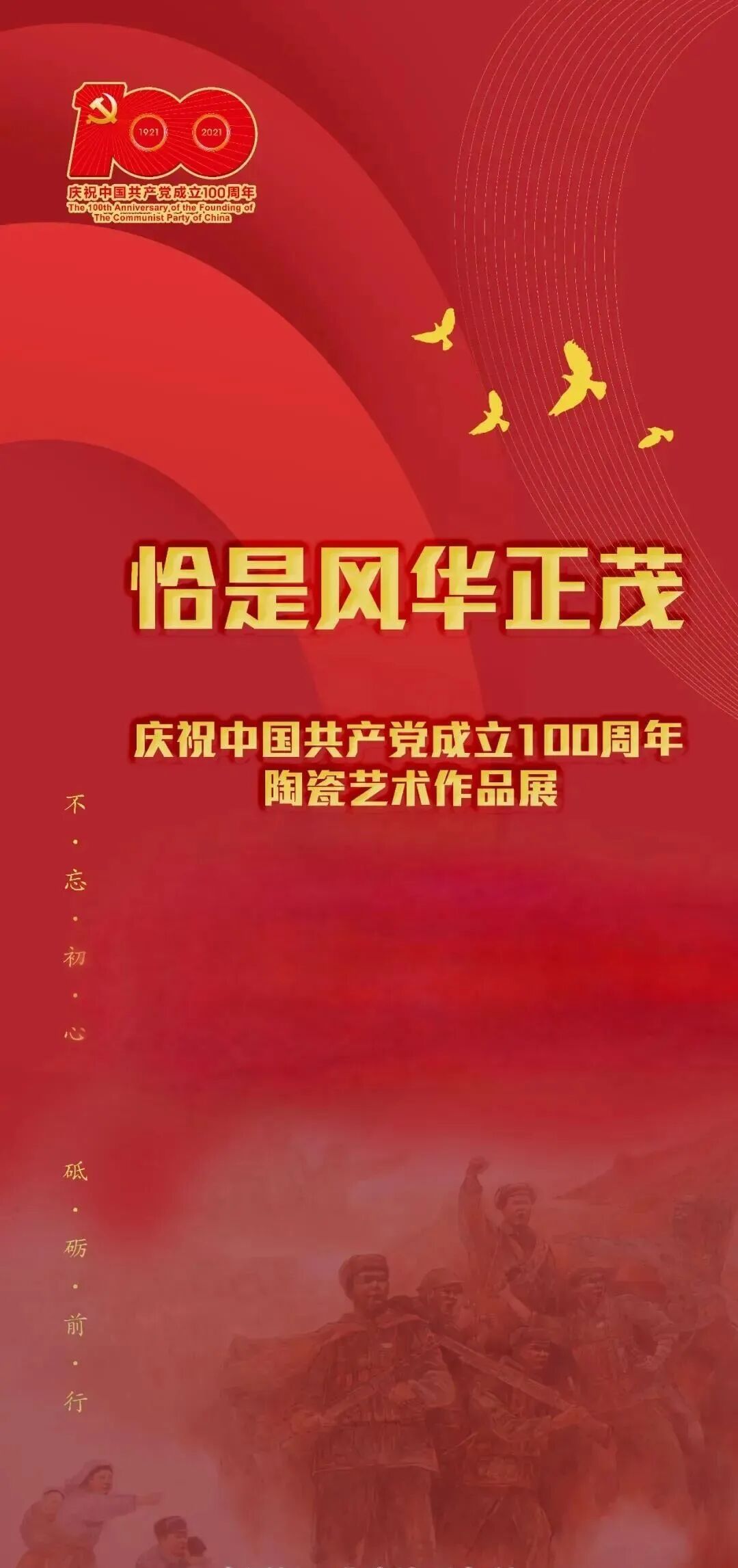 为庆祝中国共产党成立100周年,由中国轻工业陶瓷研究所主办的“恰是风华正茂——庆祝中国共产党成立100周年陶瓷艺术作品展”于2021年12月10日在景德镇市美术馆举行。本次展览推出了中国轻工业陶瓷研究所众多陶瓷艺术家倾心打造的描绘建党百年辉煌历程和祖国百年巨变的主题创作,用陶瓷釉彩挥写一百年来我们党团结带领各族人民,进行革命、建设、发展的辉煌历程,展现我们党为实现国家富强、民族振兴、人民幸福和人类文明进步事业作出的历史功绩,彰显党在各个历史时期淬炼锻造的伟大精神。