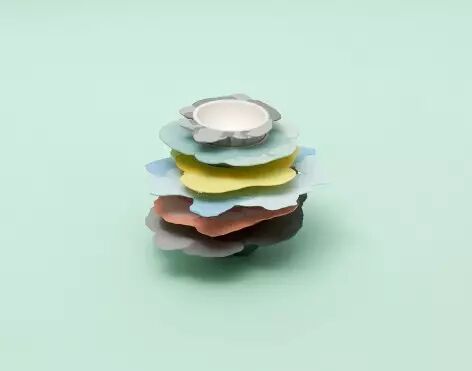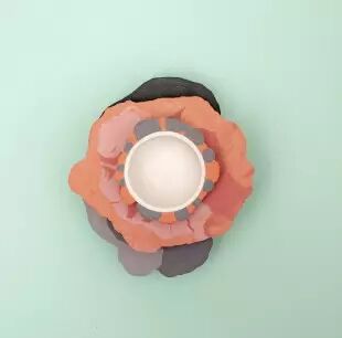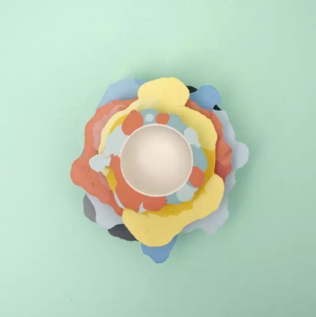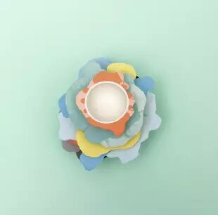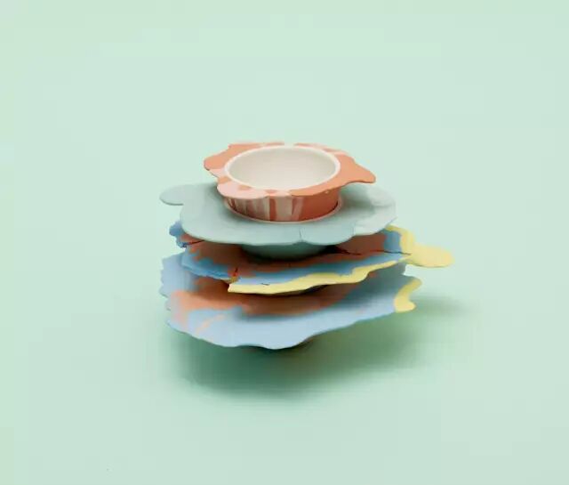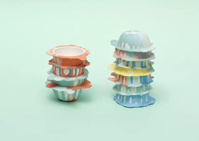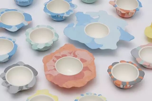 设计作品通过组合两种生产方法而得到:首先,将容器(碗或盘子)浇注成型,然后通过随机地将染色的泥浆泼在上面而破坏其正圆的形状,直到泥浆定型并产生不规则的边缘。