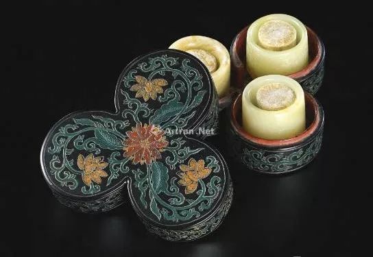 本拍品原配剔红花形漆盒,每件扳指置于其中皆自得其位,严丝合缝。剔红盒漆色沉稳,漆层浑厚,通体于锦地回纹之上满雕缠枝梅花,枝干遒劲,花瓣舒展,有迎风摇曳之感,工艺精湛,纹饰繁缛华丽,器型周正巧妙,匠心独具,贵气逼人。剔红肇始于唐,盛行于宋,此后历代皆有制作,发展至清代,整体工艺水平更是到达顶峰之境。古时雕漆器相当贵重,唯宫廷和达官显贵能够享用,《帝京景物略》卷四引燕市漆器歌云:“有物沉沉其名漆……剔红及倭漆,卖买时值十万钱。”;高濂《燕闲清赏笺》中也提到:“穆宗(成化)时新安黄平沙,造剔红比果园厂,花果人物之妙,刀法圆活清朗……一合三千文价”,足见不但雕漆器贵重,雕漆名匠亦足以享誉一方。