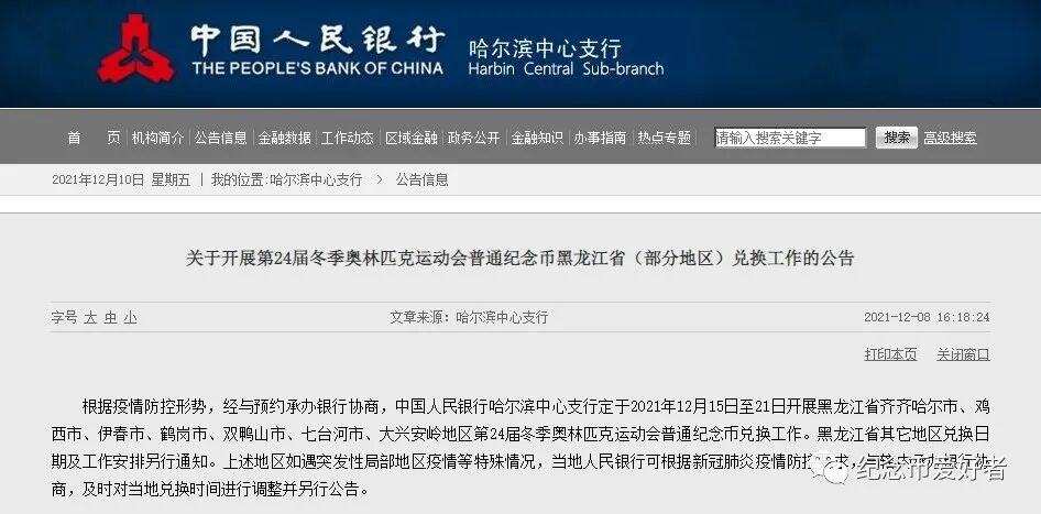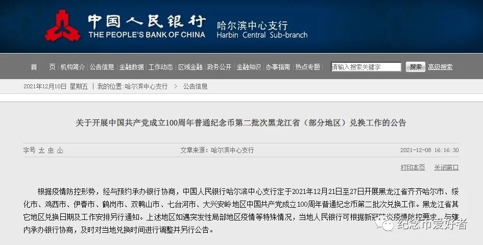 根据疫情防控形势,经与预约承办银行协商,中国人民银行哈尔滨中心支行定于2021年12月21日至27日开展黑龙江省齐齐哈尔市、绥化市、鸡西市、伊春市、鹤岗市、双鸭山市、七台河市、大兴安岭地区中国共产党成立100周年普通纪念币第二批次兑换工作。