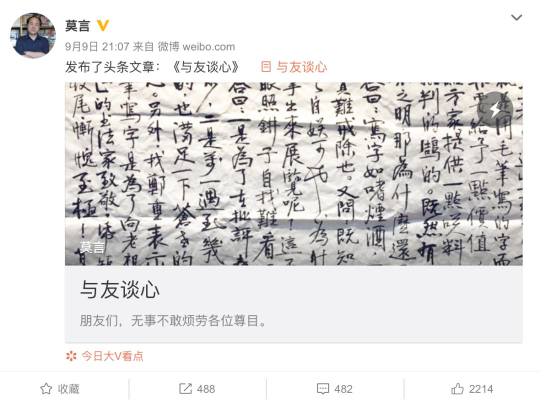 莫言之前办书法展,消息一出就曾被骂惨了。据其朋友透露,莫言很后悔答应办这个展,没想到艺术圈的水这么深。艺术家出书写小说,作家不会主动攻击。作家办个墨迹展,竟受到这么剧烈的攻击。甚至有人嘲讽:莫言诺奖的资金被骗,所以办书法展来圈钱。如今,名人大家的字画越来越盛行,越来越多的天价......不管他画得、写的艺术不艺术,瞎写瞎画也是艺术啊,都奔着名去了?谁还会去想艺术的事!"虽然莫言坦言自己的字不是书法,也不是艺术。"我们不得不再次反思为什么天价字画会越来越荒唐,艺术界的门槛为什么会那么低?由于骂的人太多,莫方发微博求书法圈的大佬放过,以下是莫言微博原文:一是十月中旬,我要在鼓楼东南角的时间博物馆办一个“墨迹展”,此事媒体已有报道,网上亦有议论。现在看来,办这个展览有点缺明少智。缺的是自知之明,少的是人生智慧。我耳朵根子软,不经劝,一次不应,两次不应,三次就应了。天下没有卖后悔药的,事已至此,只有硬着头皮走下去。我通过微博向大家申明,我的字不是书法,往好里说是用毛笔蘸着墨汁涂鸦留下的痕迹,往坏里就不说了,免得脏了大家的眼睛。办这个展的目的一是希望在批评中求进步;二嘛,也有期望着几句哪怕是客套的表扬的虚荣,因为我肯定是错误地感觉到这几年来在网友们的批评下我的字有了一点进步。第三就是希望通过办展让大家更多地看到我的字的真模样,因为现在坊间和网上流传着一些所谓的“莫言书法”其实非我所写。有几位朋友摹我的字已经摹得很像,但一不小心,就把他们的书法功底露出来了。那些写得完全不像我的字而又署上了我的名的,写得也都比我好。真是委屈了这些朋友。其实,办这个展最主要的目的,还是希望在这个键盘时代里,用我自己拙劣的实践,为大家充当反面教材,唤起大家用毛笔书写的热情,因为,所谓的中国传统文化,汉字和汉字的书写——尤其是毛笔书写——是基础也是最重要的内容。当然,实事求是地说,要每个人办展不可能,但大家都可以把自己的字往网上贴呀,往朋友圈里发呀,大家可以说,连莫言那样的丑字都可以挂出来展示,我们比他写得好,为什么不展示?——我想这样一来,书法才真是具有了进步和提高的广泛的群众基础。第二件事是,近日朋友圈内流传我将诺贝尔奖金380万投入某某金融亏了个血本无归的消息,这消息真的不是真的。既然这消息不是真的,那借着这假消息滋生出来的消息自然也是假消息。贴上几幅将在这次展览中出现的墨迹,敬请各位朋友哂正。莫言的言辞之中有几分自嘲和无奈,也有一些赶鸭子上架和自我澄清、致歉的心情。莫言坦言,“自己的字不是书法,不是艺术”。对于莫言的书法以及致歉信,大家可以谈一下看法!