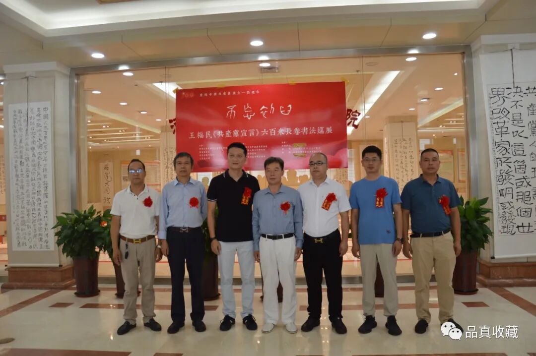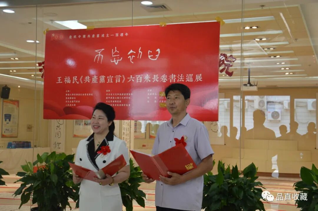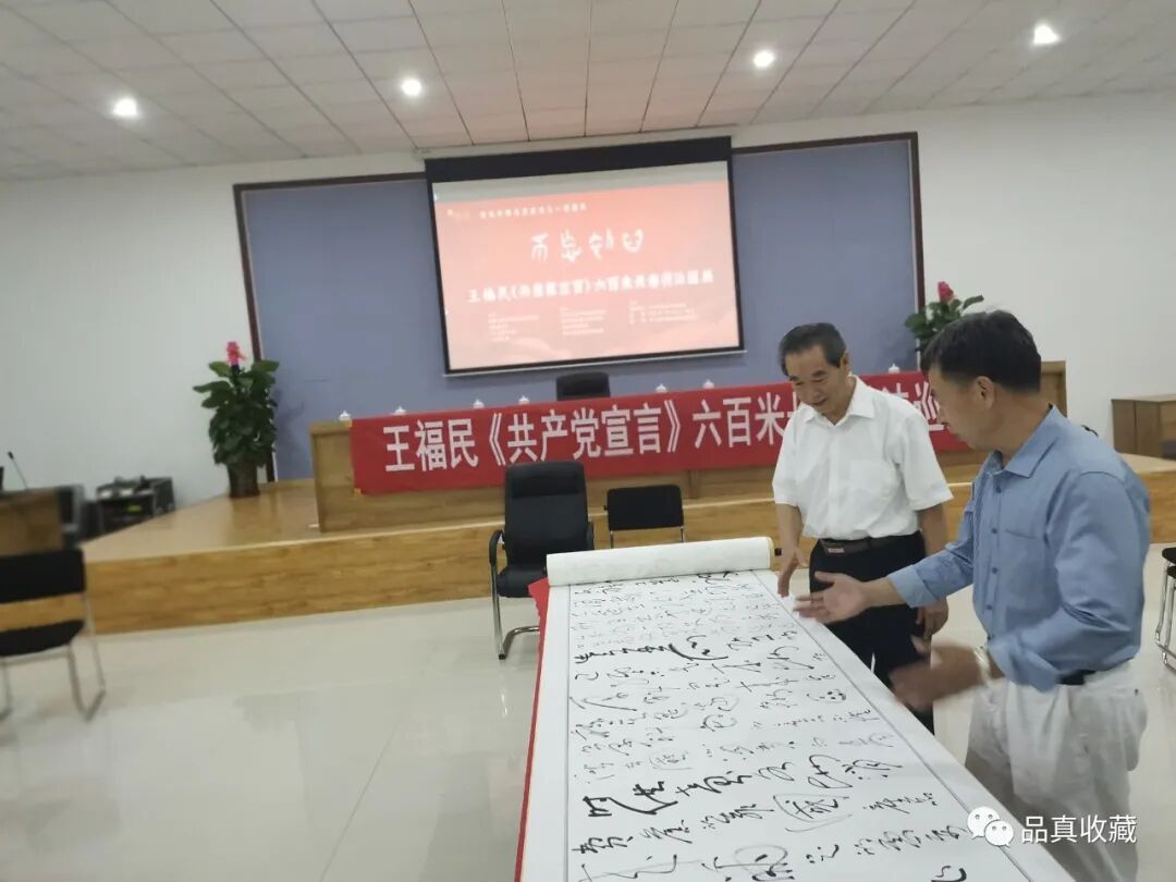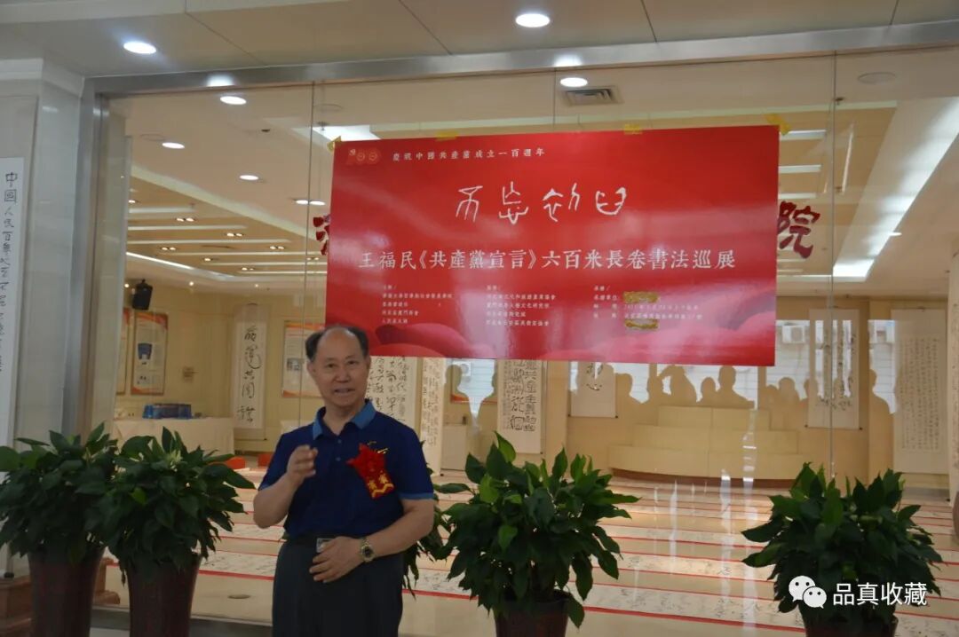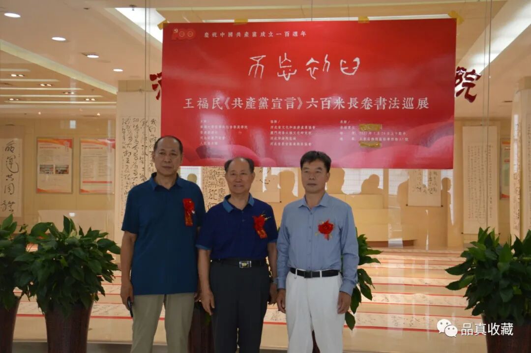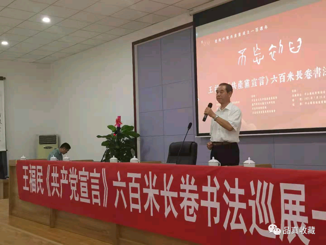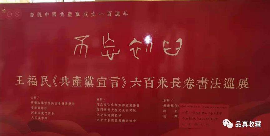 (品真讯)2021年7月25日星期日上午11:30,由华侨大学哲学与社会发展学院、香港书谱社、河北省厦门商会、人民美术网等单位主办,由河北省文化和旅游产业协会、河北琴海陶瓷城、河北省石家庄市长安区美术家协会、厦门周易太极文化研究会等单位协办,由平山县政府西柏坡宾馆和西柏坡红色教育学院承办的庆祝中国共产党建党100周年“不忘初心”《共产党宣言》王福民六百米长卷书法公益展在河北省石家庄市平山县政府西柏坡宾馆3楼展厅成功举办。