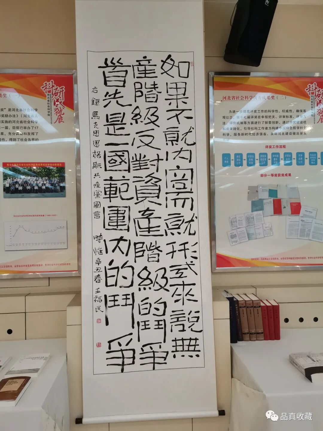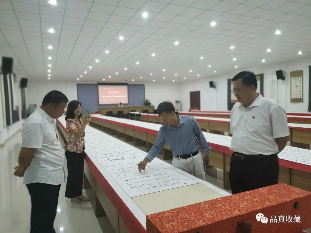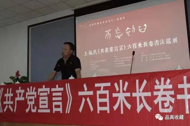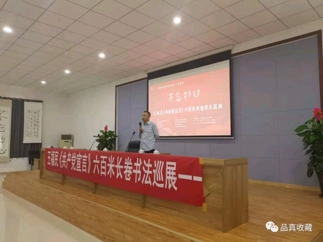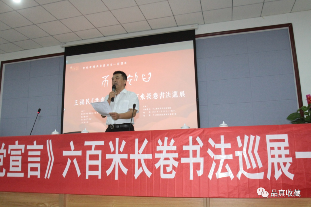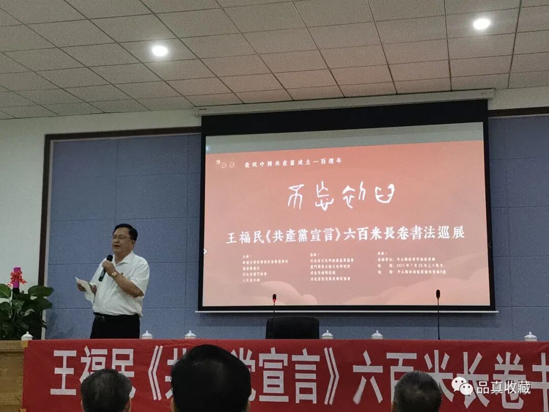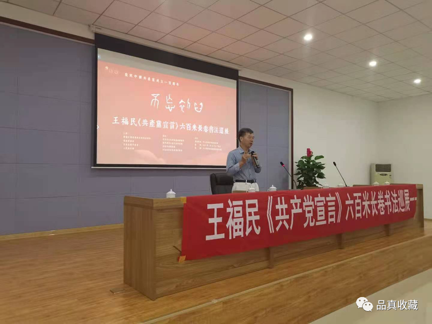 (品真讯)2021年7月25日星期日上午11:30,由华侨大学哲学与社会发展学院、香港书谱社、河北省厦门商会、人民美术网等单位主办,由河北省文化和旅游产业协会、河北琴海陶瓷城、河北省石家庄市长安区美术家协会、厦门周易太极文化研究会等单位协办,由平山县政府西柏坡宾馆和西柏坡红色教育学院承办的庆祝中国共产党建党100周年“不忘初心”《共产党宣言》王福民六百米长卷书法公益展在河北省石家庄市平山县政府西柏坡宾馆3楼展厅成功举办。