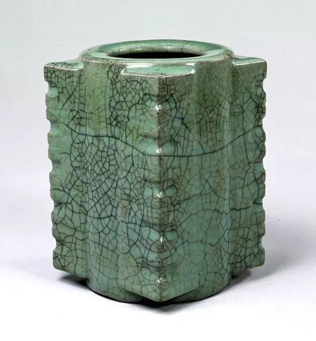 哥窑的釉色以青为主,铁足紫口,釉面有碎纹而著名,号日“百圾碎”。纹片呈血色、黑蓝色、浅黄色等,其中以黑色最多,被称为“金丝铁线”,而按形状分则呈网形纹、梅花纹、细碎纹等。釉面开片时产生的美妙声音,如涧如泉、如琴如铃,犹如隐于大山深处的天籁之声,让人如痴如醉。哥窑最主要、最奇妙、最令人称道、又最被人忽视的特征,即所谓“攒珠聚球”。陶瓷界先辈孙瀛洲就写过,“如官、哥釉泡之密似攒珠”,“攒珠”指的是哥窑器中之釉内气泡细密像颗颗小水珠一样,满布在器物的内壁和外壁或内身和外身上。![]()