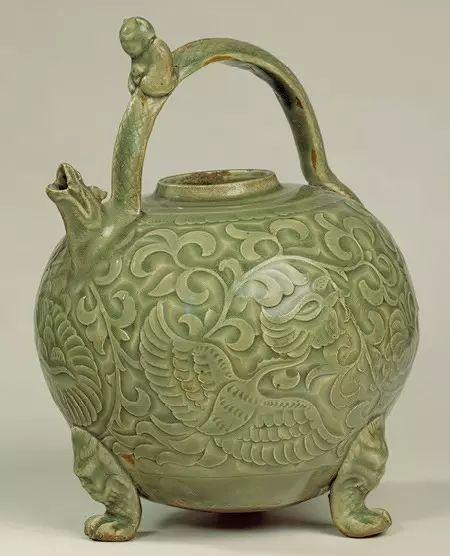 宋 耀州窑刻花提梁兽首三足壶
