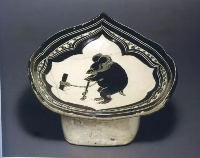 宋 黑剔花熊戏纹荷叶形枕