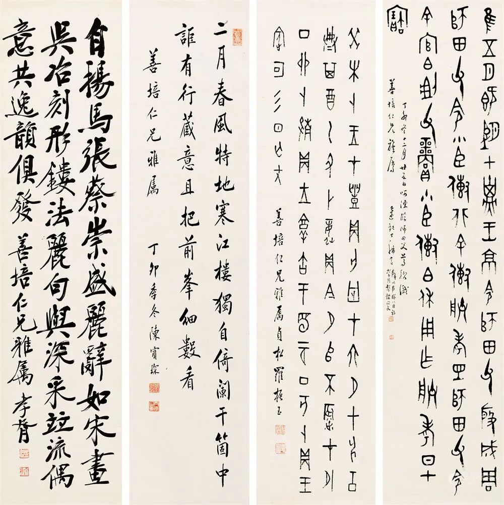 Lot 133 陈宝琛 丁佛言 郑孝胥 罗振玉 书法拍品估价:150,000 - 250,000 人民币钤印:郑孝胥印、太夷;臣陈宝琛、太傅之章;迈钝;振玉印信、老于壶患3.丁卯冬十二月廿五目呵冻临师田父尊款识。善培仁兄雅属,迈钝丁佛言。