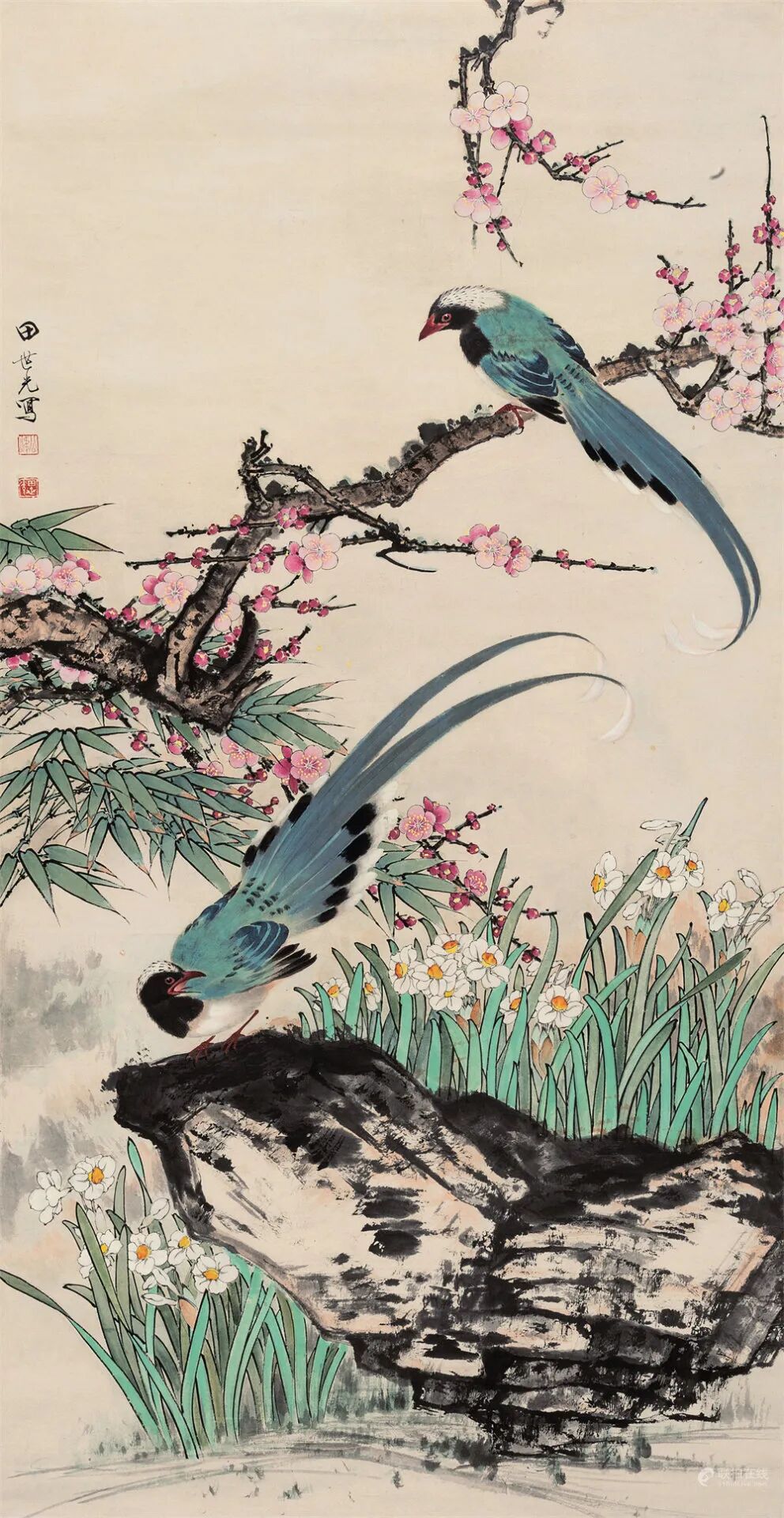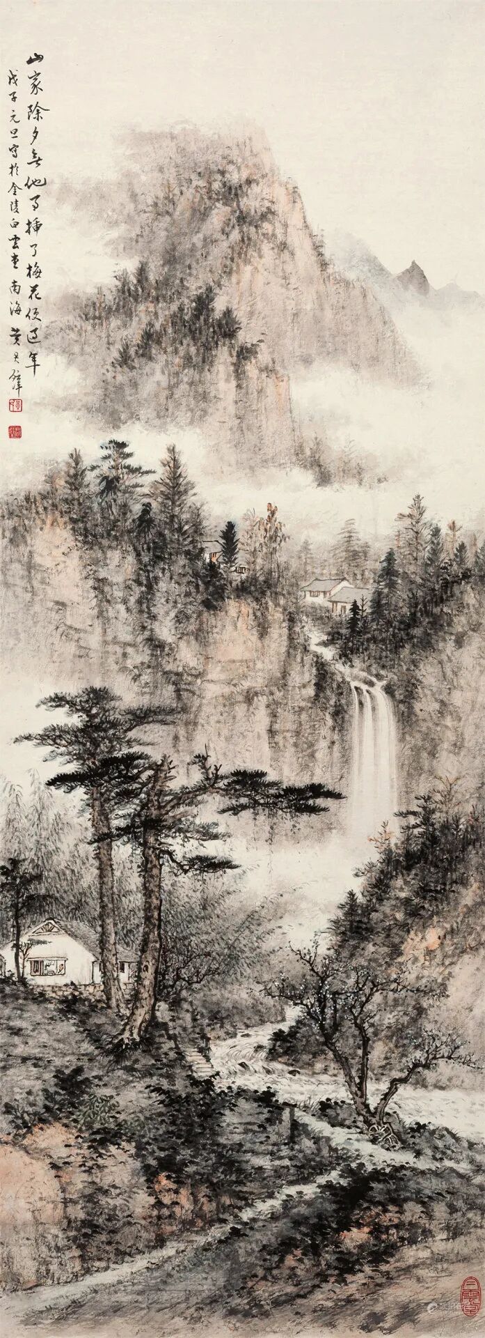 拍品估价:100,000 - 150,000 人民币款识:山家除夕无他事,插了梅花便过年。戊子元旦写于金陵白云堂,南海黄君璧。1.《中国近现代国画名家精品集——黄君璧/山水》,上海书画出版社,2014年。2.《黄君璧一〇五岁诞辰纪念画集》P16,国立国父纪念馆。3.《黄君璧一一五岁诞辰纪念画集》P184,国立国父纪念馆。4.《再现渡海三家艺韵风华》P107,国立国父纪念馆。(出版物尺寸有误,只提供复印件)