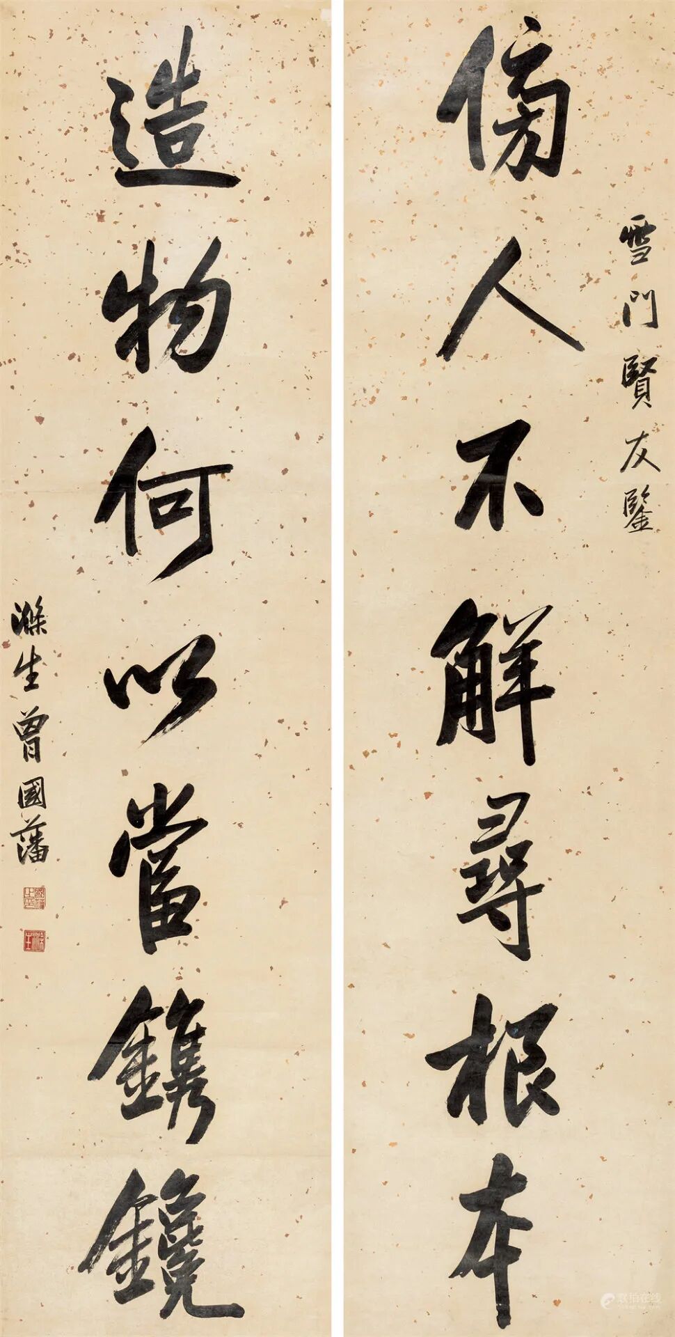 拍品估价:300,000 - 400,000 人民币款识:傍人不解寻根本;造物何以当镌镵。雪门贤友鉴,涤生曾国藩。说明:上款人许瑶光(1817-1881),字雪门,号复斋,晚号复叟,湖南善化人。清代诗人,浙江名宦,被当时舆论誉之为近世少有的贤太守。著作有《雪门诗草》等。道光二十九年(1849)拔贡,选授诸暨县知县,在任清廉公正,有循声。同治三年(1864)升任嘉兴知府,在任十七年。为政廉明,务求实际。招徕垦荒,发展农业。修葺孔庙,重建鸳湖书院,重修嘉兴、秀水县学,兴办教育。浚河、修桥、筑路,发展商贸。修整南湖建筑群,新建八咏亭、鉴亭等,为嘉兴社会经济发展办了许多好事。嘉兴士庶建“来许亭”、“许公三至亭”以纪念。许瑶光之女嫁何绍基(著名学者,大书法家)之侄;再后,何绍基小孙女何琳荪又嫁许瑶光长孙许直,许、何两家结为亲家。