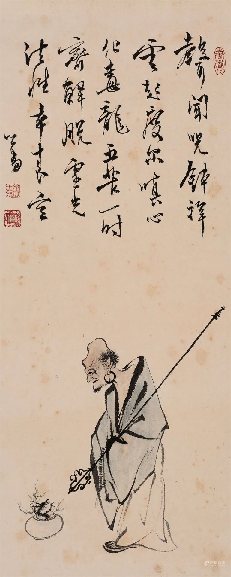 拍品估价:100,000 - 150,000 人民币款识:声闻咒钵祥云起,度尔嗔心化毒龙。五苦一时齐解脱,灵光法性本来空。心畬。