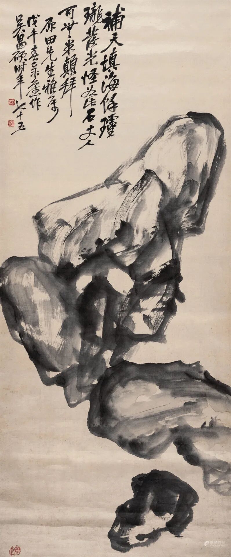 拍品估价:120,000 - 180,000 人民币款识:补天填海余,玲珑发光怪。如此石丈人,可无米颠拜。原田先生雅属。戊午春录旧作,吴昌硕时年七十五。