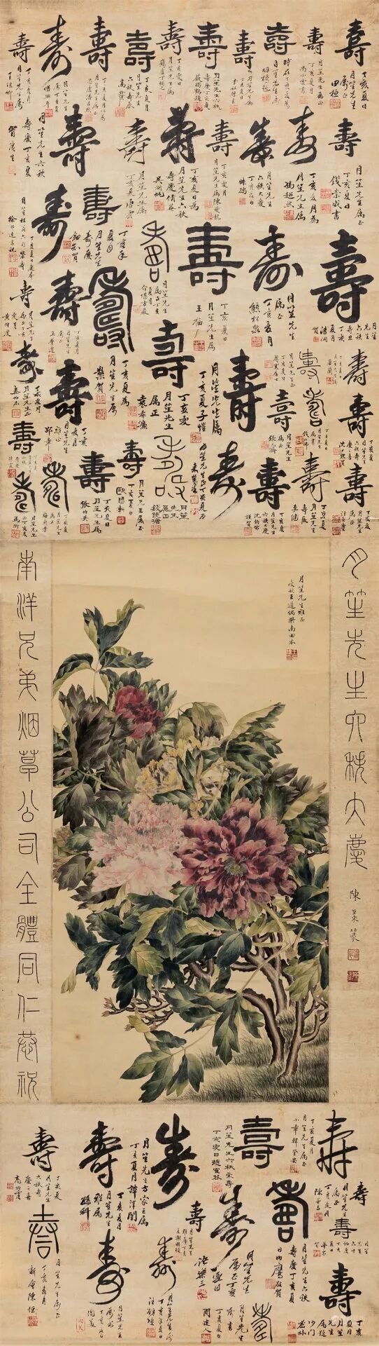 拍品估价:350,000 - 550,000 人民币1.杜月笙六十大寿。南洋兄弟烟草公司全体同仁恭祝,陈巨来篆。2.田桓、丁辅之、高野侯、傅斯年、冒广生、徐邦达、唐云、吴湖帆、赵叔孺、冯超然、王福庵、张伯荚、马衡、梅兰芳、沈尹默、孙科等数十名家题“寿”字。3.上款人杜月笙(1888-1951),原名杜月生,后由章太炎建议,改名镛,号月笙,江苏川沙人。中国近代史上海最大的黑帮帮主,实业家、社会名流与地方领袖、政治风云人物。