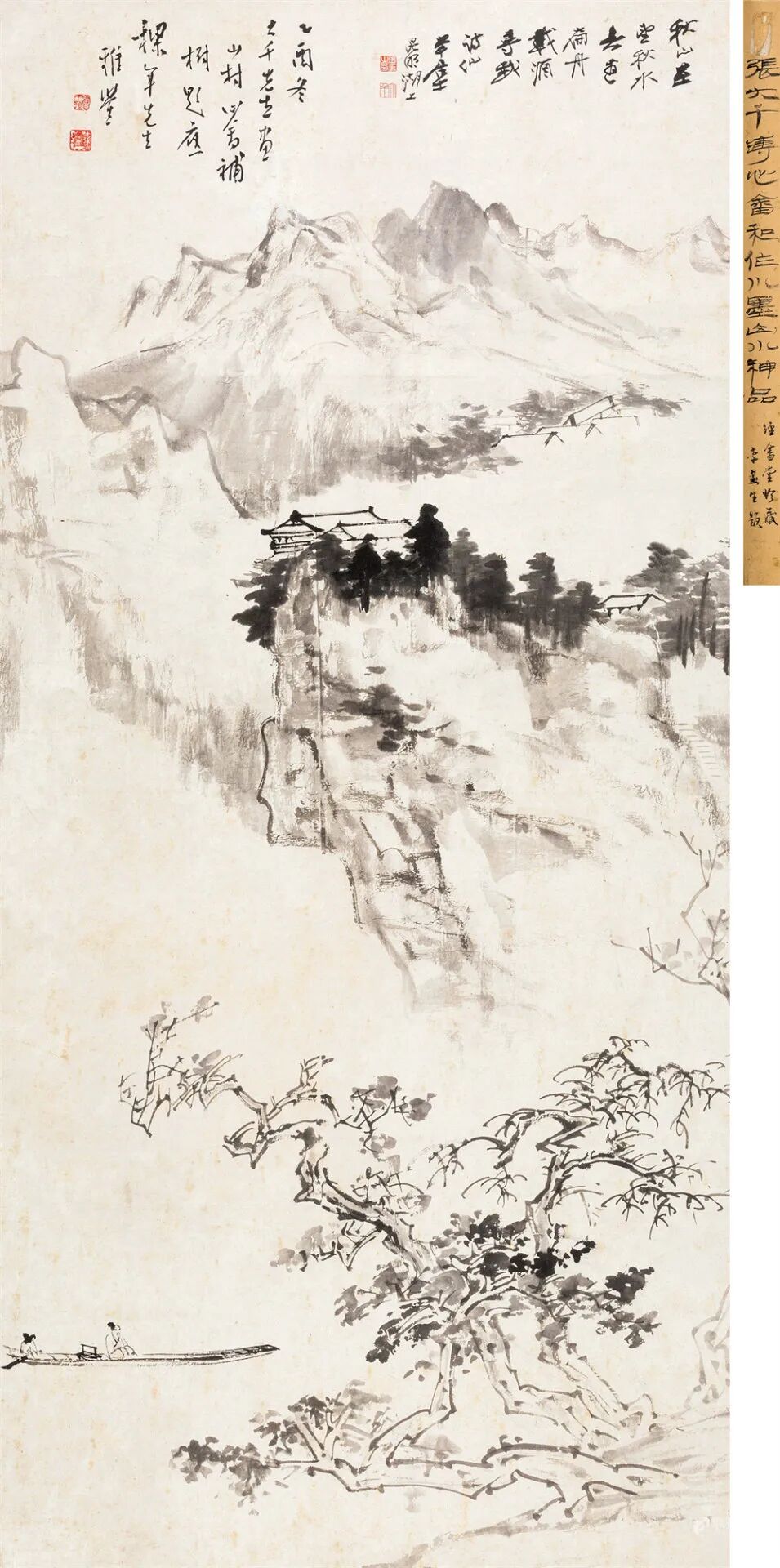 拍品估价:400,000 - 600,000 人民币1.秋山在望,秋水无边。扁舟载酒,寻我诗仙。大千居士昆明湖上。2.乙酉冬,大千先生画山村,心畬补树,题应梁年先生雅鉴。