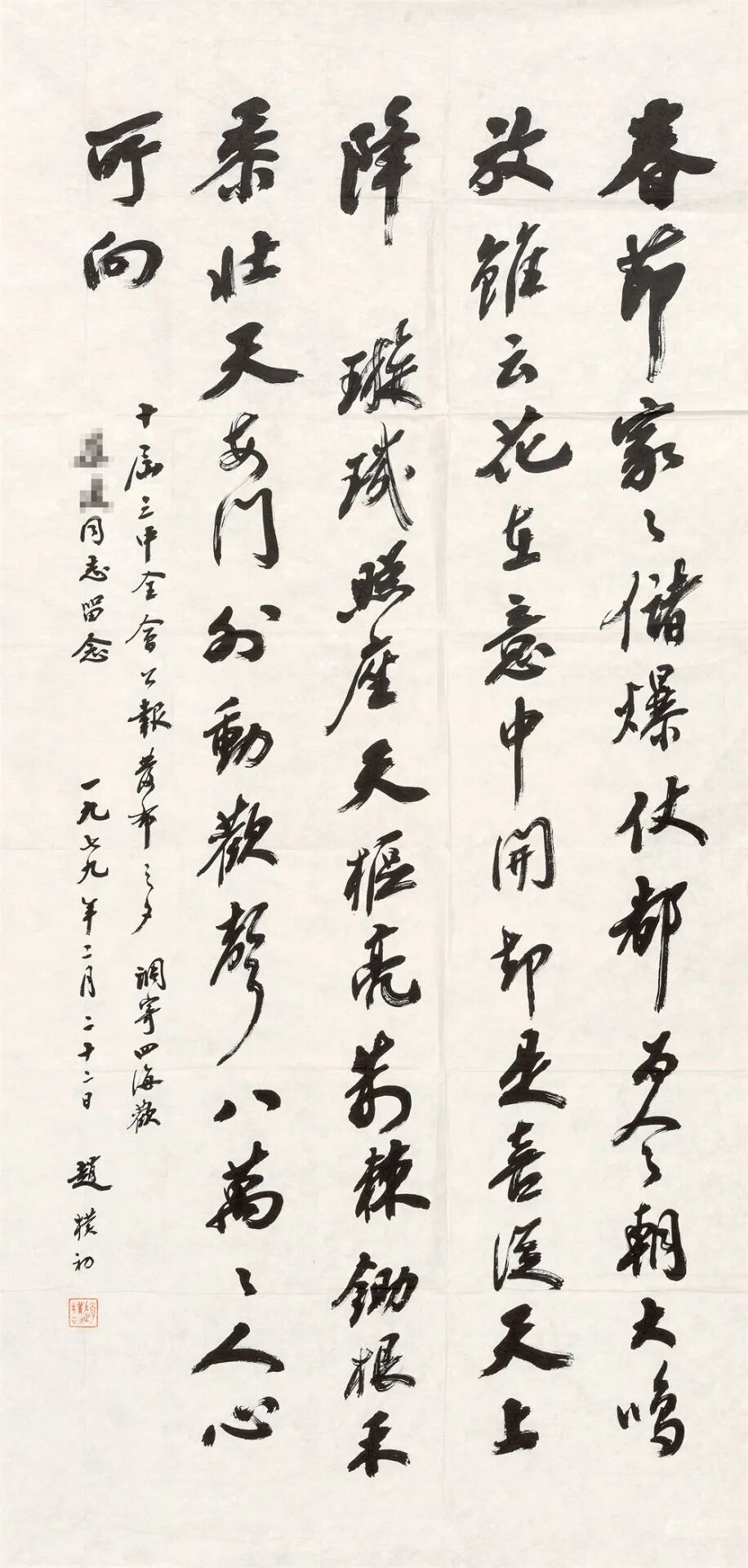 款识:春节家家储爆仗,都为今朝大鸣放。虽云花在意中开,却是喜从天上降。璇玑照座天枢亮,荆棘锄根禾黍壮。天安门外动欢声,八万万人心所向。十届三中全会公报发布之夕,调寄《四海欢》。□□同志留念,一九七九年二月二十二日,赵朴初。