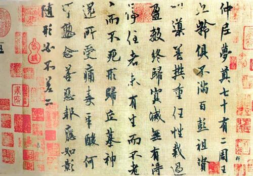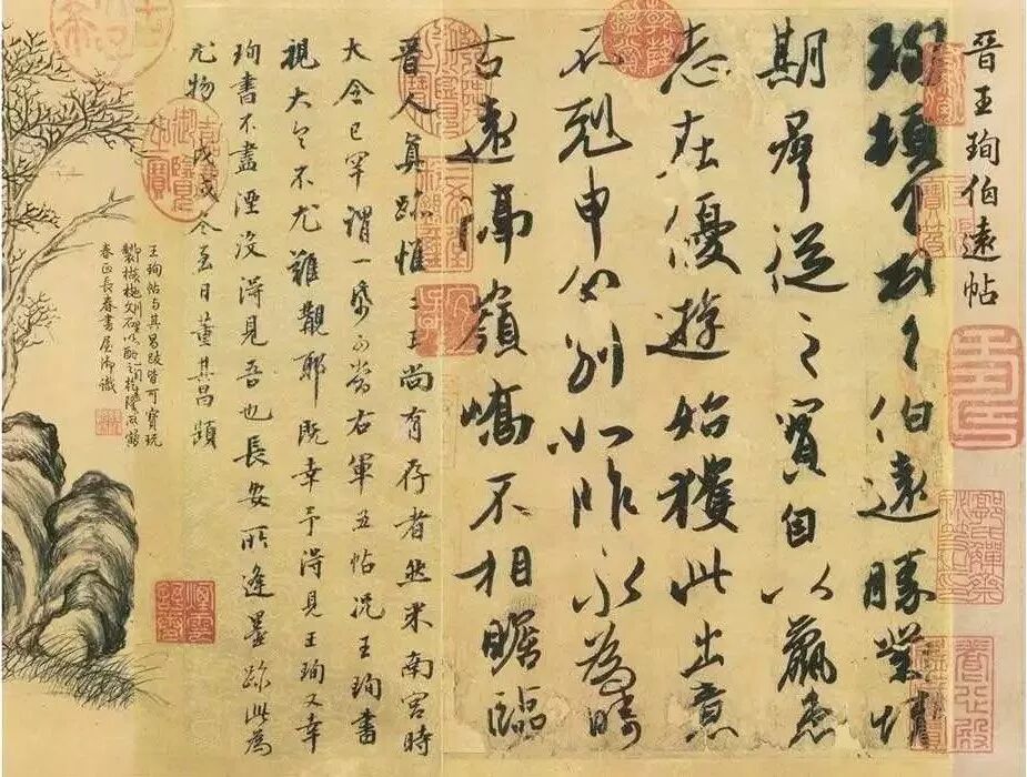 还说乾隆,乾隆在《快雪时晴帖》《游目帖》《七月都下帖》《行穰帖》跋中均用到“龙跳天门,虎卧凤阙”的评语,“龙跳天门,虎卧凤阙”是对王羲之风格的典型描述,反复运用此句,乾隆意在表明其书法以正宗为依托。在品评其他名帖时,乾隆也以正宗观念为参照。如在跋《蒙诏帖》中即提到“险中生态,力变右军”。最能说明乾隆对此推崇的,是一开头说的三希堂,他酷爱王羲之《快雪时晴帖》、王献之《中秋帖》和王珣《伯远帖》三帖,就把古代法帖都找来,刻印成册分赐下臣,这样他的理念也就有了实物对应,对书法时风的引导也更加强有力。