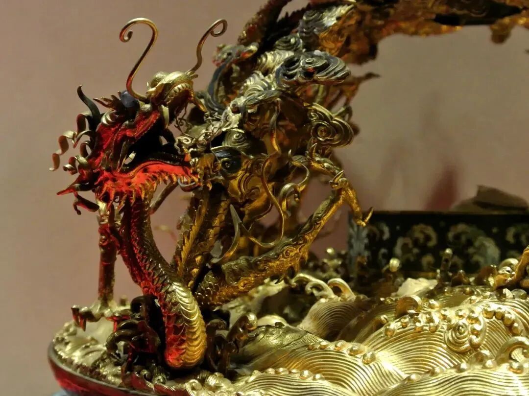 天球仪通体都是黄金做的。先来它的底座部分,纹路是翻涌着的海浪。目光往上,有九条龙裹浪盘绕,它们通力擎住了一个大球。
