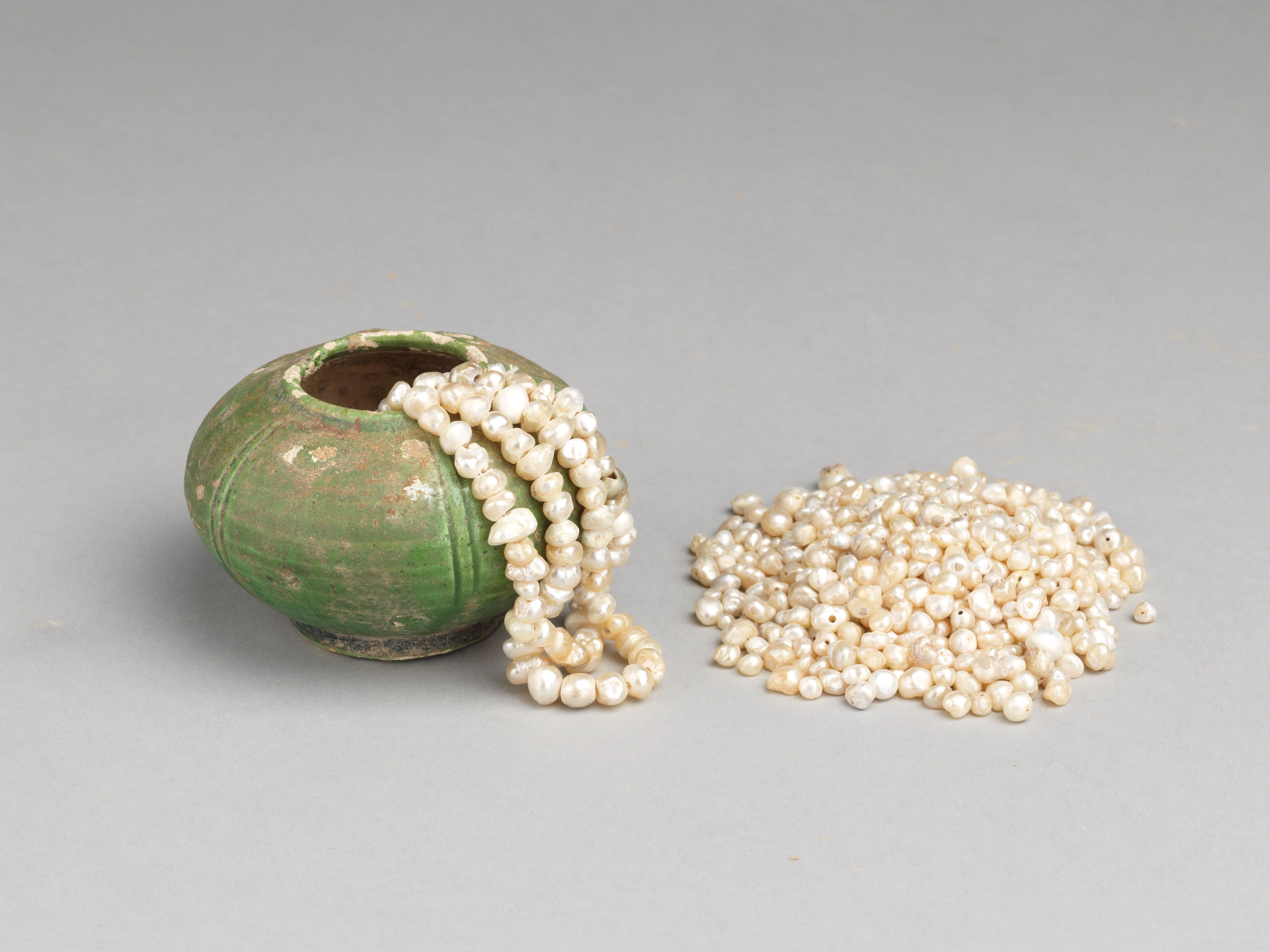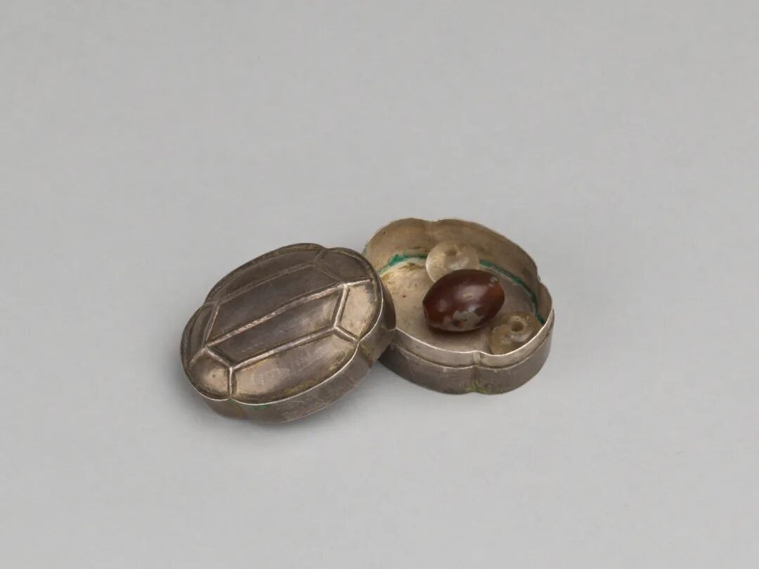 据《明皇杂录》所载,武则天曾把诸位皇孙召到眼前,让他们嬉戏玩闹,“因出西国所贡玉环、钏、杯、盘,列于前后,纵令争取,以观其志”,在其他人抢得不亦乐乎的时候,只有年幼的李隆基端坐不动,这令武则天大为惊奇,摸着他的背说:“此儿当为太平天子。”当然,就唐玄宗登基后的作为来看,开元盛世既成,他便日益沉沦于奢靡享乐,当初在武则天座前的表现,或许不过是为应对这个让自己母亲死得不明不白的祖母,所表现出的必然的警惕与慎重罢了。(唐)海棠形龟纹小银盒,内装水晶珠两颗、褐色橄榄形玛瑙珠一颗,西安博物院藏外来的珍宝,陌生而珍罕之物,很难不引起遐想。唐代传奇中有《李章武传》一则,讲述了李章武与王氏至死不渝的爱情。李章武博学聪颖,且一表人才,他来华州拜访好友崔信时,偶遇王氏,一见钟情,两人的感情迅速升温,如胶似漆,但李章武不可能在华州久住,两人分别时,李章武赠予王氏一匹交颈鸳鸯细绫,王氏则回以白玉环一枚。然而两人分别两三年后,王氏染病而亡,死前仍牵挂对李章武的爱恋。李章武则是八九年后才又回到华州,从王氏邻人口中得知真相,不胜唏嘘,但因他回到此地并打开了王家的门,王氏的魂魄便从冥界前来与他相会。两人欢好如初,却敌不过阴阳相隔的事实,王氏再度离去时,又取出一件宝物送给李章武。那宝物深青透红,质地坚硬,形似叶片,像玉却又冰凉,王氏说这是“靺鞨宝”,出自昆仑山顶,是极难得的宝贝,是她与玉京夫人游玩时得到的赠礼,现将此转赠李章武,既为情意,也敬其博学又崇奉道教。李章武以一白玉簪子回赠,两人分别后,确是天人永隔。王氏所给予的靺鞨宝,寻常玉工见了都不敢雕刻,后来李章武出使大梁,才由一个玉工将之雕成了檞叶的形状。李章武十分珍爱此物,经常将它揣在身上,某日在长安城中偶遇一胡僧,胡僧突然来到他马前叩首就拜,乞求他出示怀中珍宝。于是李章武将他带到僻静处,取出靺鞨宝,胡僧拿到手上把玩了一阵,感慨:“此天上至物,非人间有也。”人鬼相恋的传说,在中国传统中并不罕见,但异域奇珍靺鞨宝与能感应、辨识珍宝的胡僧,让传奇横添了不同寻常的魅力,作为那个时代独特亮色的冰山一角。正如普鲁斯特在《斯旺的道路》的“序幕”中所说:“历史隐藏在智力所能企及的范围以外的地方,隐藏在我们无法猜度的物质客体之中。”所以无论是瑰奇的幻想还是现实的方方面面,彻底融入大唐的“胡”,与这个伟大的时代一起,共同成就了彼此的传奇。[1]向达. 唐代长安与西域文明[M]. 河北教育出版社, 2001.[2]薛爱华. 撒马尔罕的金桃唐代舶来品研究[M]. 社科文献, 2016.