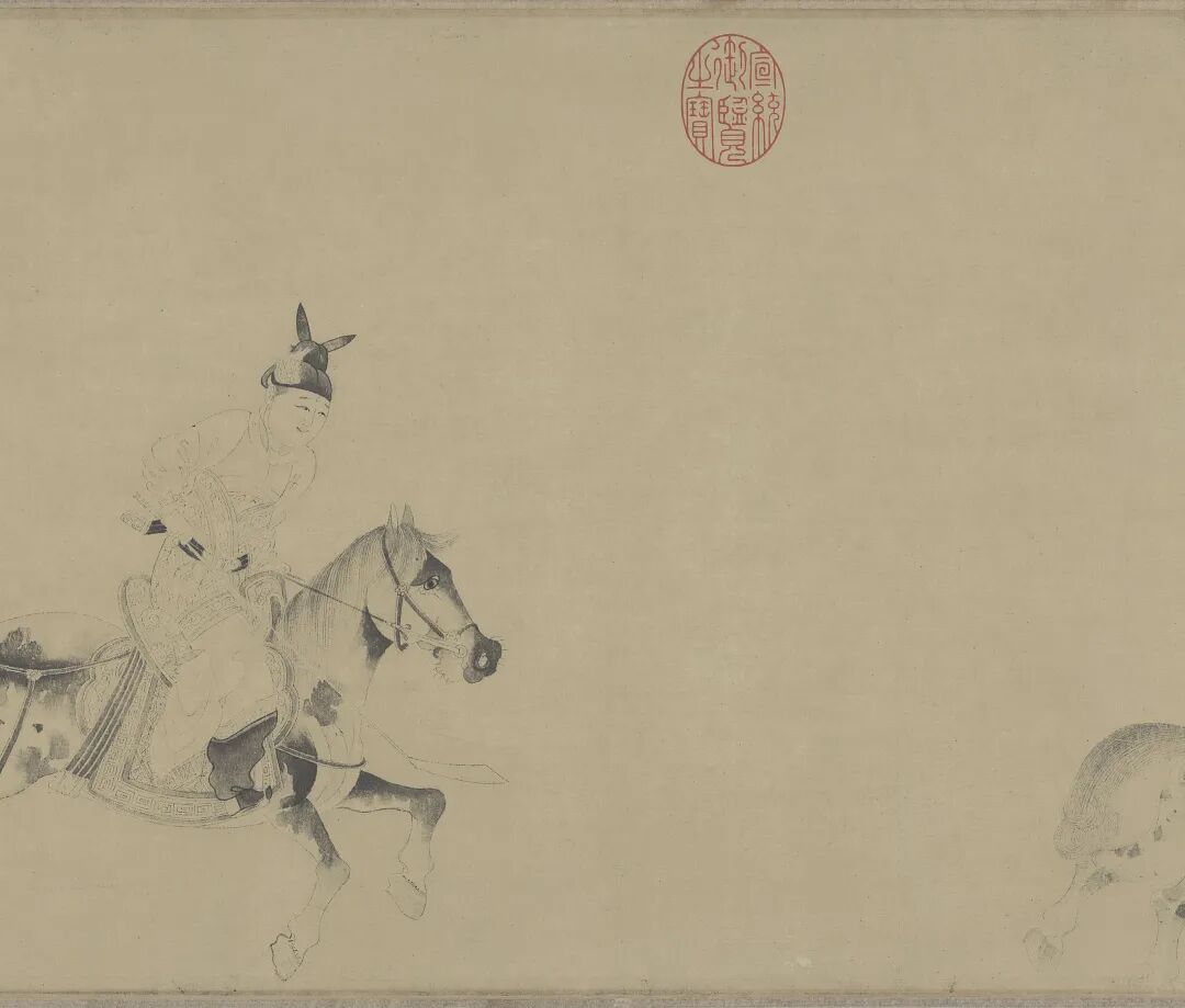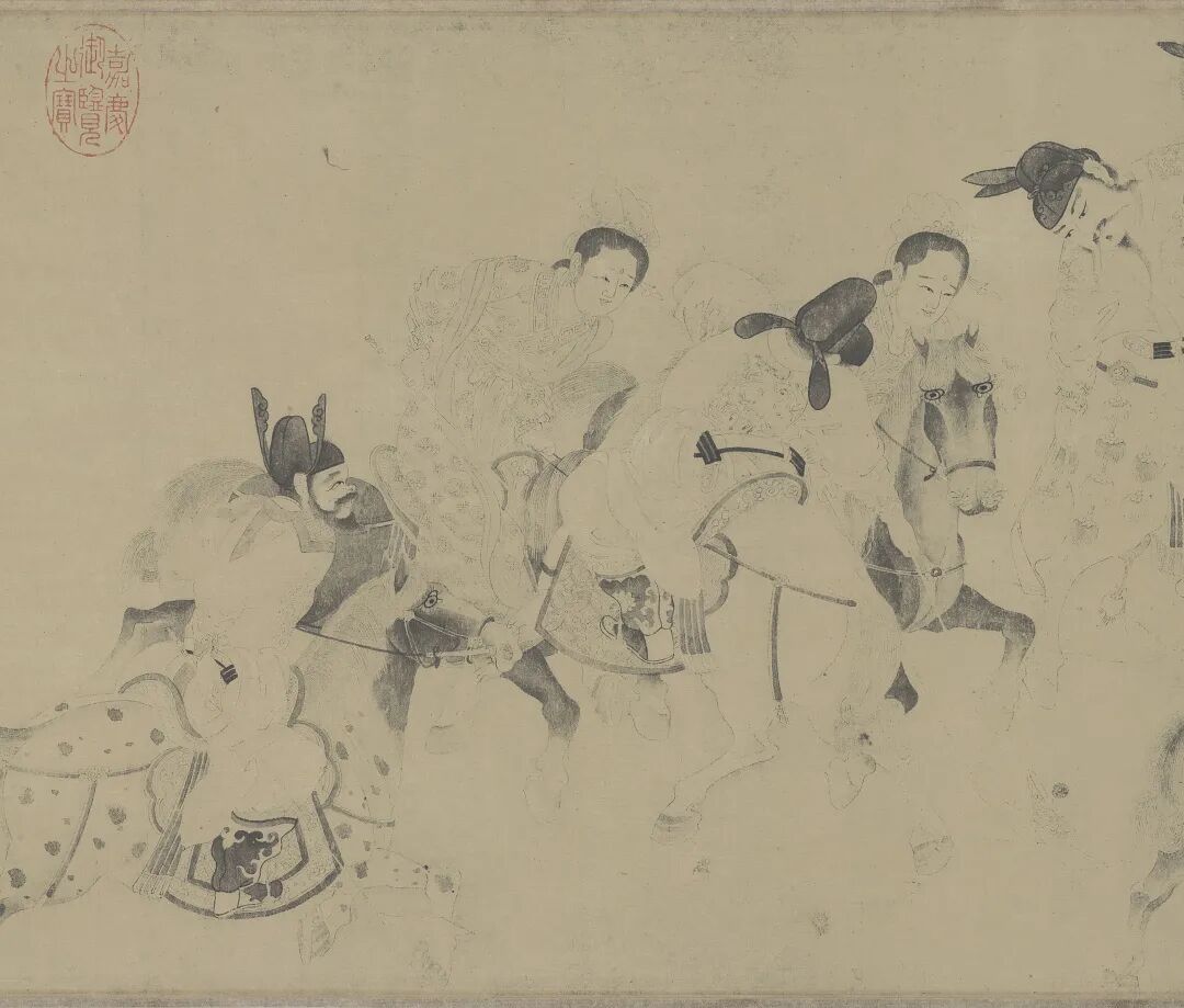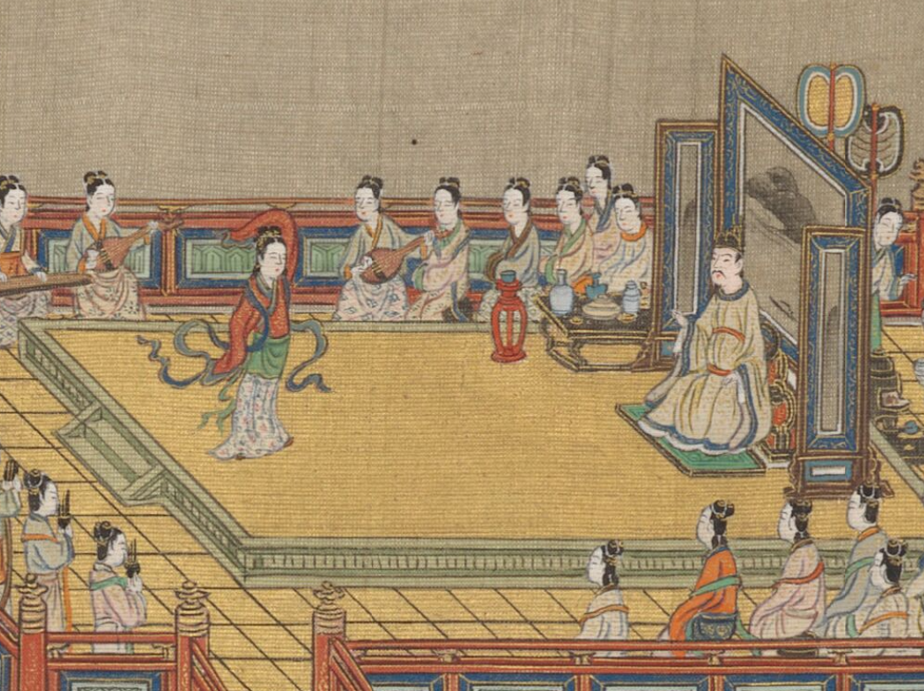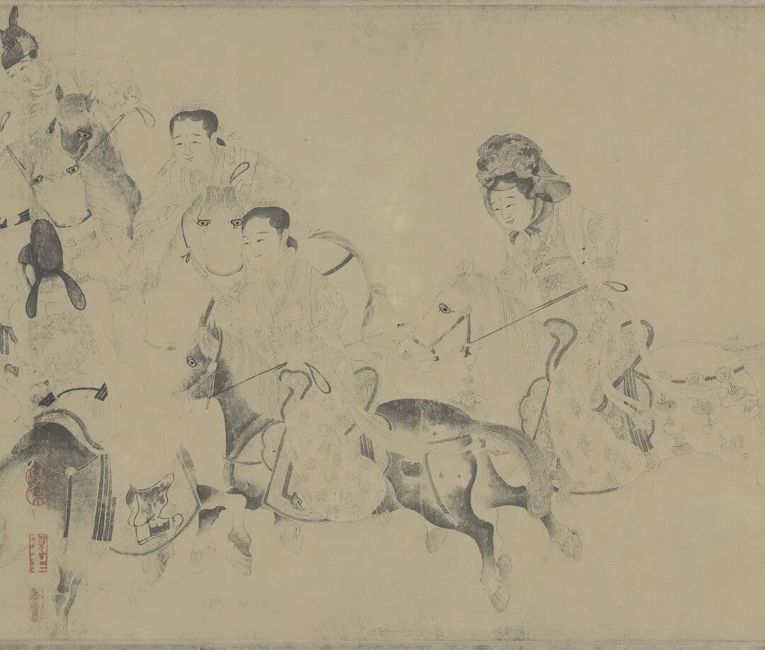 据传,唐太宗时,西域某国进献一位胡人乐师,他善弹琵琶,“作一曲,琵琶弦拨倍粗”,但唐太宗不想让在胡人面前露下风,于是摆下一场酒宴,让胡人乐师演奏的同时,令琵琶名手罗黑黑隔着帘子听。罗黑黑只听了一遍就学会了。唐太宗就得意地像胡人夸耀:“吾宫人能之。”再命令罗黑黑在帘后用大琵琶弹奏胡人的曲目,果然罗黑黑完美重现,与胡人的乐谱相比一节不差,这让胡人乐师大受震撼,以为大唐宫中的无名宫女就有远胜过自己的才能,可见大唐国力之强,人才之丰,他惊叹之余辞官离去,而“西国闻之,降者数十国”。实际上罗黑黑并不是宫女,而是“太宗阉为给使,使教宫人”,也就是说罗黑黑是个有音乐才能的宦官。这个故事或许反映了被尊为“天可汗”的唐太宗在“胡”这回事上的些许矛盾心态——盛唐的皇亲贵戚乃至围绕在他们身边的整个上层阶级对胡风大体上喜闻乐见,但在特定的场合还是希望让己方占据上风。发源于波斯的波罗毬,为一种马上击球的竞技游戏,自东向西传入土耳其,再由土耳其传入中国、印度。唐朝将这种游戏称作打毬或击鞠,与汉魏以来就有的蹴踘相区别。唐中宗年间,吐蕃遣使迎娶金城公主,中宗特地邀请使臣于梨园亭中观赏打毬表演,吐蕃赞咄提出吐蕃使团中有擅长打毬的人,希望能与唐朝的打毬队比一比,没想到几轮下来,吐蕃队大获全胜。便是友谊赛,东道主的面子也有点挂不住了,于是当时还是临淄王的李隆基自请出阵,率领自己临时组起的打毬队上场,只见“玄宗东西驱突,风回电激,所向无前,吐蕃功不获施”,一举逆转战局,尽显大唐国威。即位后,唐玄宗仍不忘以音律毬马奖励臣工,开元盛世之下,有帝王倡导,胡风更盛。所谓胡乐胡舞,其实早就不只是民间的流行。唐中宗爱女安乐公主的驸马武崇训,有一个堂弟武延秀,“久在蕃中,解突厥语”,他常在上流聚会上唱突厥歌,或跳起胡旋舞,这样的风姿让安乐公主深为倾倒。武崇训被杀后,安乐公主顺势就主动要求嫁给武延秀。而唐玄宗对杨贵妃的宠爱,也并不只因杨贵妃的绝色容颜,还因他们志趣相投,在音乐歌舞方面都有着共同的爱好和水准。著名的《霓裳羽衣舞》,原曲来自河西节度使杨敬述所献的《婆罗门曲》,观其名便可知当是西来之物,因他们的喜好如此,当时“太常乐尚胡曲”,无论雅俗,胡乐的影响都可见一斑。(十七世纪)日本 狩野山雪《长恨歌图卷·上卷》(局部)上行下效,就连文人学士也爱打毬,更能鉴赏乐舞——相比后世给人留下“手无缚鸡之力”的弱质书生,唐代文士大多身强体健,甚至文武双全。唐代进士及第后,于慈恩寺题名,新进士按例会在曲江参加“曲江关宴”,游赏痛饮之余,还会在月灯阁集会打毬,从状元到进士皆可下场,“战况”同样激烈,“时阁下数千人,因之大呼笑,久而方止”。他们往往四海交游,纵情恣意,因此也与胡人多有来往。(唐) 李昭道[传]《曲江图轴》,台北故宫博物院藏