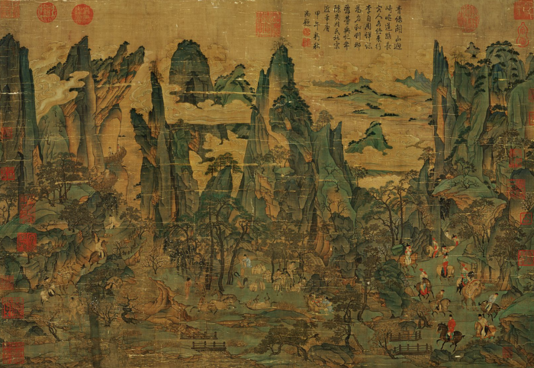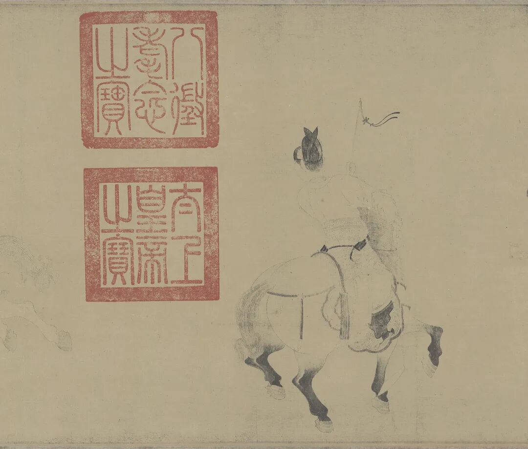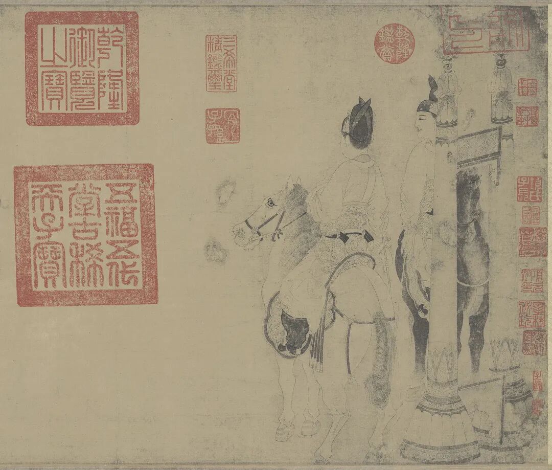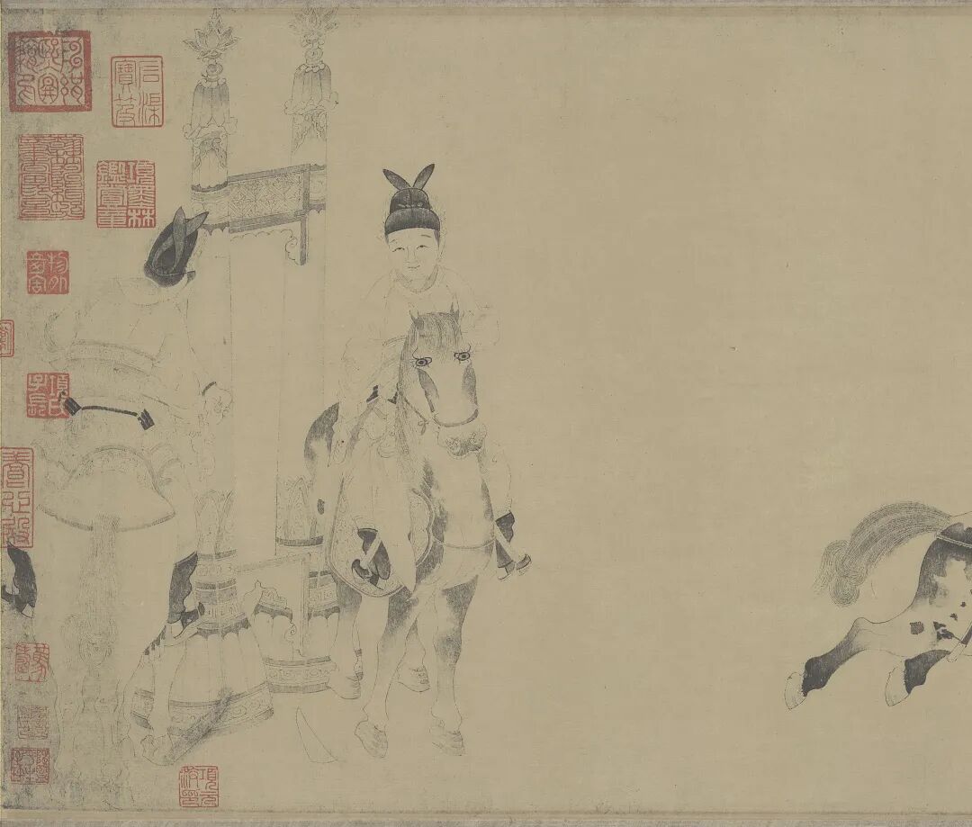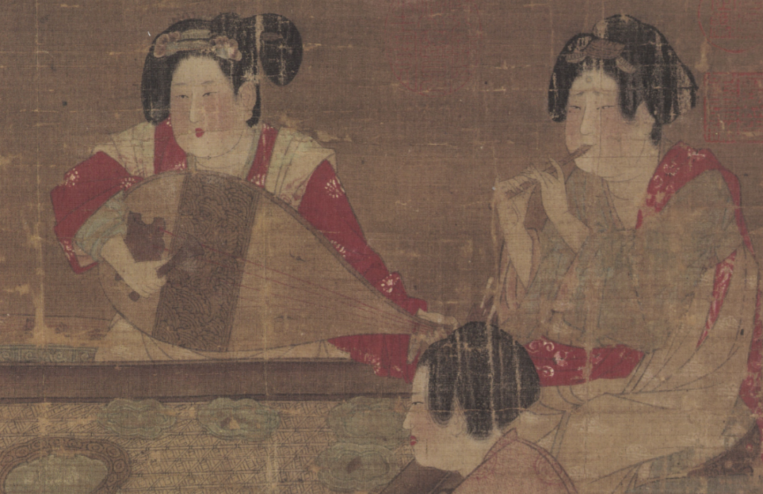 据传,唐太宗时,西域某国进献一位胡人乐师,他善弹琵琶,“作一曲,琵琶弦拨倍粗”,但唐太宗不想让在胡人面前露下风,于是摆下一场酒宴,让胡人乐师演奏的同时,令琵琶名手罗黑黑隔着帘子听。罗黑黑只听了一遍就学会了。唐太宗就得意地像胡人夸耀:“吾宫人能之。”再命令罗黑黑在帘后用大琵琶弹奏胡人的曲目,果然罗黑黑完美重现,与胡人的乐谱相比一节不差,这让胡人乐师大受震撼,以为大唐宫中的无名宫女就有远胜过自己的才能,可见大唐国力之强,人才之丰,他惊叹之余辞官离去,而“西国闻之,降者数十国”。实际上罗黑黑并不是宫女,而是“太宗阉为给使,使教宫人”,也就是说罗黑黑是个有音乐才能的宦官。这个故事或许反映了被尊为“天可汗”的唐太宗在“胡”这回事上的些许矛盾心态——盛唐的皇亲贵戚乃至围绕在他们身边的整个上层阶级对胡风大体上喜闻乐见,但在特定的场合还是希望让己方占据上风。发源于波斯的波罗毬,为一种马上击球的竞技游戏,自东向西传入土耳其,再由土耳其传入中国、印度。唐朝将这种游戏称作打毬或击鞠,与汉魏以来就有的蹴踘相区别。唐中宗年间,吐蕃遣使迎娶金城公主,中宗特地邀请使臣于梨园亭中观赏打毬表演,吐蕃赞咄提出吐蕃使团中有擅长打毬的人,希望能与唐朝的打毬队比一比,没想到几轮下来,吐蕃队大获全胜。便是友谊赛,东道主的面子也有点挂不住了,于是当时还是临淄王的李隆基自请出阵,率领自己临时组起的打毬队上场,只见“玄宗东西驱突,风回电激,所向无前,吐蕃功不获施”,一举逆转战局,尽显大唐国威。即位后,唐玄宗仍不忘以音律毬马奖励臣工,开元盛世之下,有帝王倡导,胡风更盛。所谓胡乐胡舞,其实早就不只是民间的流行。唐中宗爱女安乐公主的驸马武崇训,有一个堂弟武延秀,“久在蕃中,解突厥语”,他常在上流聚会上唱突厥歌,或跳起胡旋舞,这样的风姿让安乐公主深为倾倒。武崇训被杀后,安乐公主顺势就主动要求嫁给武延秀。而唐玄宗对杨贵妃的宠爱,也并不只因杨贵妃的绝色容颜,还因他们志趣相投,在音乐歌舞方面都有着共同的爱好和水准。著名的《霓裳羽衣舞》,原曲来自河西节度使杨敬述所献的《婆罗门曲》,观其名便可知当是西来之物,因他们的喜好如此,当时“太常乐尚胡曲”,无论雅俗,胡乐的影响都可见一斑。(十七世纪)日本 狩野山雪《长恨歌图卷·上卷》(局部)上行下效,就连文人学士也爱打毬,更能鉴赏乐舞——相比后世给人留下“手无缚鸡之力”的弱质书生,唐代文士大多身强体健,甚至文武双全。唐代进士及第后,于慈恩寺题名,新进士按例会在曲江参加“曲江关宴”,游赏痛饮之余,还会在月灯阁集会打毬,从状元到进士皆可下场,“战况”同样激烈,“时阁下数千人,因之大呼笑,久而方止”。他们往往四海交游,纵情恣意,因此也与胡人多有来往。(唐) 李昭道[传]《曲江图轴》,台北故宫博物院藏