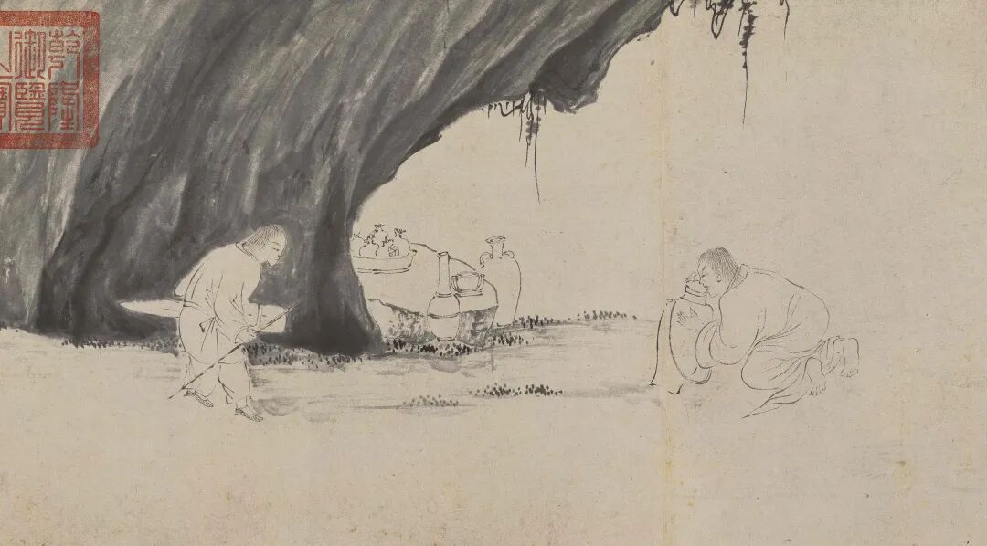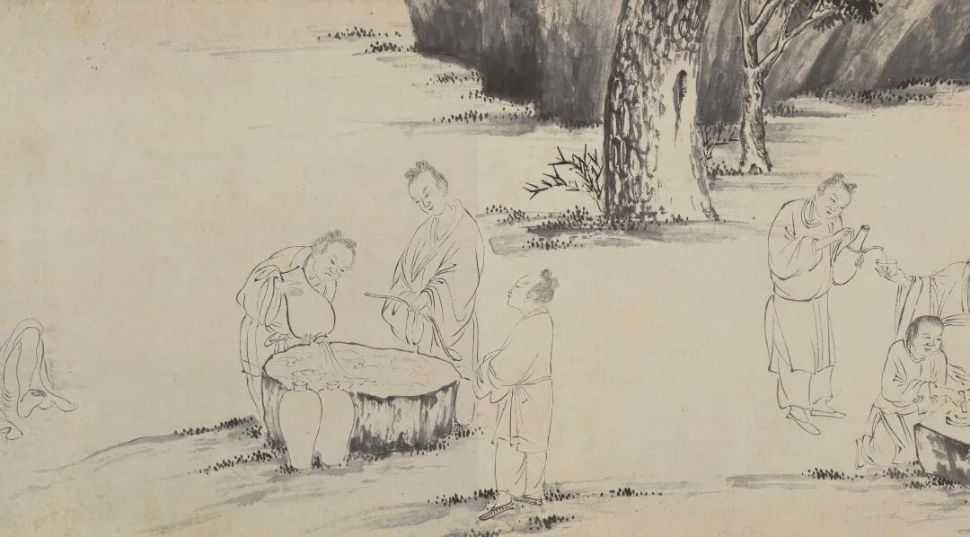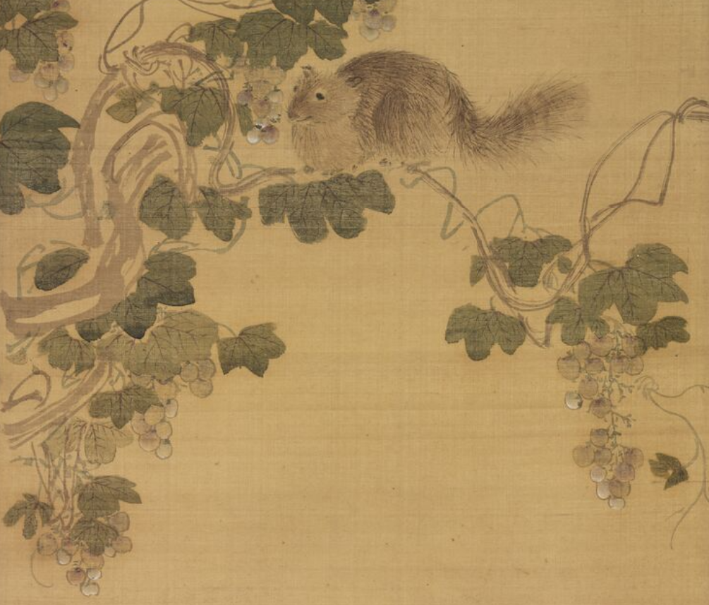 高昌的葡萄酒,波斯的“三勒浆”与“龙膏酒”,都让前来买醉的唐朝人赞不绝口,流连在胡人的酒肆里难以自拔。所谓来自波斯的“三勒浆”,指的是用庵摩勒、毗梨勒、诃梨勒三种果实以波斯独特技法酿出的美酒,至于葡萄酒那就更好懂了,罗马、大食、回鹘等国都以精于栽种葡萄和好饮葡萄酒而闻名。域外美酒的魅力既让唐人倾倒,自然唐人也会想到要仿制生产,最好是不依赖胡商也能尽享。贞观年间,突厥叶护可汗向唐太宗进献了一种紫色葡萄,因其浑长的形状,其名为“马乳葡萄”。(明)周之冕《葡萄松鼠图》(局部),台北故宫博物院藏