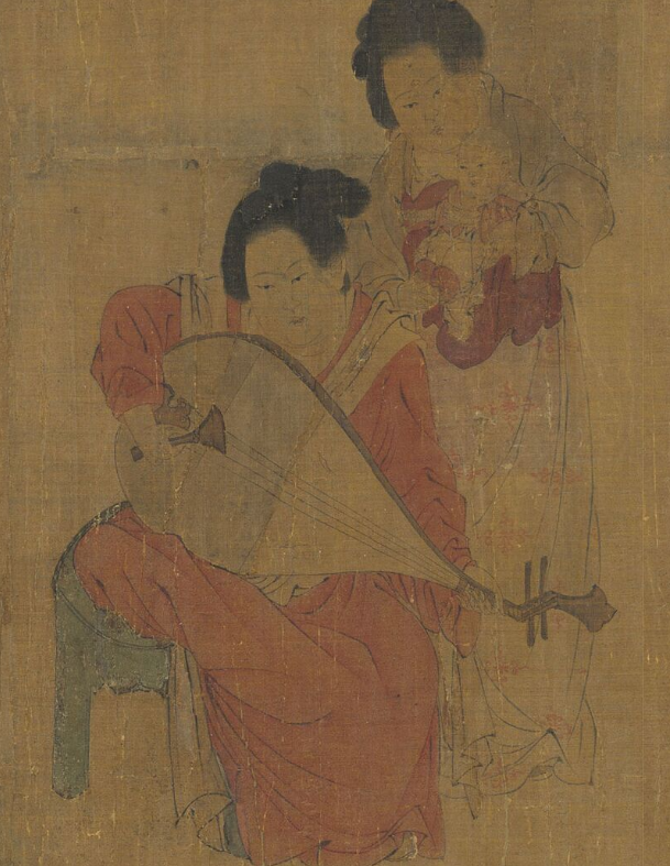 流寓长安的众多胡人中,不乏“昭武九姓”中的佼佼者,他们当中名乐工、名画家不一而足,北齐画家曹仲达便是出身曹国,而唐代擅弹琵琶者更以曹姓名人居多,曹保与其子尤为著名。白居易名作《琵琶行》中擅长弹琵琶又嫁作商人妇的琵琶女,就因曾向“穆、曹二善才”学艺而在年轻貌美、色艺俱佳之时名动京城,“一曲红绡不知数”,另一首《听曹刚琵琶兼示重莲》则云:“拨拨弦弦意不同,胡啼番语两玲珑。谁能截得曹刚手,插向重莲衣袖中。”(唐)周昉[传]《调婴图》(局部),台北故宫博物院藏盛行于唐代的异域舞蹈中,有“软舞”与“健舞”之别,龟兹乐人白明达所创《春莺啭》就是典型的软舞,舞动时风姿婀娜,细腻优雅,但唐代诗人们笔下提到最多的还是健舞。岑参见到胡旋舞时,就曾作诗惊叹:“美人舞如莲花旋,世人有眼应未见。”健舞风格健朗、节奏明快,更有一些中原传统中未曾有过的技法亮点,视觉冲击力不言而喻。当时可与胡旋舞齐名的不多,柘枝舞可算其一,刘禹锡有《观舞柘枝》云:“垂带覆纤腰,安钿当舞眉。”白居易也有《柘枝妓》云:“红蜡烛移桃叶起,紫罗衫动柘枝来。带垂细胯花腰重,帽转金铃雪面回。”说的是柘枝舞妓身碰上红紫五色窄袖罗衫,腰带银蔓垂花,头戴绣花卷檐虚帽,衣帽上皆有金铃为饰,随着急促的舞步,金铃声声作响,“旁收拍拍金铃摆,却踏声声锦袎摧”,观者无不称奇,“实舞中之雅妙者也”。据传安禄山与杨贵妃也都擅长胡旋舞,安禄山作为一个众所周知的大胖子,却能游刃有余地在唐玄宗面前表演胡旋舞,也是一时奇闻,更被唐玄宗视为忠诚的明证。然而,“渔阳鼙鼓动地来,惊破霓裳羽衣曲”,无情的铁骑之下,欢声笑语化作无尽悲鸣,昔年的乐舞也不过是盛世的陪葬。(十七世纪)日本 狩野山雪《长恨歌图卷·上卷》(局部)作为唐代诗人的翘楚之一,白居易的诗风独树一帜,他的名作“一道残阳铺水中,半江瑟瑟半江红”曾引起了争议,因为“瑟瑟”之意实在费解——如果按照此前的习惯将“瑟瑟”解释为发抖、抖动的样子,那这句诗岂不是意为一半的江水在抖动而另一半呈红色,这样既无对仗也无美感,实在不像白居易的手笔。《敦煌廿咏·其九·瑟瑟咏》曰:“瑟瑟焦山下,悠悠采几年。为珠悬宝髻,作璞间金钿。色入青霄里,光浮黑碛边。世人偏重此,谁念楚材贤。”这里的瑟瑟就无论如何更不能解释成动作了,从整体的意思来看,应是一种色如天空的宝石,也就是天青石,可制成贵重的首饰,因此极受世人珍爱。温庭筠更有首诗为《瑟瑟钗》:“翠染冰轻透露光,堕云孙寿有馀香。只因七夕回天浪,添作湘妃泪两行。”所以白居易的名句其实是以天青石之色喻指江水在夕阳之下,一半碧青一半火红的光景。不过,瑟瑟是极珍稀贵重的宝石,不独唐人喜爱,在吐蕃、南诏都被视作价值连城之宝。“吐蕃男子冠中国帽,妇人辫发,戴瑟瑟珠,云珠之好者,一珠易一良马。”南诏贵妇也爱将瑟瑟、珠贝、琥珀做成华丽的头饰,南诏王向唐朝进贡的贡品中就有瑟瑟与琥珀。这样的宝贝自然不会被浪费,杨贵妃盛宠之时,她与唐玄宗沐浴的温泉中就有一整块瑟瑟雕成的假山为饰——“上皇初解云衣浴,珠棹时敲瑟瑟山”。杨贵妃的姐姐虢国夫人沾妹妹的光也过上极奢侈的生活,为建一所豪宅,“中堂既成,召匠圬墁,授二百万偿其值,而复以金盏瑟瑟三斗为赏”。拥有多少瑟瑟,也足以成为衡量达官贵人所据有财富的标准之一。中国自古物产丰饶,但在宝石一类上并无丰厚储备,因此外来的资源十分珍贵,这也是丝绸之路上最重要的贸易之一,更是唐朝与其他国家外交往来上的重要一环。康国和吐火罗国向唐朝进献过光玉髓,诃陵国进献过玳瑁和生犀,渤海国与日本都献过玛瑙,只在天宝八年到九年间,林邑国就贡献了“真珠一百条”,波斯鬼国也献出“无孔真珠”。