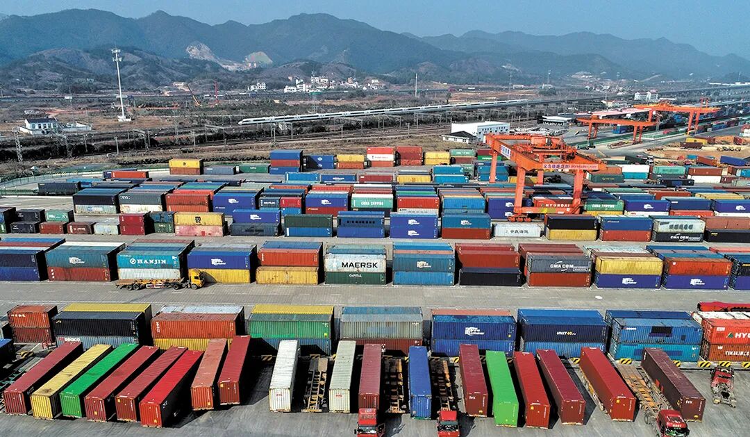 义乌铁路口岸等待装载中欧班列出口的集装箱堆满了货场