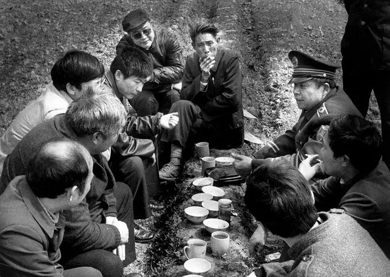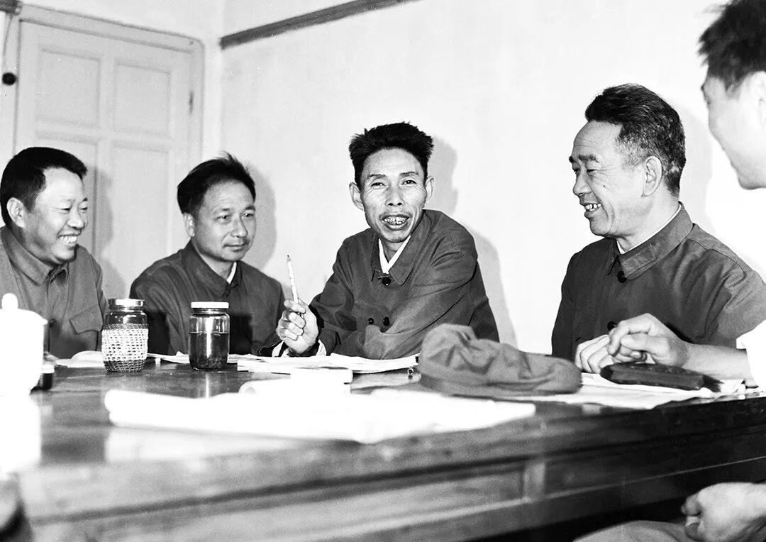 1982年6月,时任义乌县委书记的谢高华(中)和同事们在县委常委会议上探讨开放稠城镇小百货市场
