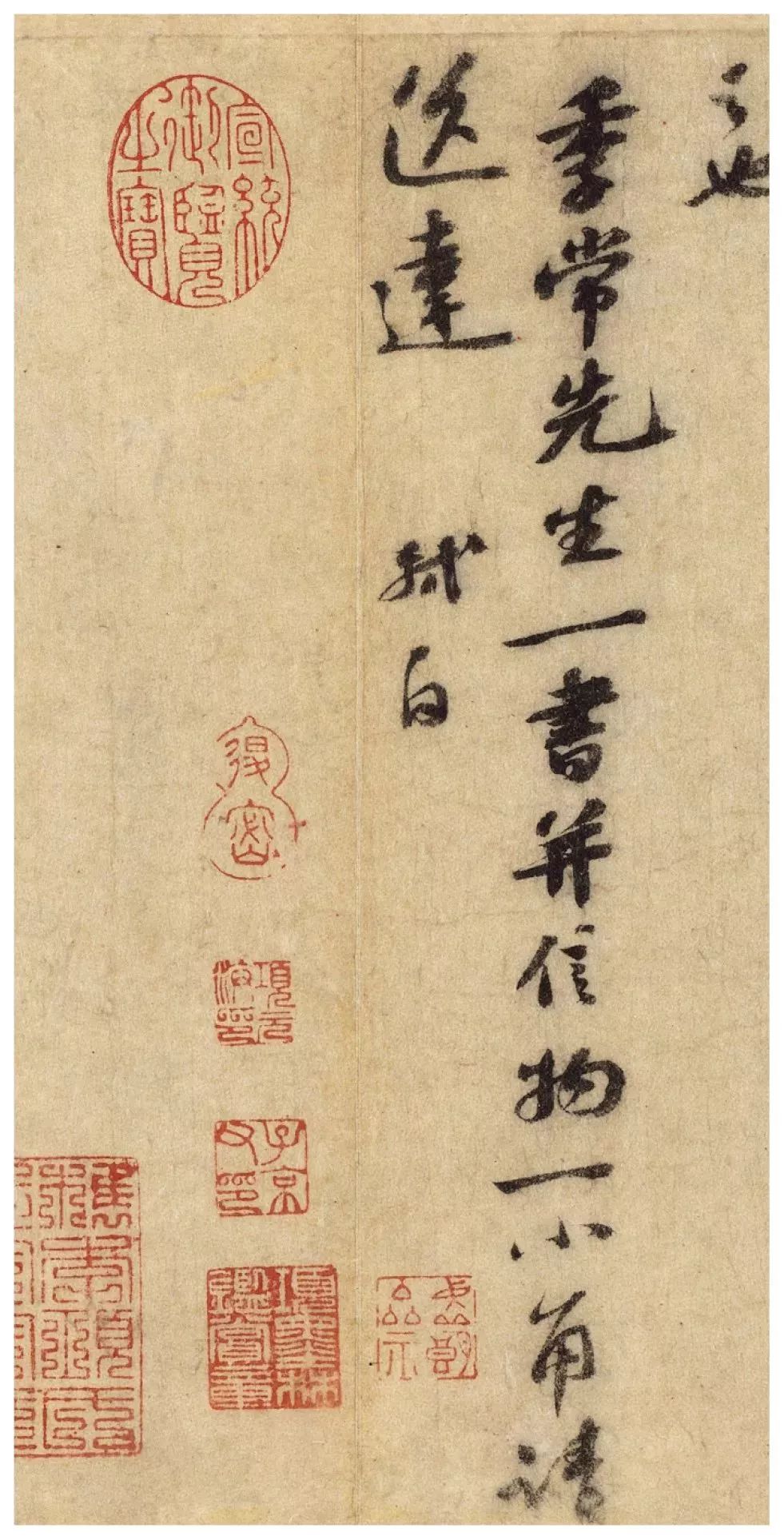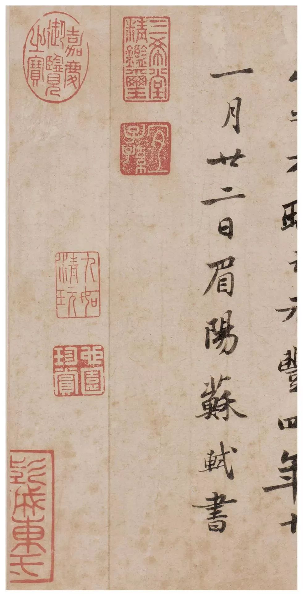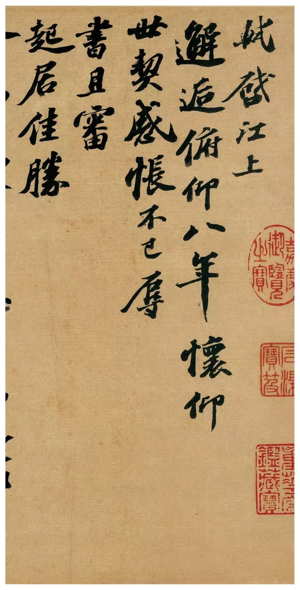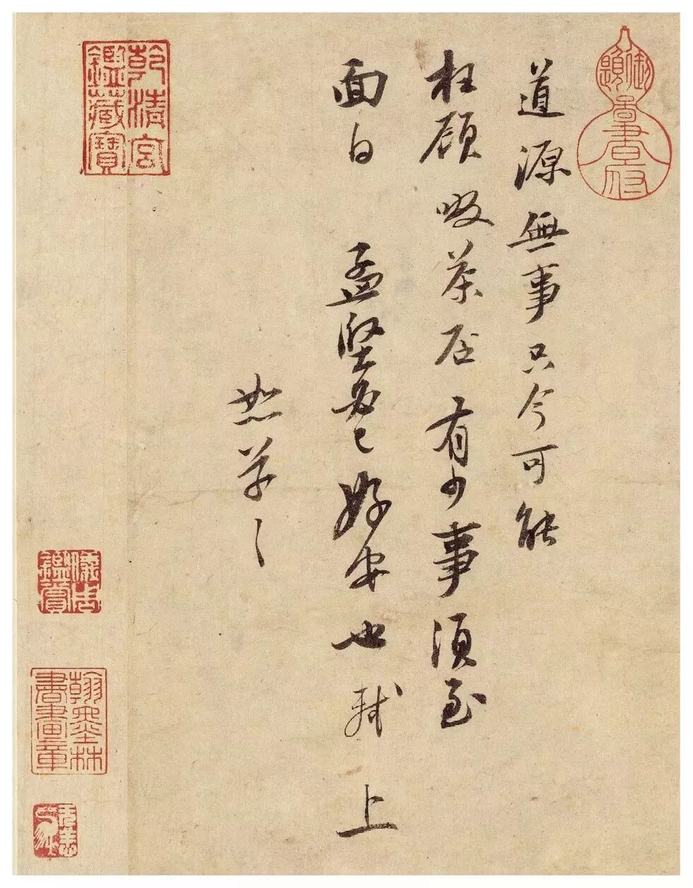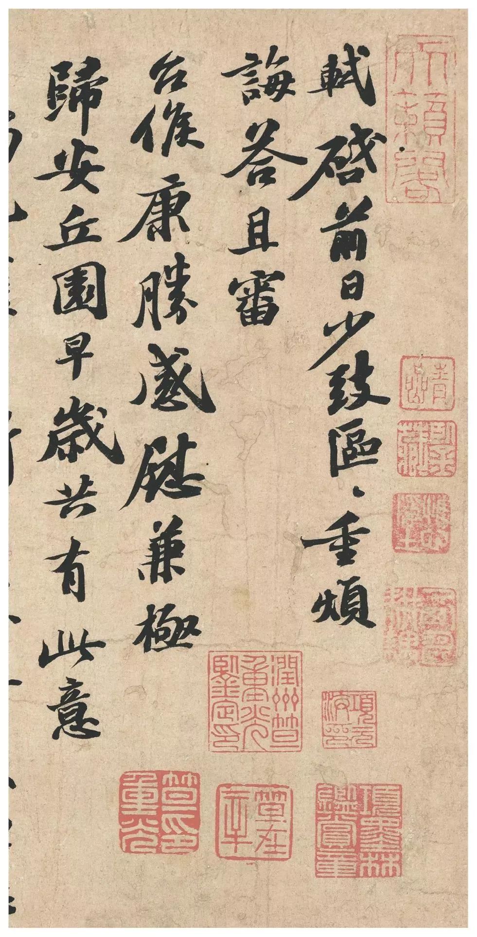 (北宋)苏轼 渡海帖 传世第三大行书苏轼《黄州寒食诗帖》 苏轼《黄州寒食帖》原帖图 大名鼎鼎的苏轼《赤壁赋》 传说为苏轼所作的《归去来兮辞》 更多的则是各类尺牍, 从1065年,苏轼30岁时所书的《宝月帖》, 到1101年,苏轼66岁时所书的《江上帖》, 时间跨度36年,在这36年间的近三十件尺牍中, 我们可以看到苏轼书风的发展演变, 从早年的用笔精到, 到老来的渐近自然, 每一件信札尺牍,都各具姿态,神采飞扬, 在有法、无法之间。 书于治平二年(1065) 大人令致恳。为催了礼书,事冗,未及上问。昨日得宝月书,书背承批问也。令子监簿必安胜,未及修染。轼顿首。 书于1071年(熙宁四年) 轼启。适辱教不果。即答悚悚。晚来尊体佳安。惠贶临安香合极佳妙。领意之厚。敢不捧当。但深感怍也。谨奉启。上谢不宣。轼再拜。运句太博阁下。十六日。 书于熙宁四年(1071) 轼启。辱教。具审孝履支持,承来日遂行,适请数客,未得走别。来晨如不甚早发,当诣见次。梅君书写未及,非久差人去也。李六丈近遣人赉书去,且为致恳。酒两壶,以饮从者而已。不宣,轼再拜。至孝廷平郭君。三日。 书于元丰元年(1078) 轼启。辱书,承法体安隐,甚慰想念。北游五年,尘垢所蒙,已化为俗吏矣。不知林下高人犹复不忘耶!未由会见,万万自重。不宣。轼顿首,坐主久上人。五月廿二日。 君不见诗人借车无可载。留得一钱何足赖。晚年更似杜陵翁。右臂虽存耳先聩。人将蚁动作牛鬪。我觉风雷真一噫。闻尘扫尽根性空。不须更枕清流派。大朴初散失混沌。六凿相攘更胜坏。眼花乱坠酒生风。口业不停诗有债。君知五蕴皆是贼。人生一病今先差。但恐此心终未了。不见不闻还是碍。今君疑我特佯聋。故作嘲诗穷险怪。须防额痒出三耳。莫放笔端风雨快。次韵秦太虚见戏耳聋。 书于1080年(元丰三年) 京酒一壶送上。孟坚近晚,必更佳。轼上道源兄,十四日。 书于元丰三年(1080) 道源事,只今可能枉顾啜茶否?有少事须至面白,孟坚必已好安也。轼上,恕草草。 书于元丰四年(1081) 故三司副使吏部陈公,轼不及见其人。然少时所识一时名卿胜士,多推尊之。尔来前辈凋丧略尽,能称诵公者,渐不复见。得其理言遗事,皆当记录宝藏,况其文章乎?公孙师仲,录公之诗廿五篇以示,轼三复太息,以想见公之大略云。元丰四年十一月廿二日,眉阳苏轼书。