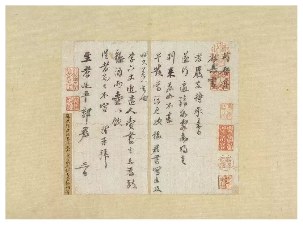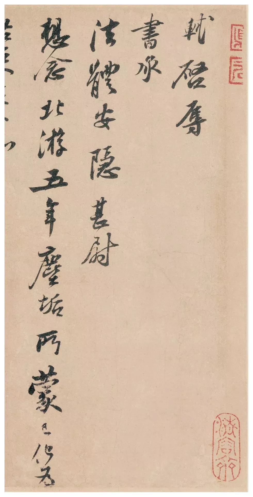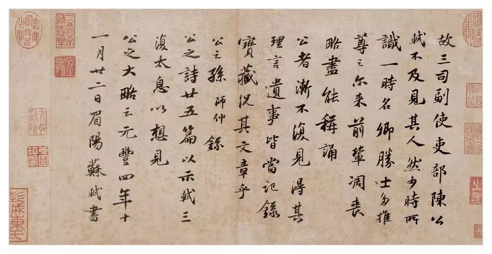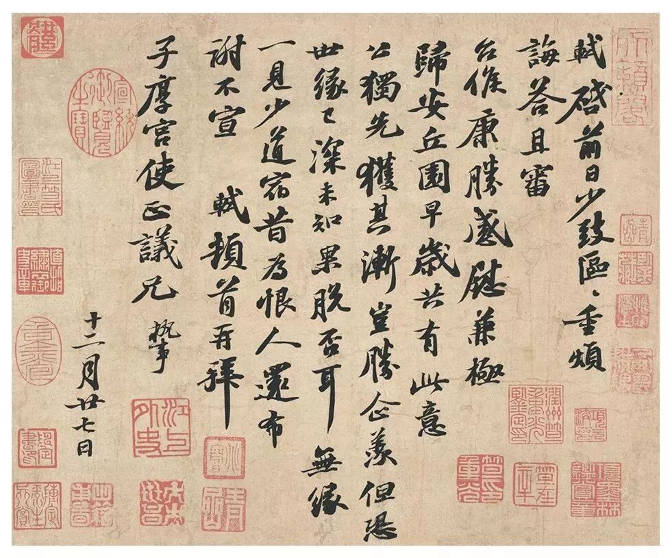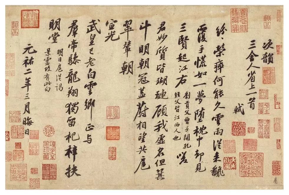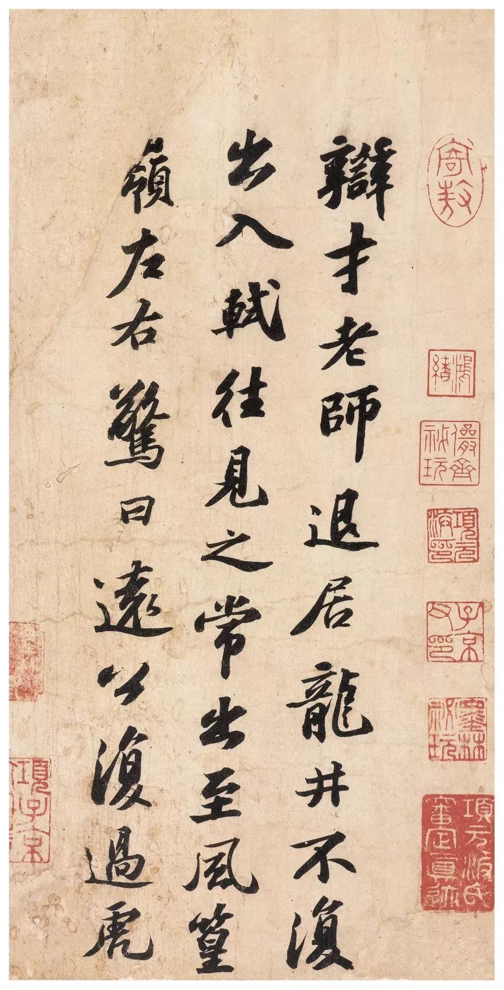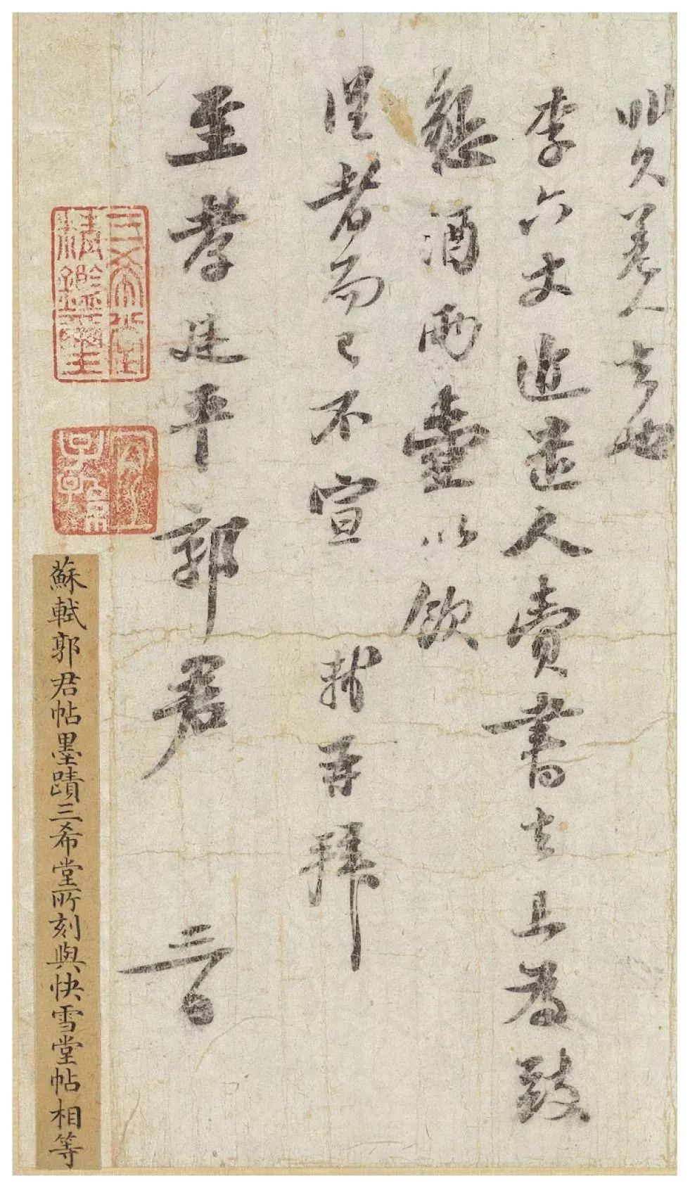 (北宋)苏轼 渡海帖 传世第三大行书苏轼《黄州寒食诗帖》 苏轼《黄州寒食帖》原帖图 大名鼎鼎的苏轼《赤壁赋》 传说为苏轼所作的《归去来兮辞》 更多的则是各类尺牍, 从1065年,苏轼30岁时所书的《宝月帖》, 到1101年,苏轼66岁时所书的《江上帖》, 时间跨度36年,在这36年间的近三十件尺牍中, 我们可以看到苏轼书风的发展演变, 从早年的用笔精到, 到老来的渐近自然, 每一件信札尺牍,都各具姿态,神采飞扬, 在有法、无法之间。 书于治平二年(1065) 大人令致恳。为催了礼书,事冗,未及上问。昨日得宝月书,书背承批问也。令子监簿必安胜,未及修染。轼顿首。 书于1071年(熙宁四年) 轼启。适辱教不果。即答悚悚。晚来尊体佳安。惠贶临安香合极佳妙。领意之厚。敢不捧当。但深感怍也。谨奉启。上谢不宣。轼再拜。运句太博阁下。十六日。 书于熙宁四年(1071) 轼启。辱教。具审孝履支持,承来日遂行,适请数客,未得走别。来晨如不甚早发,当诣见次。梅君书写未及,非久差人去也。李六丈近遣人赉书去,且为致恳。酒两壶,以饮从者而已。不宣,轼再拜。至孝廷平郭君。三日。 书于元丰元年(1078) 轼启。辱书,承法体安隐,甚慰想念。北游五年,尘垢所蒙,已化为俗吏矣。不知林下高人犹复不忘耶!未由会见,万万自重。不宣。轼顿首,坐主久上人。五月廿二日。 君不见诗人借车无可载。留得一钱何足赖。晚年更似杜陵翁。右臂虽存耳先聩。人将蚁动作牛鬪。我觉风雷真一噫。闻尘扫尽根性空。不须更枕清流派。大朴初散失混沌。六凿相攘更胜坏。眼花乱坠酒生风。口业不停诗有债。君知五蕴皆是贼。人生一病今先差。但恐此心终未了。不见不闻还是碍。今君疑我特佯聋。故作嘲诗穷险怪。须防额痒出三耳。莫放笔端风雨快。次韵秦太虚见戏耳聋。 书于1080年(元丰三年) 京酒一壶送上。孟坚近晚,必更佳。轼上道源兄,十四日。 书于元丰三年(1080) 道源事,只今可能枉顾啜茶否?有少事须至面白,孟坚必已好安也。轼上,恕草草。 书于元丰四年(1081) 故三司副使吏部陈公,轼不及见其人。然少时所识一时名卿胜士,多推尊之。尔来前辈凋丧略尽,能称诵公者,渐不复见。得其理言遗事,皆当记录宝藏,况其文章乎?公孙师仲,录公之诗廿五篇以示,轼三复太息,以想见公之大略云。元丰四年十一月廿二日,眉阳苏轼书。