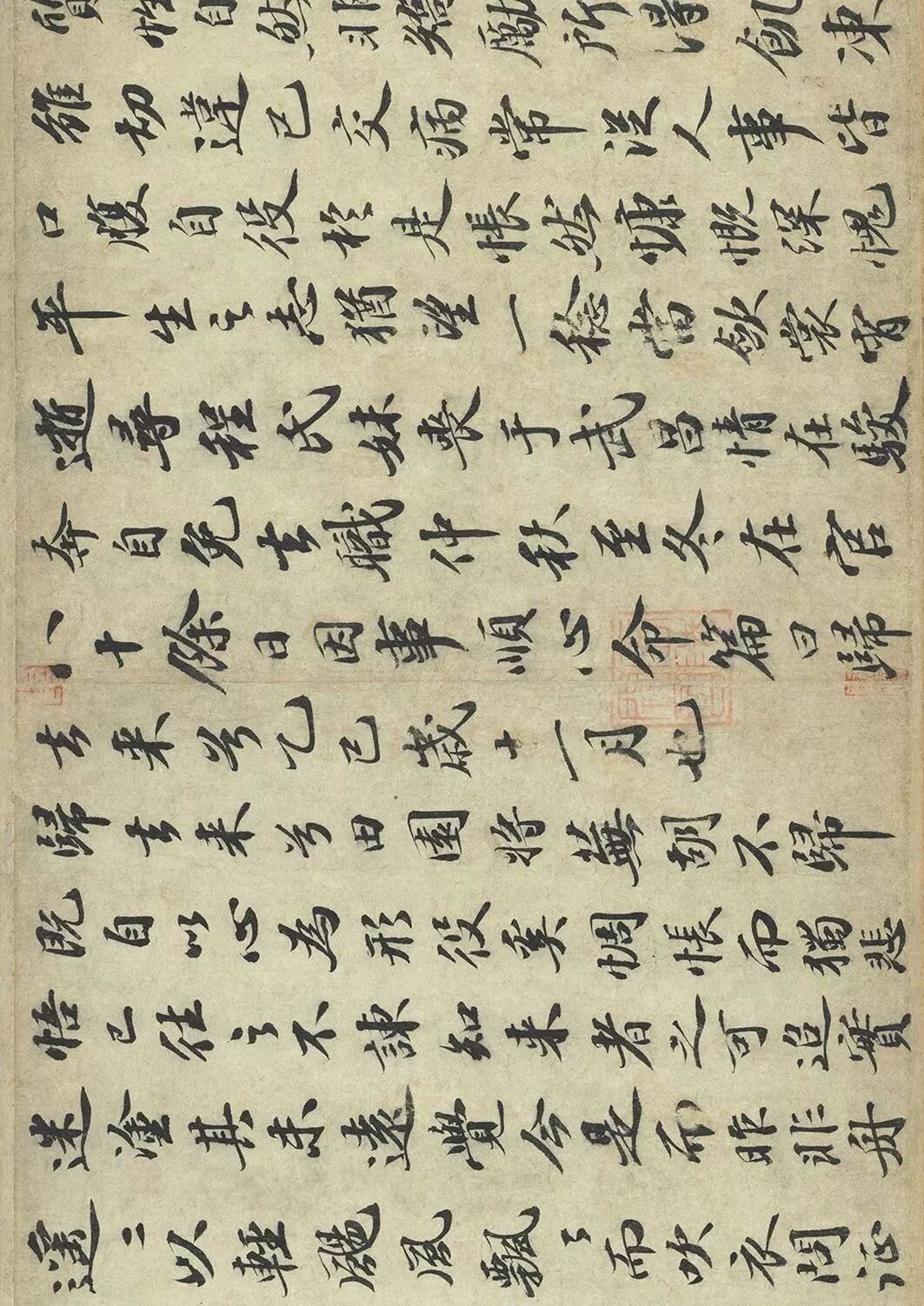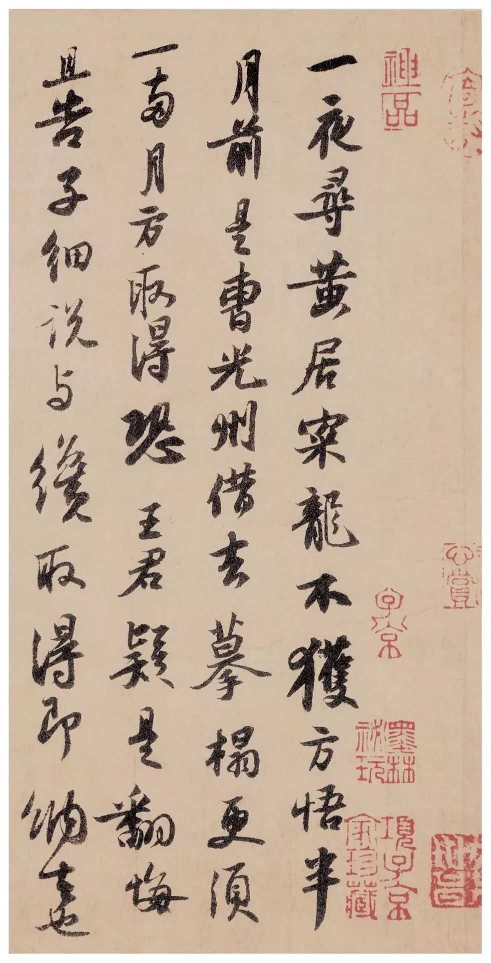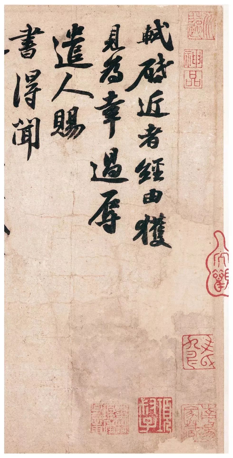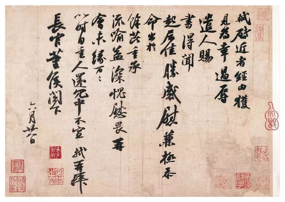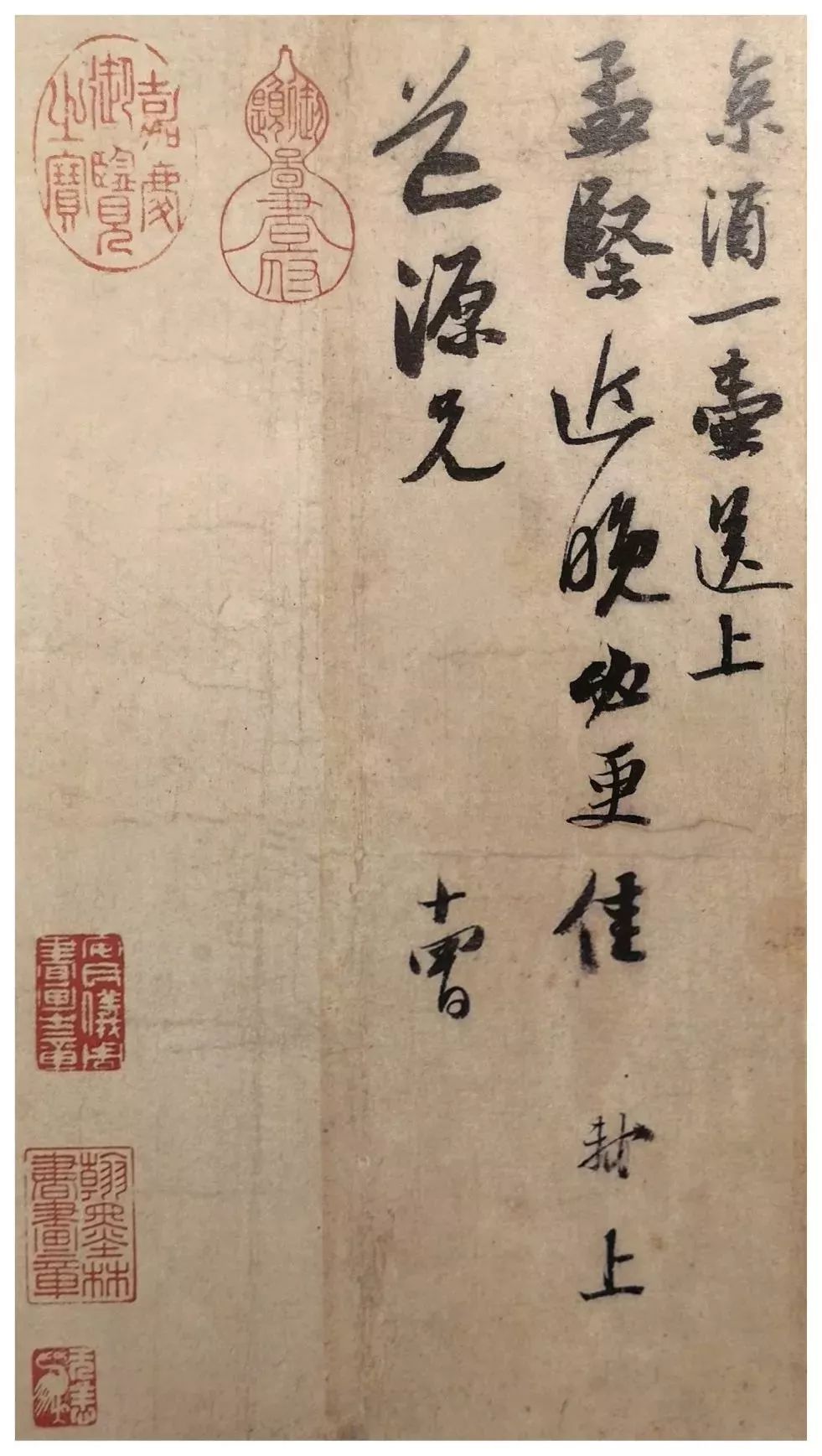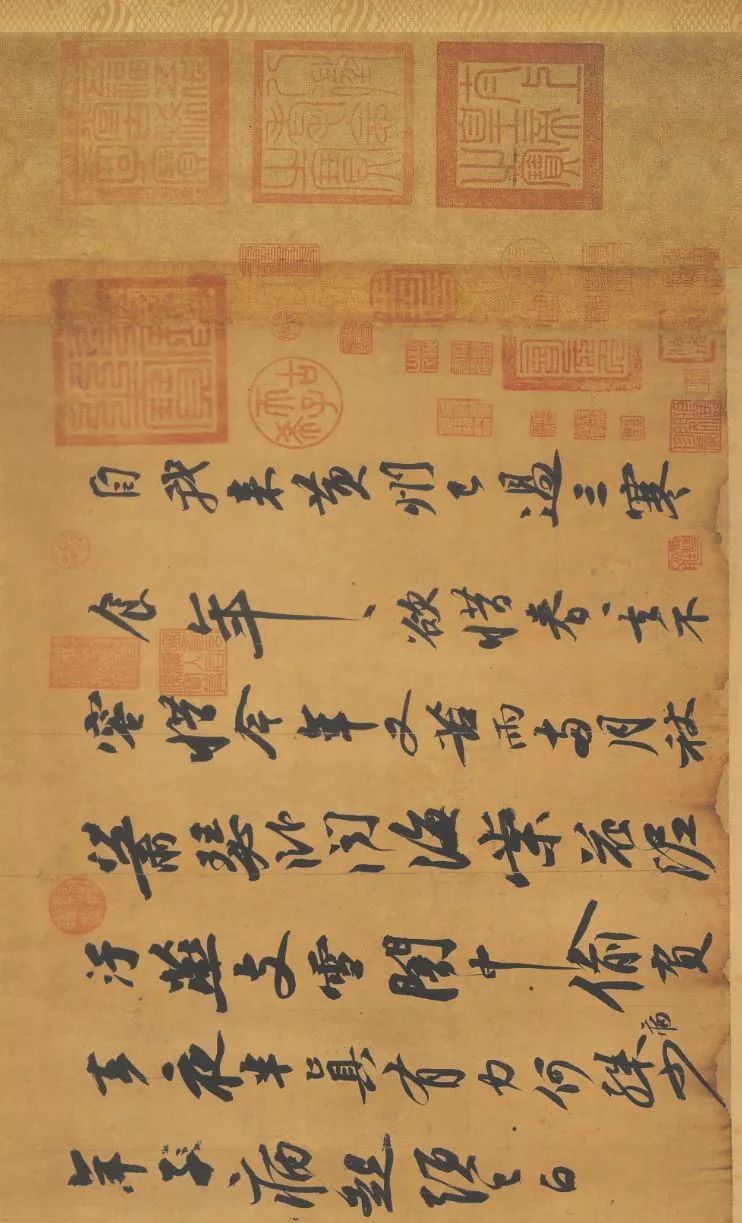 (北宋)苏轼 渡海帖 传世第三大行书苏轼《黄州寒食诗帖》 苏轼《黄州寒食帖》原帖图 大名鼎鼎的苏轼《赤壁赋》 传说为苏轼所作的《归去来兮辞》 更多的则是各类尺牍, 从1065年,苏轼30岁时所书的《宝月帖》, 到1101年,苏轼66岁时所书的《江上帖》, 时间跨度36年,在这36年间的近三十件尺牍中, 我们可以看到苏轼书风的发展演变, 从早年的用笔精到, 到老来的渐近自然, 每一件信札尺牍,都各具姿态,神采飞扬, 在有法、无法之间。 书于治平二年(1065) 大人令致恳。为催了礼书,事冗,未及上问。昨日得宝月书,书背承批问也。令子监簿必安胜,未及修染。轼顿首。 书于1071年(熙宁四年) 轼启。适辱教不果。即答悚悚。晚来尊体佳安。惠贶临安香合极佳妙。领意之厚。敢不捧当。但深感怍也。谨奉启。上谢不宣。轼再拜。运句太博阁下。十六日。 书于熙宁四年(1071) 轼启。辱教。具审孝履支持,承来日遂行,适请数客,未得走别。来晨如不甚早发,当诣见次。梅君书写未及,非久差人去也。李六丈近遣人赉书去,且为致恳。酒两壶,以饮从者而已。不宣,轼再拜。至孝廷平郭君。三日。 书于元丰元年(1078) 轼启。辱书,承法体安隐,甚慰想念。北游五年,尘垢所蒙,已化为俗吏矣。不知林下高人犹复不忘耶!未由会见,万万自重。不宣。轼顿首,坐主久上人。五月廿二日。 君不见诗人借车无可载。留得一钱何足赖。晚年更似杜陵翁。右臂虽存耳先聩。人将蚁动作牛鬪。我觉风雷真一噫。闻尘扫尽根性空。不须更枕清流派。大朴初散失混沌。六凿相攘更胜坏。眼花乱坠酒生风。口业不停诗有债。君知五蕴皆是贼。人生一病今先差。但恐此心终未了。不见不闻还是碍。今君疑我特佯聋。故作嘲诗穷险怪。须防额痒出三耳。莫放笔端风雨快。次韵秦太虚见戏耳聋。 书于1080年(元丰三年) 京酒一壶送上。孟坚近晚,必更佳。轼上道源兄,十四日。 书于元丰三年(1080) 道源事,只今可能枉顾啜茶否?有少事须至面白,孟坚必已好安也。轼上,恕草草。 书于元丰四年(1081) 故三司副使吏部陈公,轼不及见其人。然少时所识一时名卿胜士,多推尊之。尔来前辈凋丧略尽,能称诵公者,渐不复见。得其理言遗事,皆当记录宝藏,况其文章乎?公孙师仲,录公之诗廿五篇以示,轼三复太息,以想见公之大略云。元丰四年十一月廿二日,眉阳苏轼书。