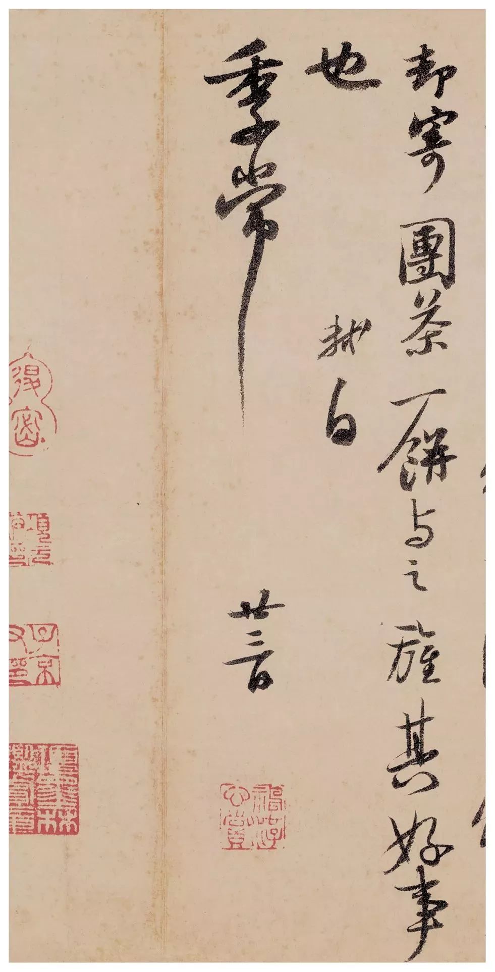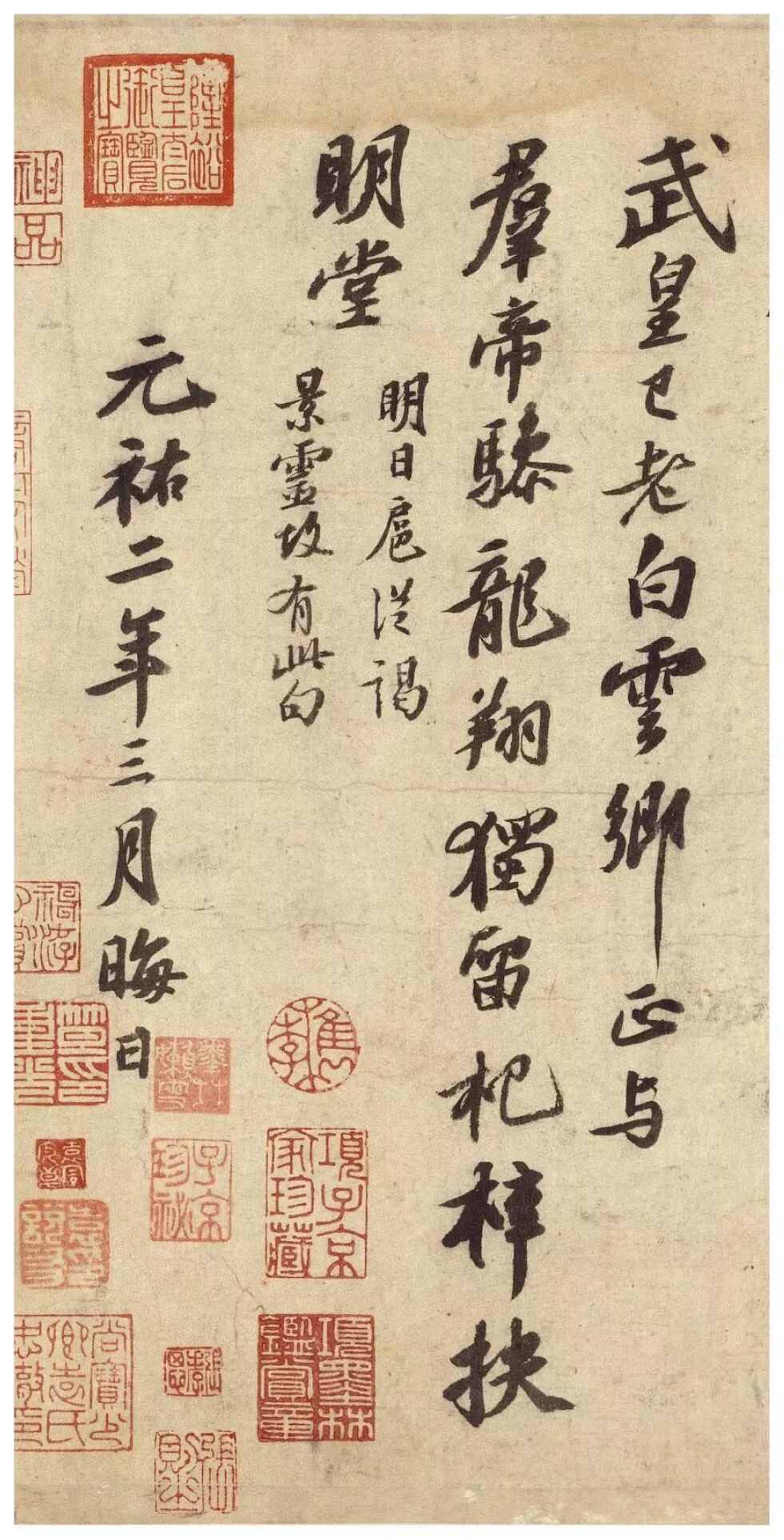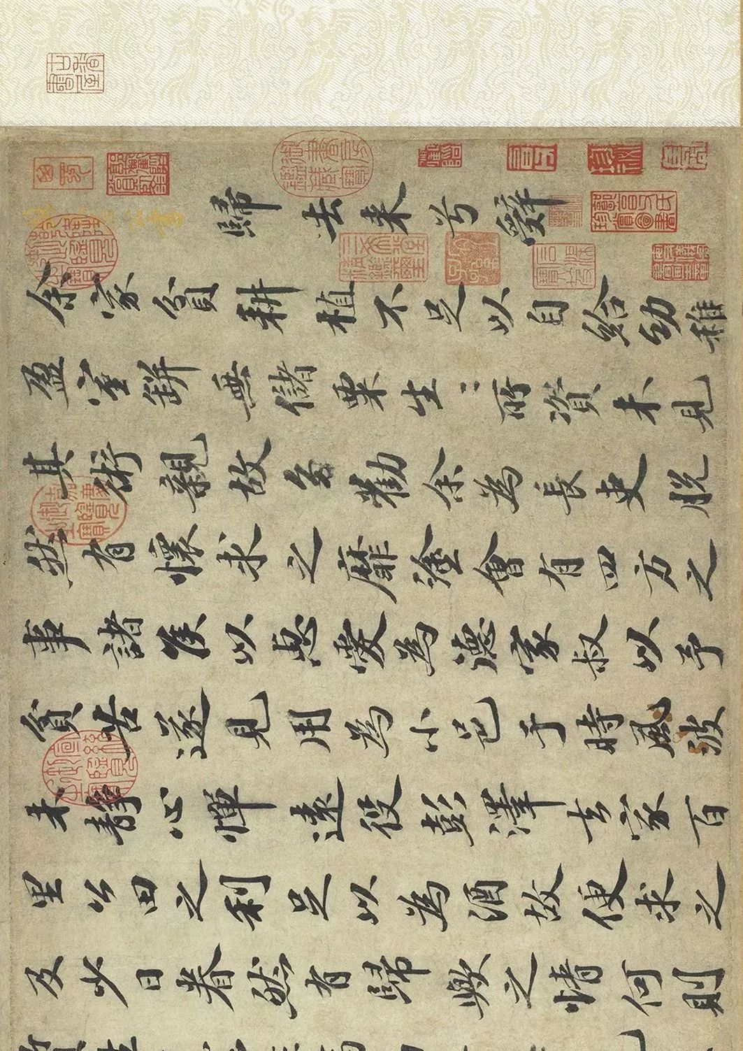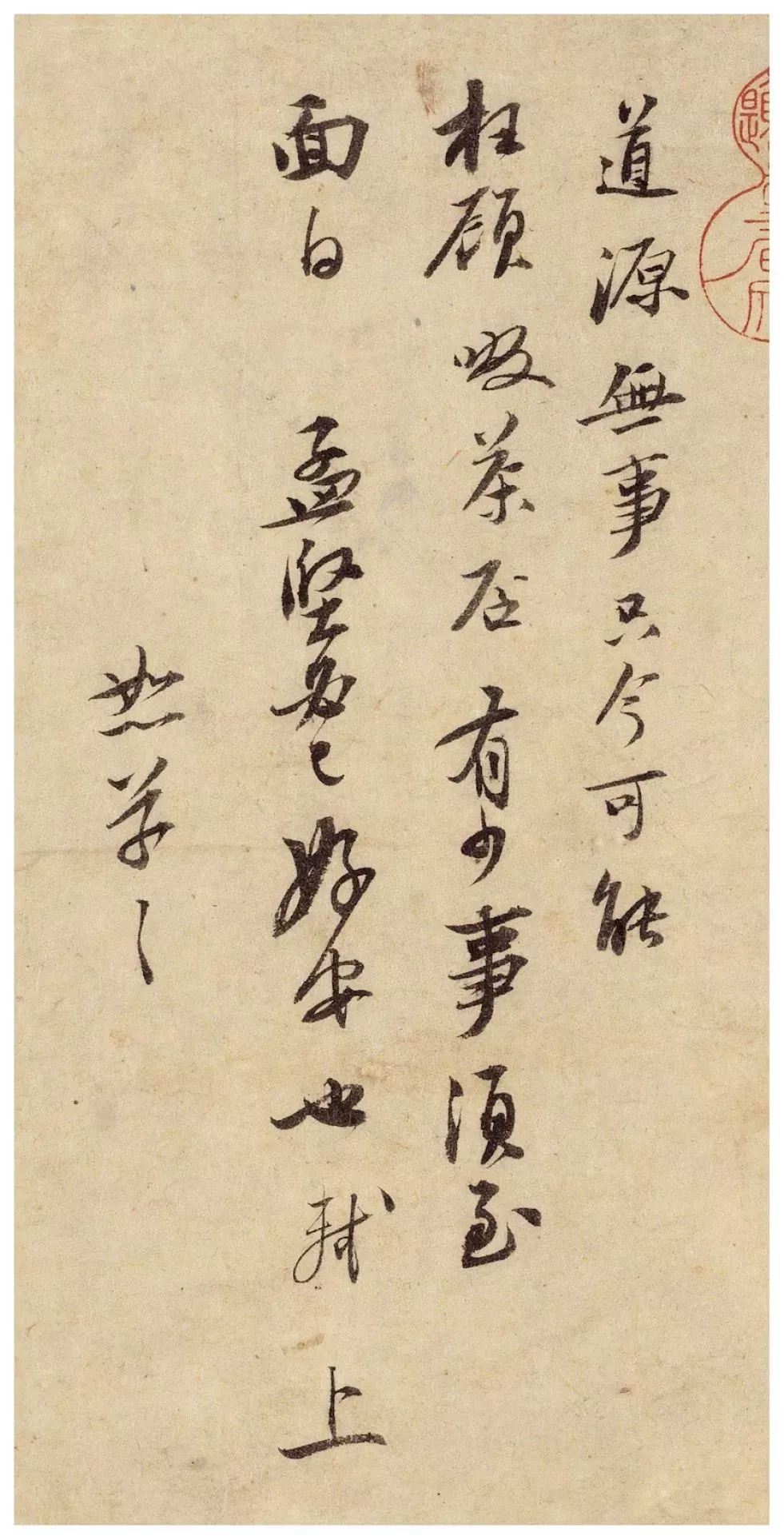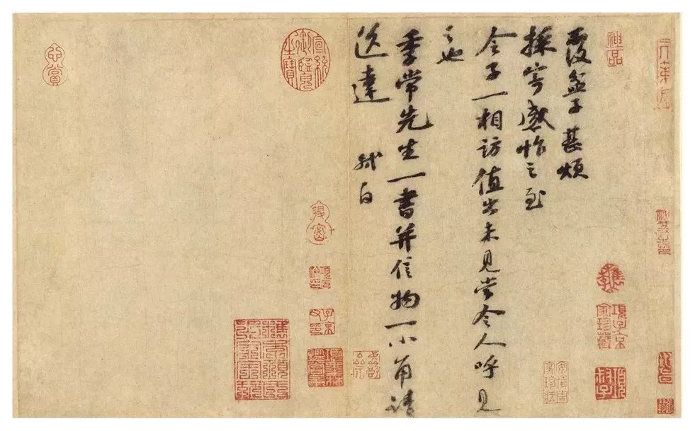 (北宋)苏轼 渡海帖 传世第三大行书苏轼《黄州寒食诗帖》 苏轼《黄州寒食帖》原帖图 大名鼎鼎的苏轼《赤壁赋》 传说为苏轼所作的《归去来兮辞》 更多的则是各类尺牍, 从1065年,苏轼30岁时所书的《宝月帖》, 到1101年,苏轼66岁时所书的《江上帖》, 时间跨度36年,在这36年间的近三十件尺牍中, 我们可以看到苏轼书风的发展演变, 从早年的用笔精到, 到老来的渐近自然, 每一件信札尺牍,都各具姿态,神采飞扬, 在有法、无法之间。 书于治平二年(1065) 大人令致恳。为催了礼书,事冗,未及上问。昨日得宝月书,书背承批问也。令子监簿必安胜,未及修染。轼顿首。 书于1071年(熙宁四年) 轼启。适辱教不果。即答悚悚。晚来尊体佳安。惠贶临安香合极佳妙。领意之厚。敢不捧当。但深感怍也。谨奉启。上谢不宣。轼再拜。运句太博阁下。十六日。 书于熙宁四年(1071) 轼启。辱教。具审孝履支持,承来日遂行,适请数客,未得走别。来晨如不甚早发,当诣见次。梅君书写未及,非久差人去也。李六丈近遣人赉书去,且为致恳。酒两壶,以饮从者而已。不宣,轼再拜。至孝廷平郭君。三日。 书于元丰元年(1078) 轼启。辱书,承法体安隐,甚慰想念。北游五年,尘垢所蒙,已化为俗吏矣。不知林下高人犹复不忘耶!未由会见,万万自重。不宣。轼顿首,坐主久上人。五月廿二日。 君不见诗人借车无可载。留得一钱何足赖。晚年更似杜陵翁。右臂虽存耳先聩。人将蚁动作牛鬪。我觉风雷真一噫。闻尘扫尽根性空。不须更枕清流派。大朴初散失混沌。六凿相攘更胜坏。眼花乱坠酒生风。口业不停诗有债。君知五蕴皆是贼。人生一病今先差。但恐此心终未了。不见不闻还是碍。今君疑我特佯聋。故作嘲诗穷险怪。须防额痒出三耳。莫放笔端风雨快。次韵秦太虚见戏耳聋。 书于1080年(元丰三年) 京酒一壶送上。孟坚近晚,必更佳。轼上道源兄,十四日。 书于元丰三年(1080) 道源事,只今可能枉顾啜茶否?有少事须至面白,孟坚必已好安也。轼上,恕草草。 书于元丰四年(1081) 故三司副使吏部陈公,轼不及见其人。然少时所识一时名卿胜士,多推尊之。尔来前辈凋丧略尽,能称诵公者,渐不复见。得其理言遗事,皆当记录宝藏,况其文章乎?公孙师仲,录公之诗廿五篇以示,轼三复太息,以想见公之大略云。元丰四年十一月廿二日,眉阳苏轼书。