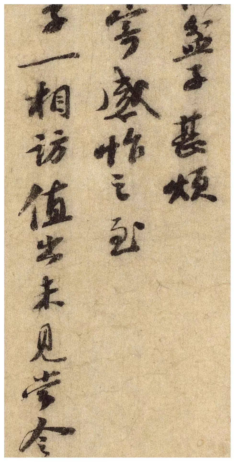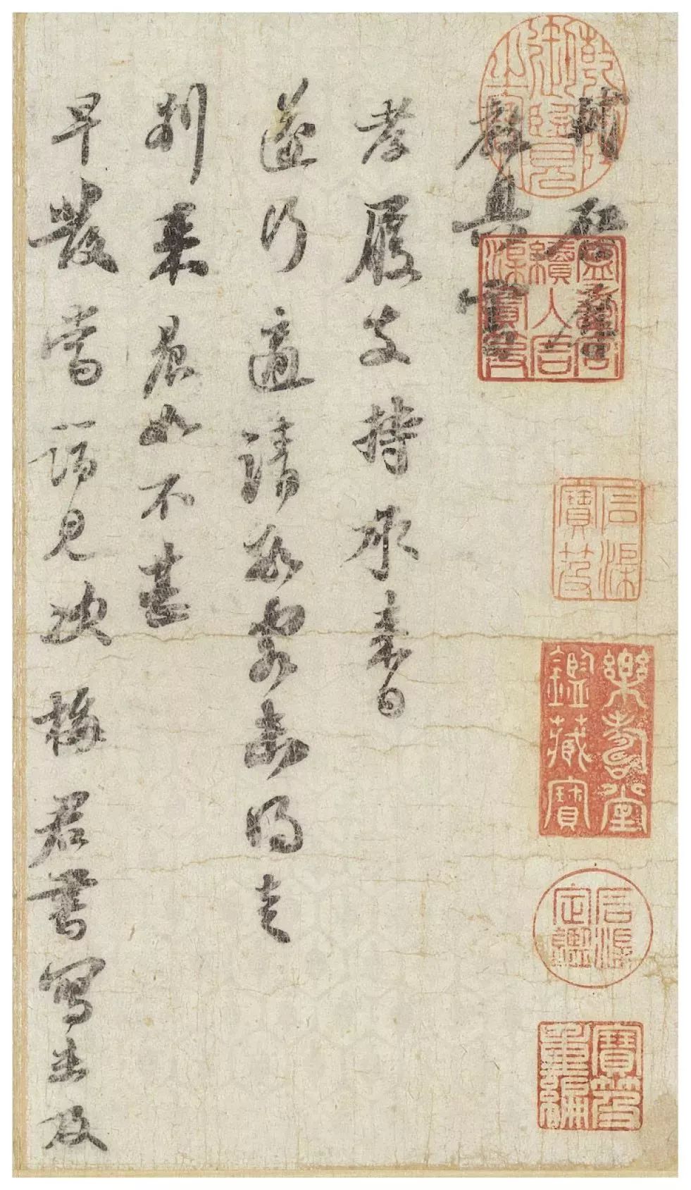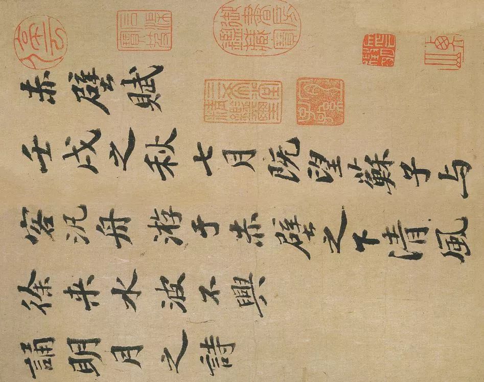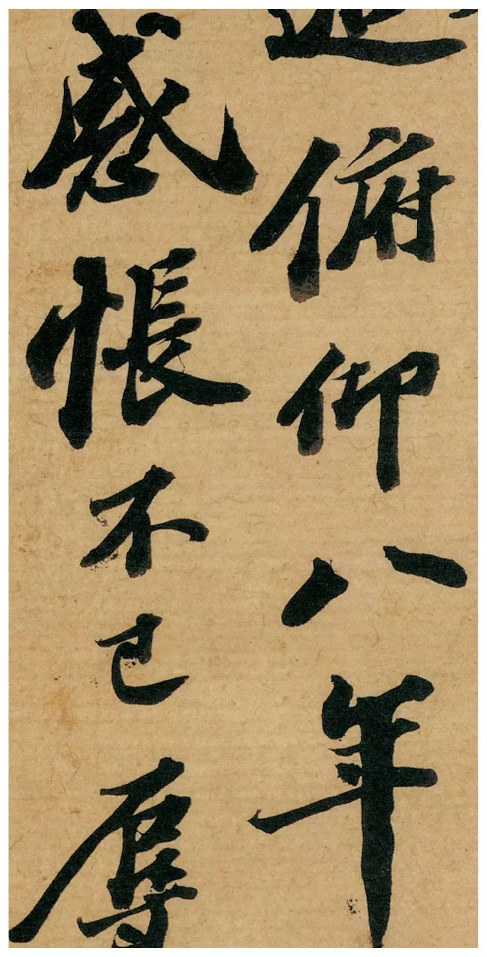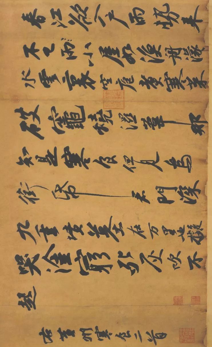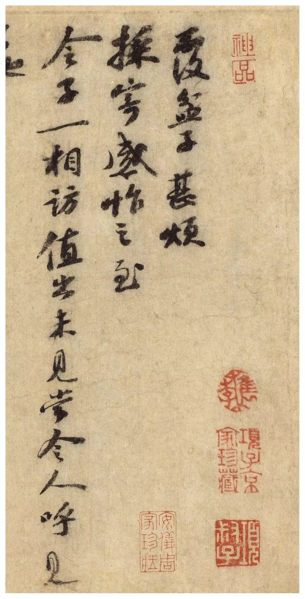 (北宋)苏轼 渡海帖 传世第三大行书苏轼《黄州寒食诗帖》 苏轼《黄州寒食帖》原帖图 大名鼎鼎的苏轼《赤壁赋》 传说为苏轼所作的《归去来兮辞》 更多的则是各类尺牍, 从1065年,苏轼30岁时所书的《宝月帖》, 到1101年,苏轼66岁时所书的《江上帖》, 时间跨度36年,在这36年间的近三十件尺牍中, 我们可以看到苏轼书风的发展演变, 从早年的用笔精到, 到老来的渐近自然, 每一件信札尺牍,都各具姿态,神采飞扬, 在有法、无法之间。 书于治平二年(1065) 大人令致恳。为催了礼书,事冗,未及上问。昨日得宝月书,书背承批问也。令子监簿必安胜,未及修染。轼顿首。 书于1071年(熙宁四年) 轼启。适辱教不果。即答悚悚。晚来尊体佳安。惠贶临安香合极佳妙。领意之厚。敢不捧当。但深感怍也。谨奉启。上谢不宣。轼再拜。运句太博阁下。十六日。 书于熙宁四年(1071) 轼启。辱教。具审孝履支持,承来日遂行,适请数客,未得走别。来晨如不甚早发,当诣见次。梅君书写未及,非久差人去也。李六丈近遣人赉书去,且为致恳。酒两壶,以饮从者而已。不宣,轼再拜。至孝廷平郭君。三日。 书于元丰元年(1078) 轼启。辱书,承法体安隐,甚慰想念。北游五年,尘垢所蒙,已化为俗吏矣。不知林下高人犹复不忘耶!未由会见,万万自重。不宣。轼顿首,坐主久上人。五月廿二日。 君不见诗人借车无可载。留得一钱何足赖。晚年更似杜陵翁。右臂虽存耳先聩。人将蚁动作牛鬪。我觉风雷真一噫。闻尘扫尽根性空。不须更枕清流派。大朴初散失混沌。六凿相攘更胜坏。眼花乱坠酒生风。口业不停诗有债。君知五蕴皆是贼。人生一病今先差。但恐此心终未了。不见不闻还是碍。今君疑我特佯聋。故作嘲诗穷险怪。须防额痒出三耳。莫放笔端风雨快。次韵秦太虚见戏耳聋。 书于1080年(元丰三年) 京酒一壶送上。孟坚近晚,必更佳。轼上道源兄,十四日。 书于元丰三年(1080) 道源事,只今可能枉顾啜茶否?有少事须至面白,孟坚必已好安也。轼上,恕草草。 书于元丰四年(1081) 故三司副使吏部陈公,轼不及见其人。然少时所识一时名卿胜士,多推尊之。尔来前辈凋丧略尽,能称诵公者,渐不复见。得其理言遗事,皆当记录宝藏,况其文章乎?公孙师仲,录公之诗廿五篇以示,轼三复太息,以想见公之大略云。元丰四年十一月廿二日,眉阳苏轼书。