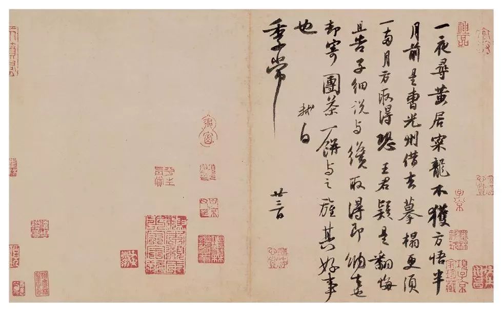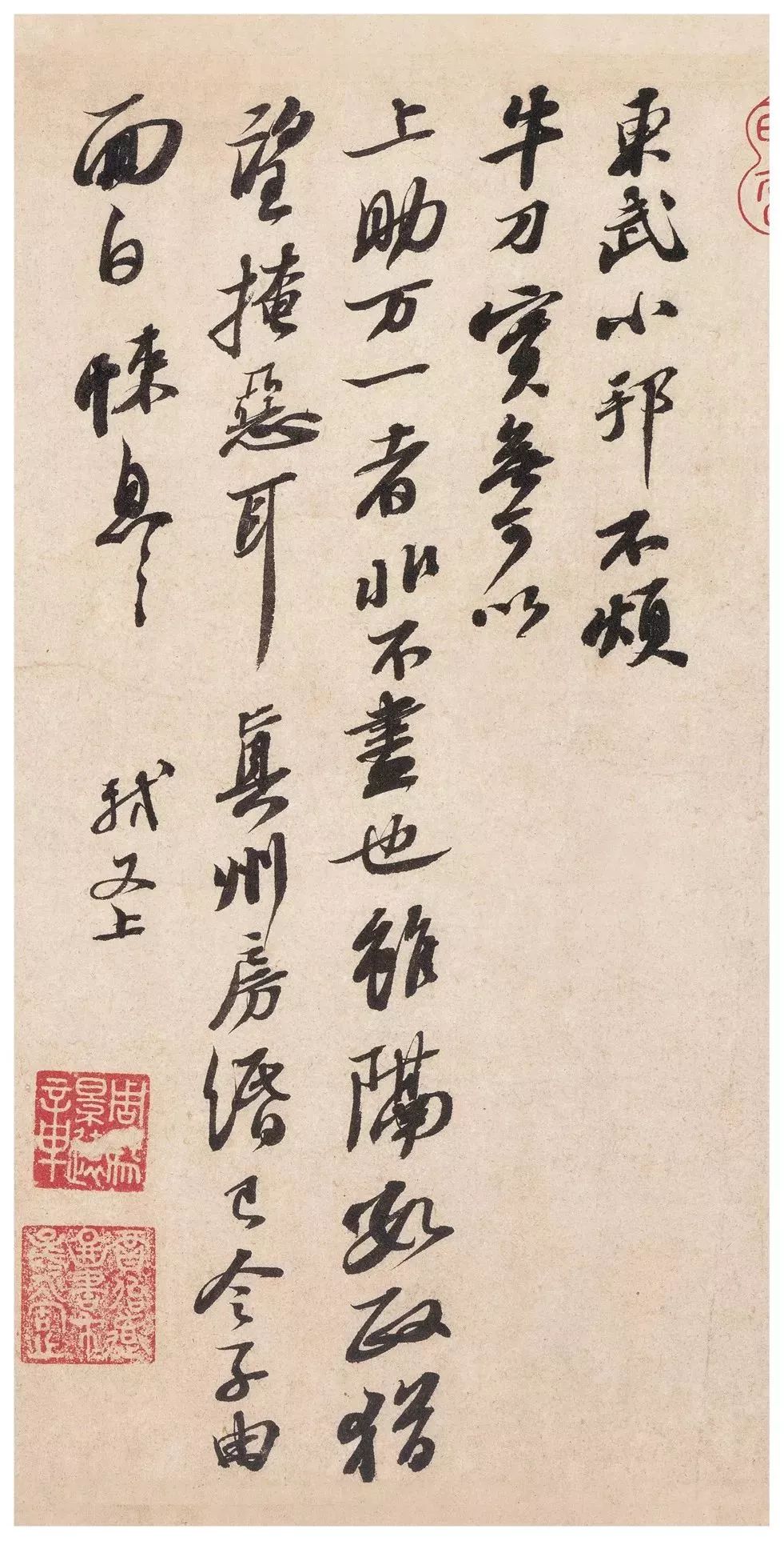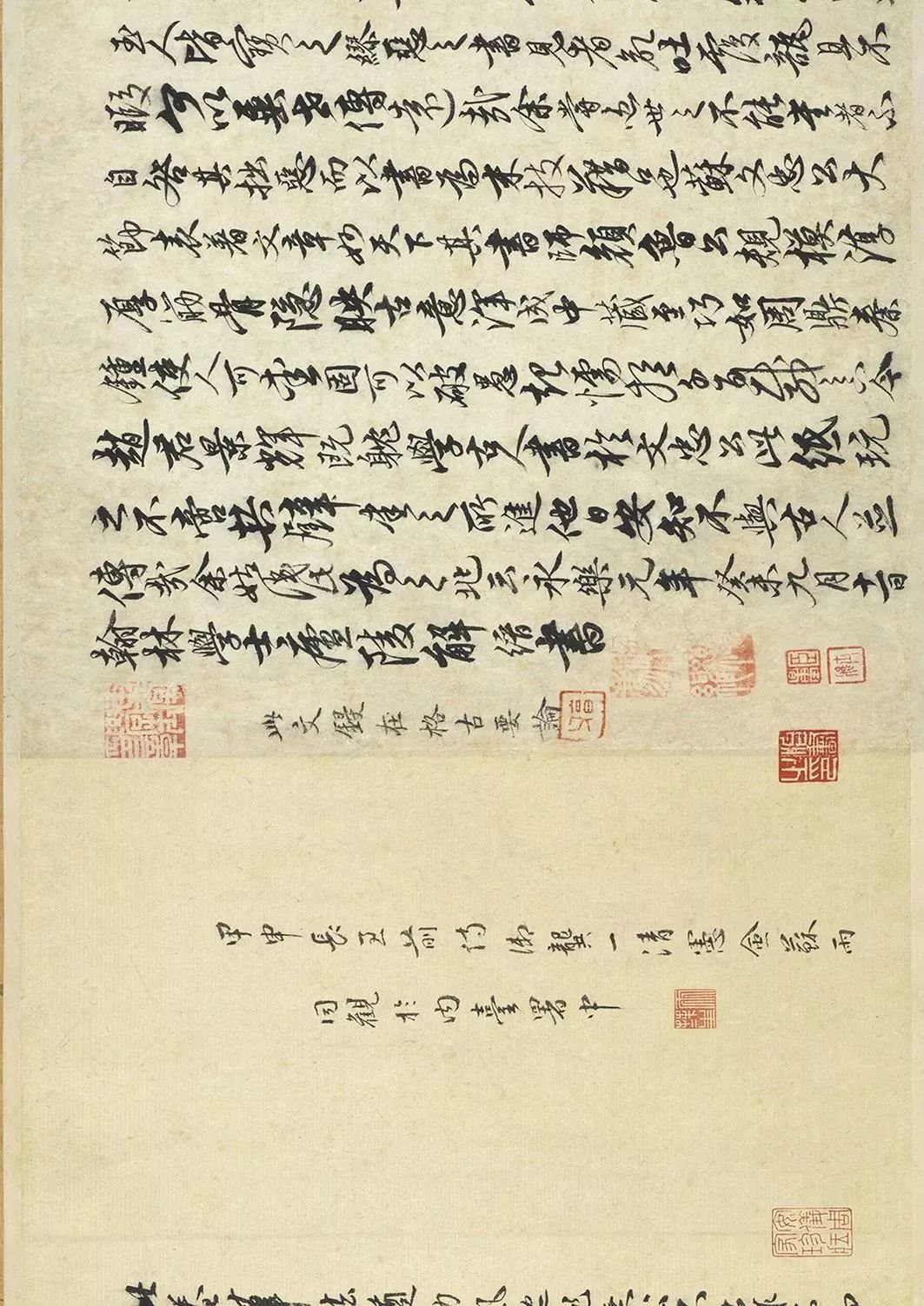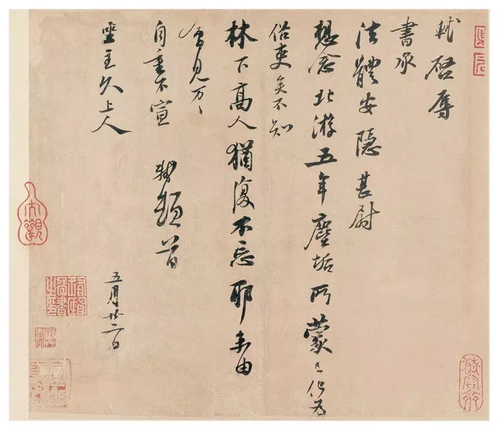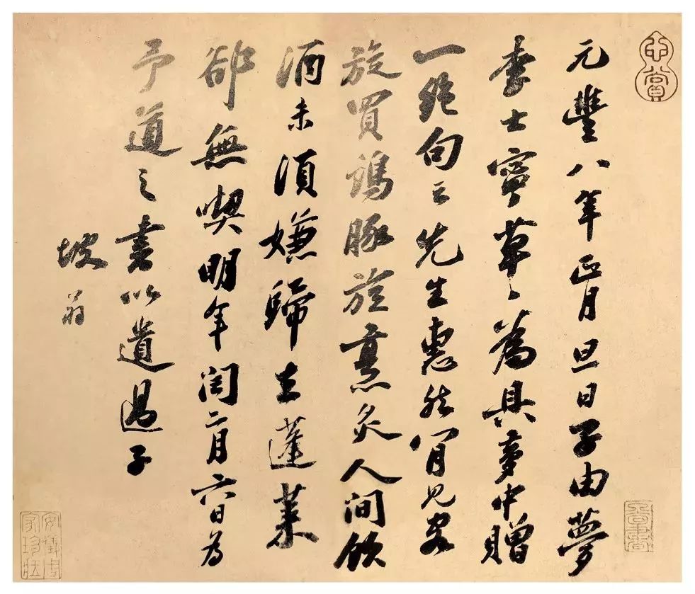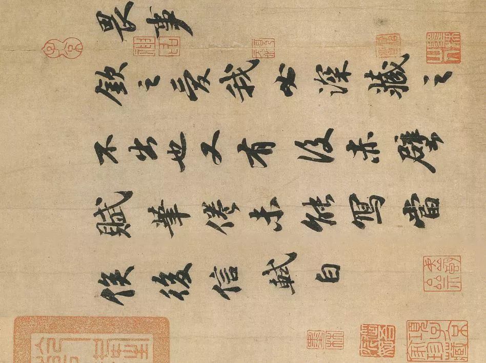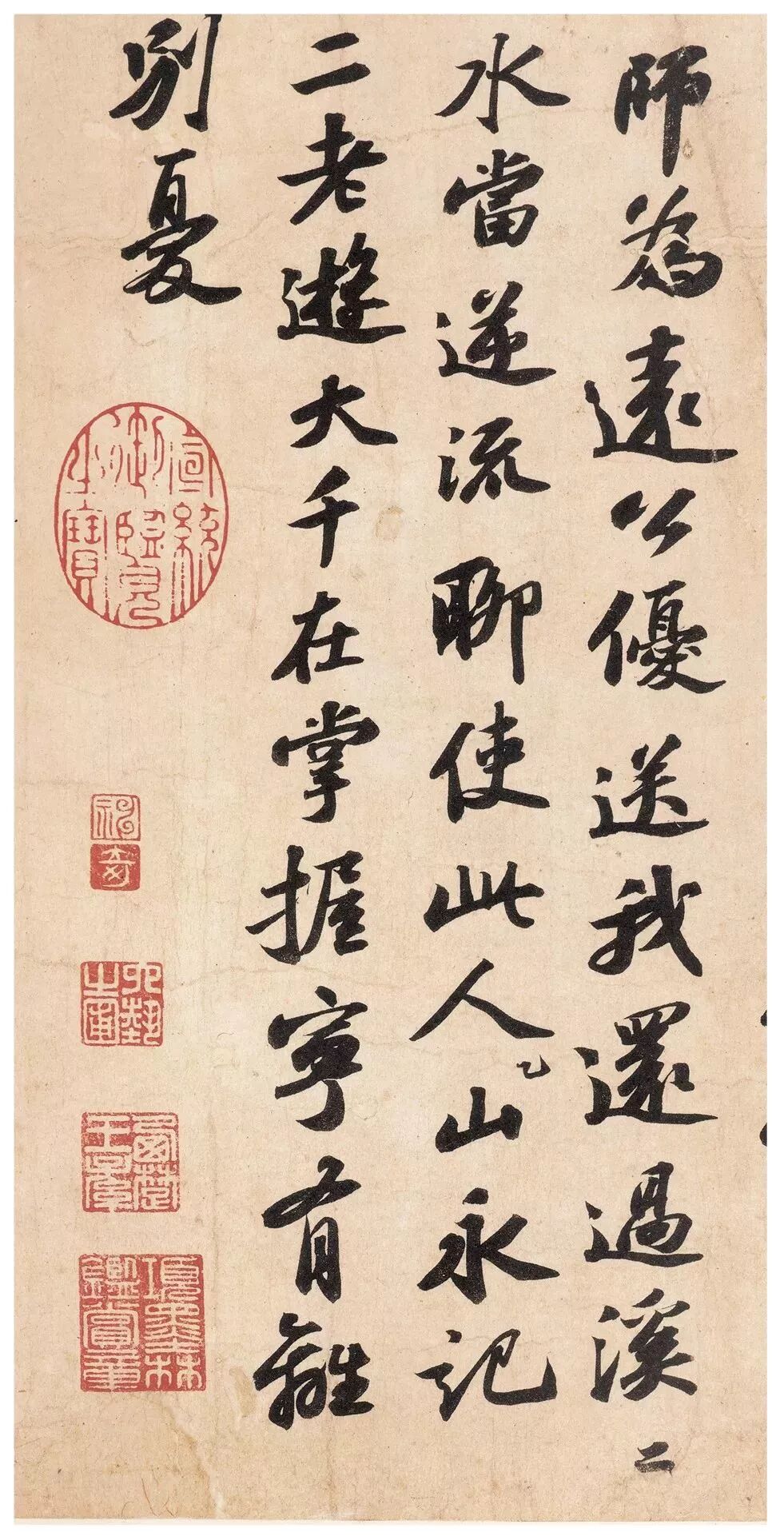 (北宋)苏轼 渡海帖 传世第三大行书苏轼《黄州寒食诗帖》 苏轼《黄州寒食帖》原帖图 大名鼎鼎的苏轼《赤壁赋》 传说为苏轼所作的《归去来兮辞》 更多的则是各类尺牍, 从1065年,苏轼30岁时所书的《宝月帖》, 到1101年,苏轼66岁时所书的《江上帖》, 时间跨度36年,在这36年间的近三十件尺牍中, 我们可以看到苏轼书风的发展演变, 从早年的用笔精到, 到老来的渐近自然, 每一件信札尺牍,都各具姿态,神采飞扬, 在有法、无法之间。 书于治平二年(1065) 大人令致恳。为催了礼书,事冗,未及上问。昨日得宝月书,书背承批问也。令子监簿必安胜,未及修染。轼顿首。 书于1071年(熙宁四年) 轼启。适辱教不果。即答悚悚。晚来尊体佳安。惠贶临安香合极佳妙。领意之厚。敢不捧当。但深感怍也。谨奉启。上谢不宣。轼再拜。运句太博阁下。十六日。 书于熙宁四年(1071) 轼启。辱教。具审孝履支持,承来日遂行,适请数客,未得走别。来晨如不甚早发,当诣见次。梅君书写未及,非久差人去也。李六丈近遣人赉书去,且为致恳。酒两壶,以饮从者而已。不宣,轼再拜。至孝廷平郭君。三日。 书于元丰元年(1078) 轼启。辱书,承法体安隐,甚慰想念。北游五年,尘垢所蒙,已化为俗吏矣。不知林下高人犹复不忘耶!未由会见,万万自重。不宣。轼顿首,坐主久上人。五月廿二日。 君不见诗人借车无可载。留得一钱何足赖。晚年更似杜陵翁。右臂虽存耳先聩。人将蚁动作牛鬪。我觉风雷真一噫。闻尘扫尽根性空。不须更枕清流派。大朴初散失混沌。六凿相攘更胜坏。眼花乱坠酒生风。口业不停诗有债。君知五蕴皆是贼。人生一病今先差。但恐此心终未了。不见不闻还是碍。今君疑我特佯聋。故作嘲诗穷险怪。须防额痒出三耳。莫放笔端风雨快。次韵秦太虚见戏耳聋。 书于1080年(元丰三年) 京酒一壶送上。孟坚近晚,必更佳。轼上道源兄,十四日。 书于元丰三年(1080) 道源事,只今可能枉顾啜茶否?有少事须至面白,孟坚必已好安也。轼上,恕草草。 书于元丰四年(1081) 故三司副使吏部陈公,轼不及见其人。然少时所识一时名卿胜士,多推尊之。尔来前辈凋丧略尽,能称诵公者,渐不复见。得其理言遗事,皆当记录宝藏,况其文章乎?公孙师仲,录公之诗廿五篇以示,轼三复太息,以想见公之大略云。元丰四年十一月廿二日,眉阳苏轼书。