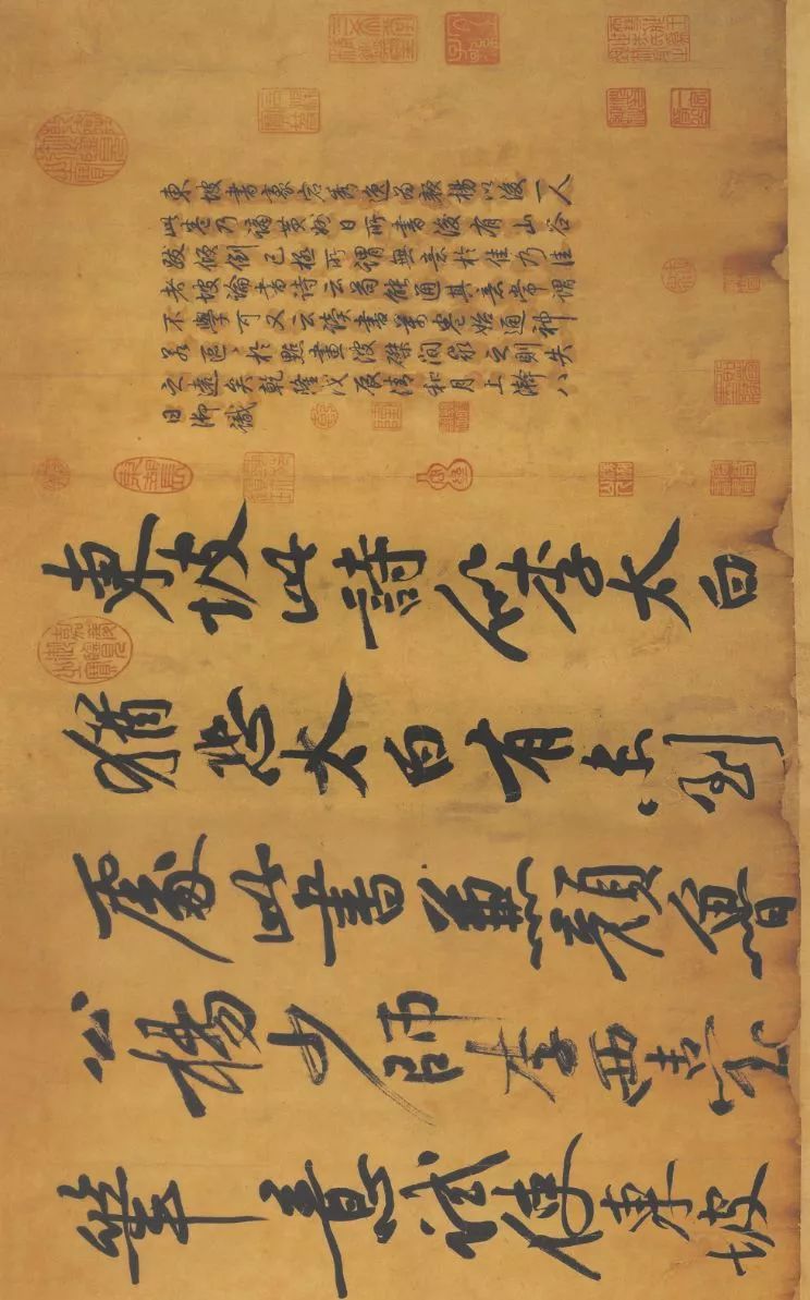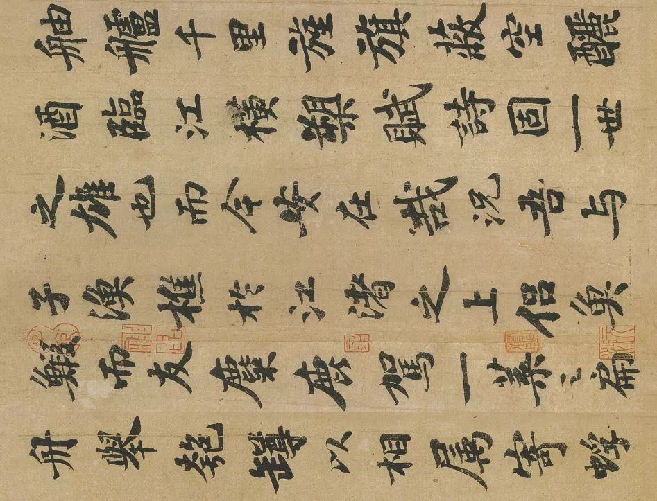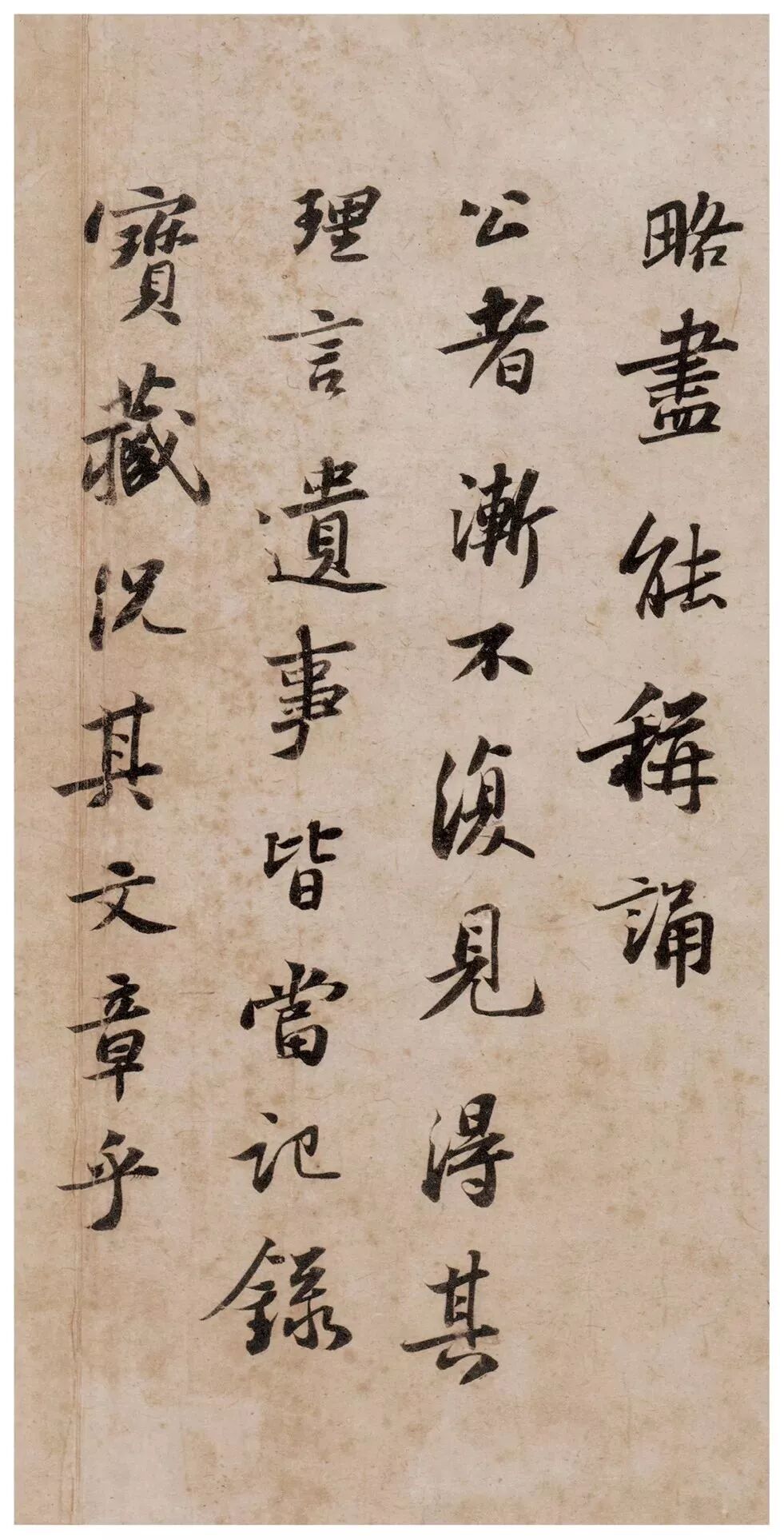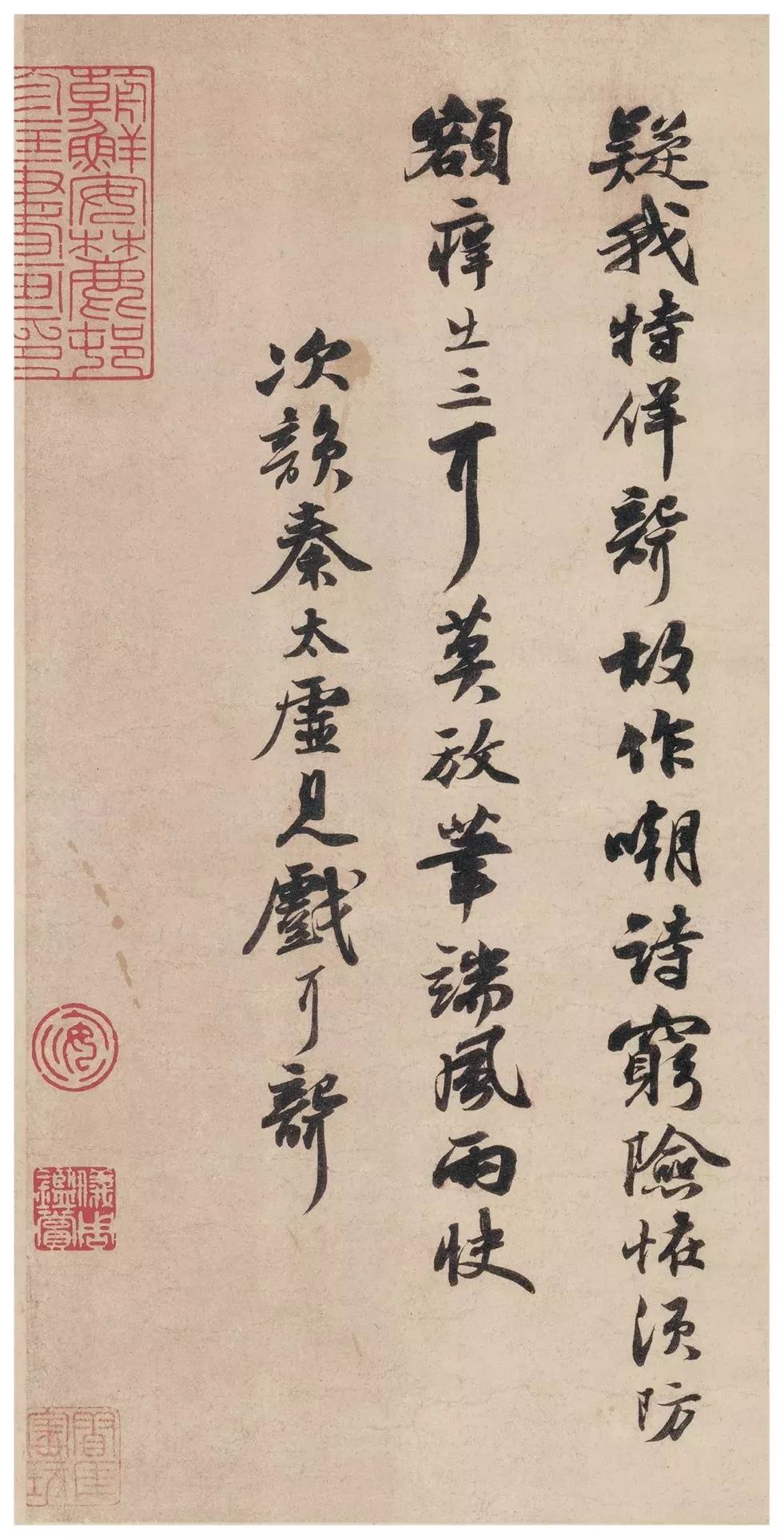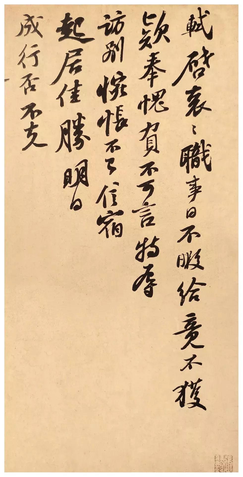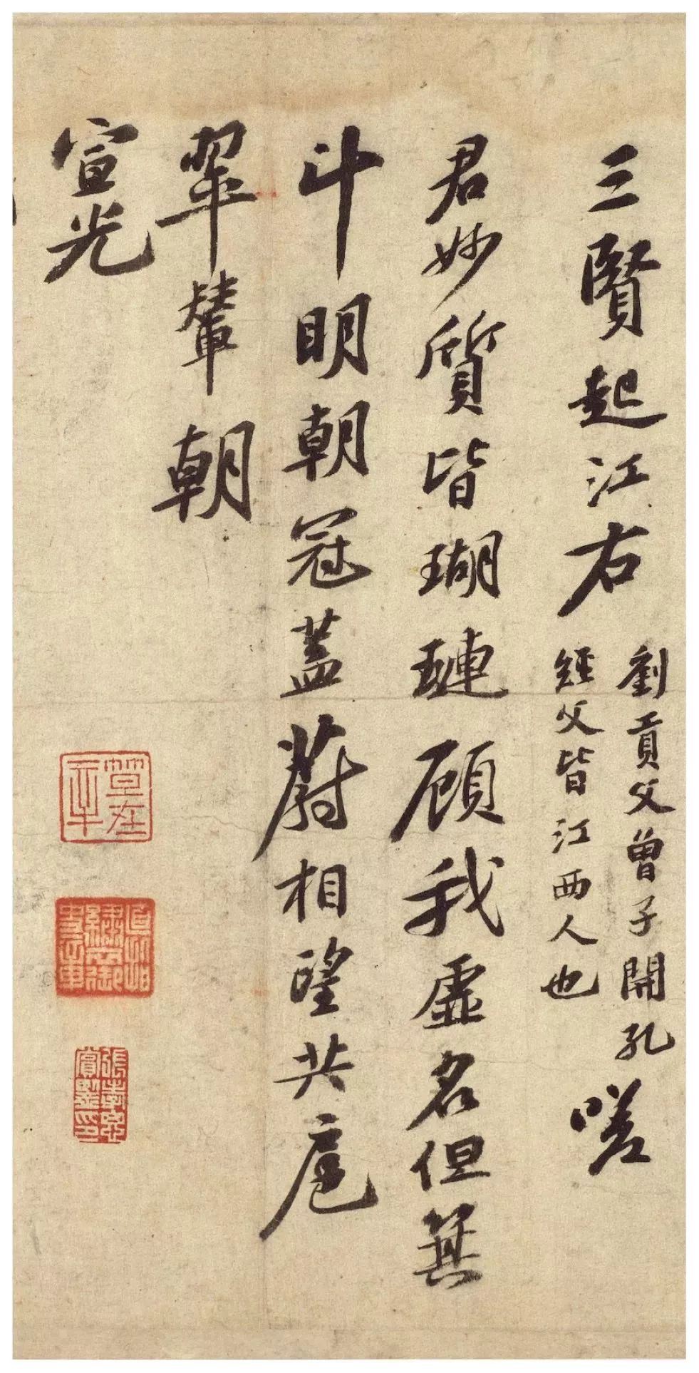 (北宋)苏轼 渡海帖 传世第三大行书苏轼《黄州寒食诗帖》 苏轼《黄州寒食帖》原帖图 大名鼎鼎的苏轼《赤壁赋》 传说为苏轼所作的《归去来兮辞》 更多的则是各类尺牍, 从1065年,苏轼30岁时所书的《宝月帖》, 到1101年,苏轼66岁时所书的《江上帖》, 时间跨度36年,在这36年间的近三十件尺牍中, 我们可以看到苏轼书风的发展演变, 从早年的用笔精到, 到老来的渐近自然, 每一件信札尺牍,都各具姿态,神采飞扬, 在有法、无法之间。 书于治平二年(1065) 大人令致恳。为催了礼书,事冗,未及上问。昨日得宝月书,书背承批问也。令子监簿必安胜,未及修染。轼顿首。 书于1071年(熙宁四年) 轼启。适辱教不果。即答悚悚。晚来尊体佳安。惠贶临安香合极佳妙。领意之厚。敢不捧当。但深感怍也。谨奉启。上谢不宣。轼再拜。运句太博阁下。十六日。 书于熙宁四年(1071) 轼启。辱教。具审孝履支持,承来日遂行,适请数客,未得走别。来晨如不甚早发,当诣见次。梅君书写未及,非久差人去也。李六丈近遣人赉书去,且为致恳。酒两壶,以饮从者而已。不宣,轼再拜。至孝廷平郭君。三日。 书于元丰元年(1078) 轼启。辱书,承法体安隐,甚慰想念。北游五年,尘垢所蒙,已化为俗吏矣。不知林下高人犹复不忘耶!未由会见,万万自重。不宣。轼顿首,坐主久上人。五月廿二日。 君不见诗人借车无可载。留得一钱何足赖。晚年更似杜陵翁。右臂虽存耳先聩。人将蚁动作牛鬪。我觉风雷真一噫。闻尘扫尽根性空。不须更枕清流派。大朴初散失混沌。六凿相攘更胜坏。眼花乱坠酒生风。口业不停诗有债。君知五蕴皆是贼。人生一病今先差。但恐此心终未了。不见不闻还是碍。今君疑我特佯聋。故作嘲诗穷险怪。须防额痒出三耳。莫放笔端风雨快。次韵秦太虚见戏耳聋。 书于1080年(元丰三年) 京酒一壶送上。孟坚近晚,必更佳。轼上道源兄,十四日。 书于元丰三年(1080) 道源事,只今可能枉顾啜茶否?有少事须至面白,孟坚必已好安也。轼上,恕草草。 书于元丰四年(1081) 故三司副使吏部陈公,轼不及见其人。然少时所识一时名卿胜士,多推尊之。尔来前辈凋丧略尽,能称诵公者,渐不复见。得其理言遗事,皆当记录宝藏,况其文章乎?公孙师仲,录公之诗廿五篇以示,轼三复太息,以想见公之大略云。元丰四年十一月廿二日,眉阳苏轼书。