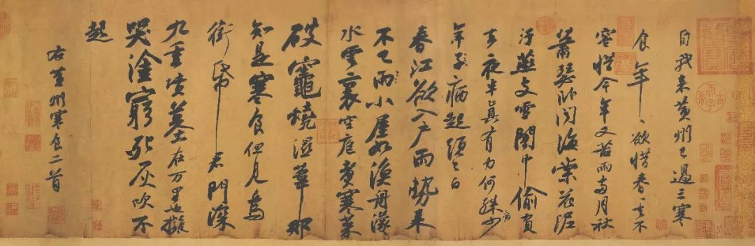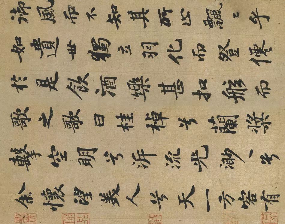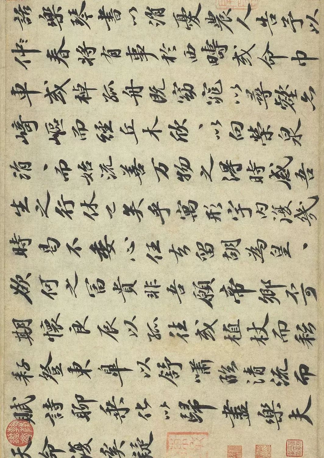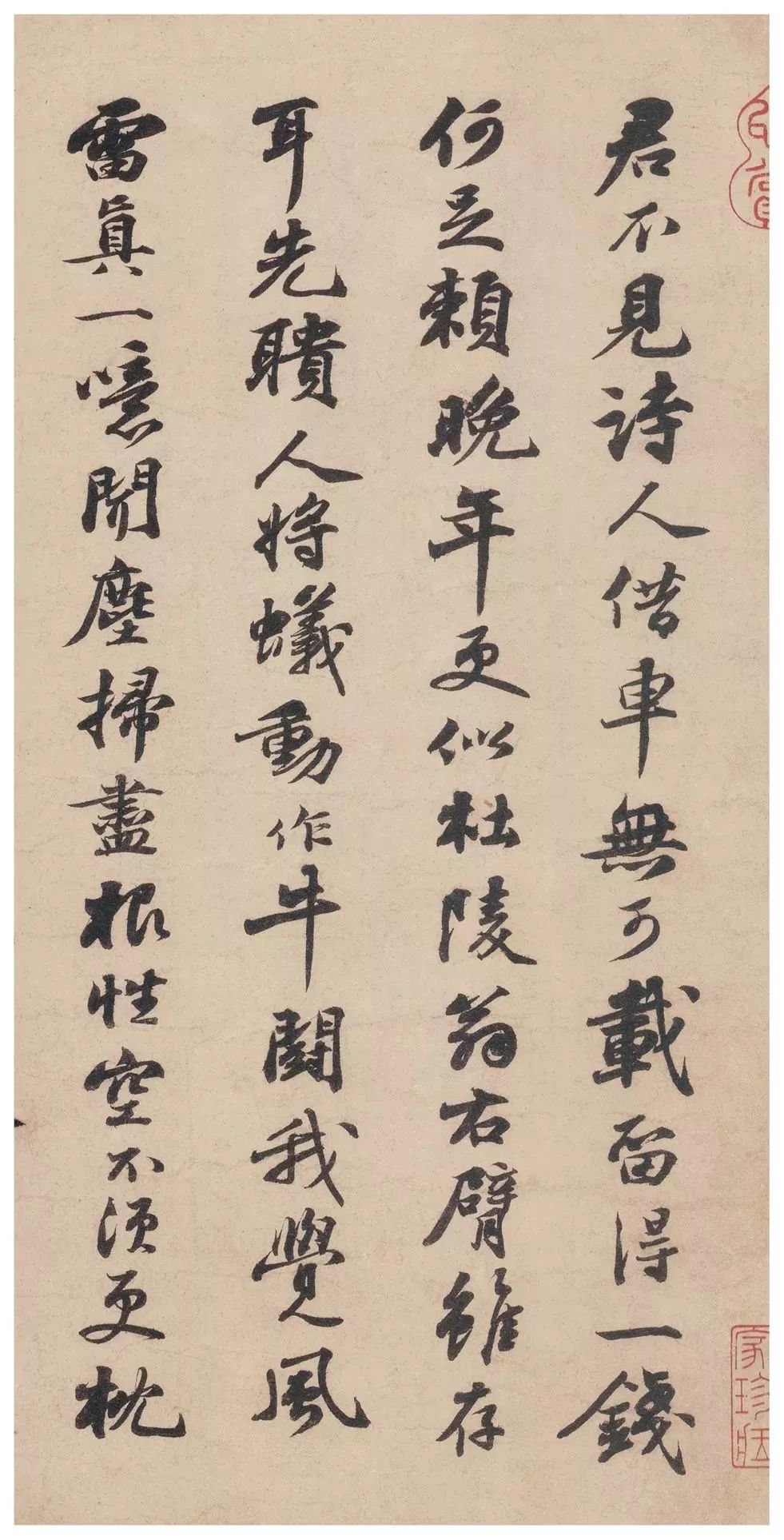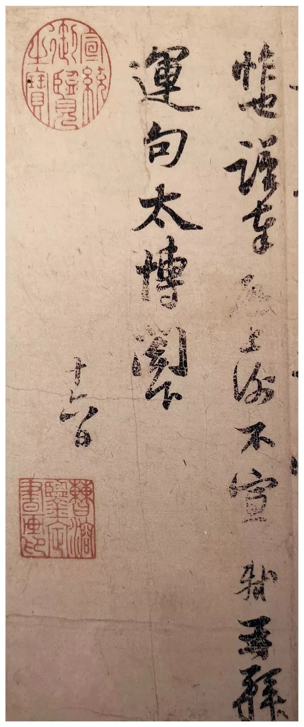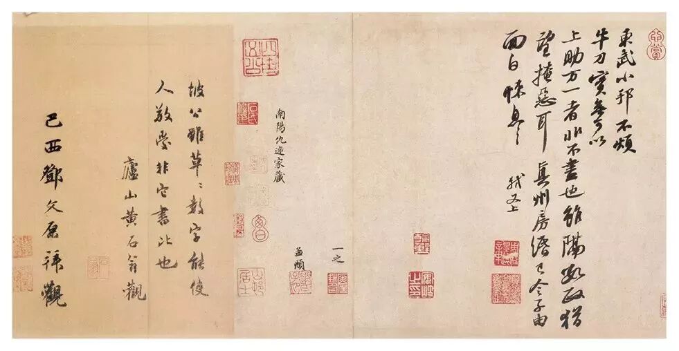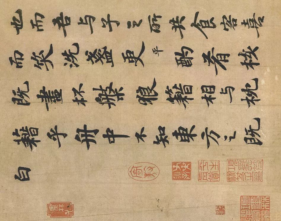 (北宋)苏轼 渡海帖 传世第三大行书苏轼《黄州寒食诗帖》 苏轼《黄州寒食帖》原帖图 大名鼎鼎的苏轼《赤壁赋》 传说为苏轼所作的《归去来兮辞》 更多的则是各类尺牍, 从1065年,苏轼30岁时所书的《宝月帖》, 到1101年,苏轼66岁时所书的《江上帖》, 时间跨度36年,在这36年间的近三十件尺牍中, 我们可以看到苏轼书风的发展演变, 从早年的用笔精到, 到老来的渐近自然, 每一件信札尺牍,都各具姿态,神采飞扬, 在有法、无法之间。 书于治平二年(1065) 大人令致恳。为催了礼书,事冗,未及上问。昨日得宝月书,书背承批问也。令子监簿必安胜,未及修染。轼顿首。 书于1071年(熙宁四年) 轼启。适辱教不果。即答悚悚。晚来尊体佳安。惠贶临安香合极佳妙。领意之厚。敢不捧当。但深感怍也。谨奉启。上谢不宣。轼再拜。运句太博阁下。十六日。 书于熙宁四年(1071) 轼启。辱教。具审孝履支持,承来日遂行,适请数客,未得走别。来晨如不甚早发,当诣见次。梅君书写未及,非久差人去也。李六丈近遣人赉书去,且为致恳。酒两壶,以饮从者而已。不宣,轼再拜。至孝廷平郭君。三日。 书于元丰元年(1078) 轼启。辱书,承法体安隐,甚慰想念。北游五年,尘垢所蒙,已化为俗吏矣。不知林下高人犹复不忘耶!未由会见,万万自重。不宣。轼顿首,坐主久上人。五月廿二日。 君不见诗人借车无可载。留得一钱何足赖。晚年更似杜陵翁。右臂虽存耳先聩。人将蚁动作牛鬪。我觉风雷真一噫。闻尘扫尽根性空。不须更枕清流派。大朴初散失混沌。六凿相攘更胜坏。眼花乱坠酒生风。口业不停诗有债。君知五蕴皆是贼。人生一病今先差。但恐此心终未了。不见不闻还是碍。今君疑我特佯聋。故作嘲诗穷险怪。须防额痒出三耳。莫放笔端风雨快。次韵秦太虚见戏耳聋。 书于1080年(元丰三年) 京酒一壶送上。孟坚近晚,必更佳。轼上道源兄,十四日。 书于元丰三年(1080) 道源事,只今可能枉顾啜茶否?有少事须至面白,孟坚必已好安也。轼上,恕草草。 书于元丰四年(1081) 故三司副使吏部陈公,轼不及见其人。然少时所识一时名卿胜士,多推尊之。尔来前辈凋丧略尽,能称诵公者,渐不复见。得其理言遗事,皆当记录宝藏,况其文章乎?公孙师仲,录公之诗廿五篇以示,轼三复太息,以想见公之大略云。元丰四年十一月廿二日,眉阳苏轼书。