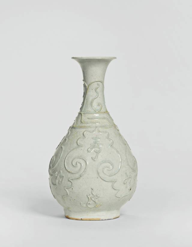 瓶花口束颈,腹部有比例适中的指沟,圈足外撇。胎薄,可透指影,通体施青白釉,釉色晶莹。此瓶造型别致,呈波浪起伏的口部,强化了“花”的造型,使瓶子更加秀丽优美,而且富有生活情趣。