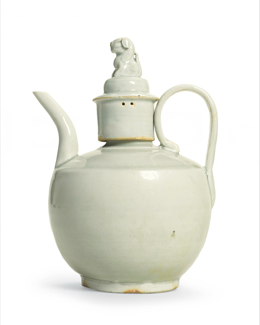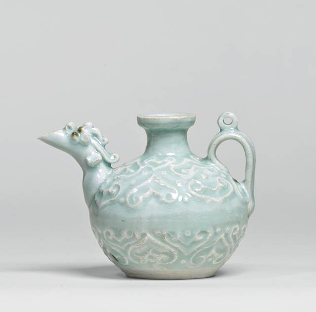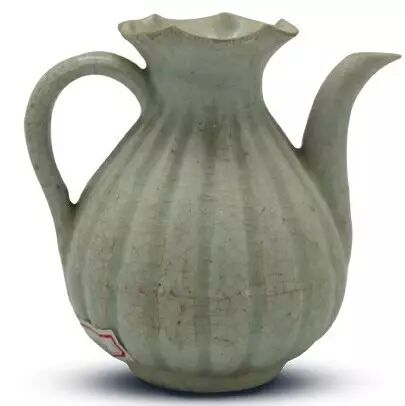 执壶的釉色呈淡青绿色,极薄而透明,让人感到柔软和亲切。丰腴饱满的壶体,在极薄的坯体上勒出十六道筋纹,稍短的颈向上渐渐放大直到呈花形的口部为止,与此同时宽而薄的壶柄从颈部划一道圆弧搭至腹上,细而修长的壶嘴自壶腹部直出到与口部相平。受阿拉伯文化的影响,唐代瓷器已开始仿金银器,宋代更甚。宋代景德镇青白瓷以日用器皿为主,在造型上吸收金银器的特点并加以创造,这件青白瓷执壶明显带有仿金银器的某些特征,不仅造型优雅秀美,而且腹大流长,既便于存储水和酒,又便于倾倒。