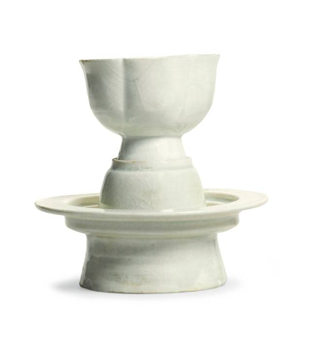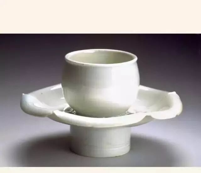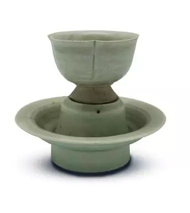 此套盏托造型简约,线条流畅,光素无纹饰。杯为敞口,深腹,高圈足外撇。托为折沿口,台阶式浅腹,高圈足,托中央设一高台,台边缘凸起一周托圈,圈内仅容杯足于内。杯与托通体施白中带青的青白釉,仅底部露胎。杯足积釉较厚,器形清秀典雅,传递给我们一种端庄、恬静、淡雅之美。盏托,亦称茶托,是一种以“托”和“盏”配套使用的茶具,是宋人饮茶的必备之物。