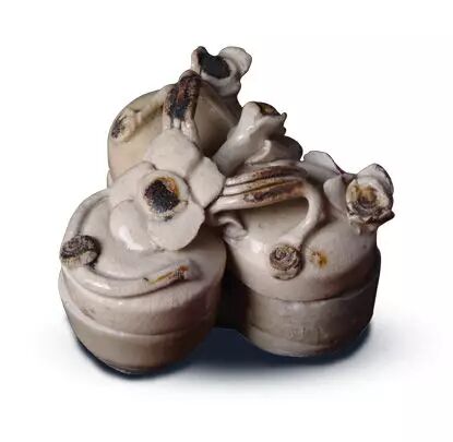 盖与盒身以子母口扣合。三根花茎缠绕在三盒的盖顶,其中一盒盖面上捏塑有一朵盛开的花朵,另两盒的盒面各捏塑一朵含苞待放的小花蕾,布局疏密得当,制作工艺十分精巧,显得格外美观。该三联盒子母口无釉,里外施满莹缜如玉的青白釉,花蕊、花蕾及花茎都以褐彩点缀。盒盖和盒身用深而宽的刀痕刻划出花瓣纹,刀法简洁熟练,纹饰清晰,增加了三联盒的立体感。这种瓷盒子主要用途为盛装药品、化妆品和香料等。