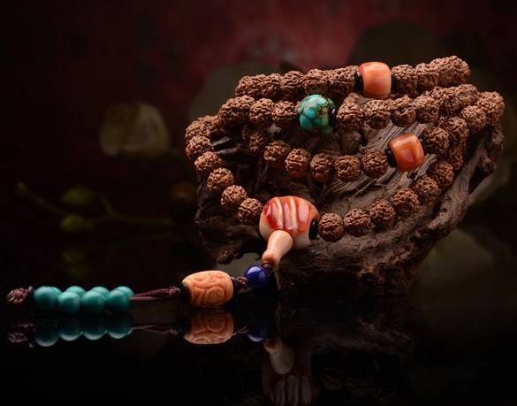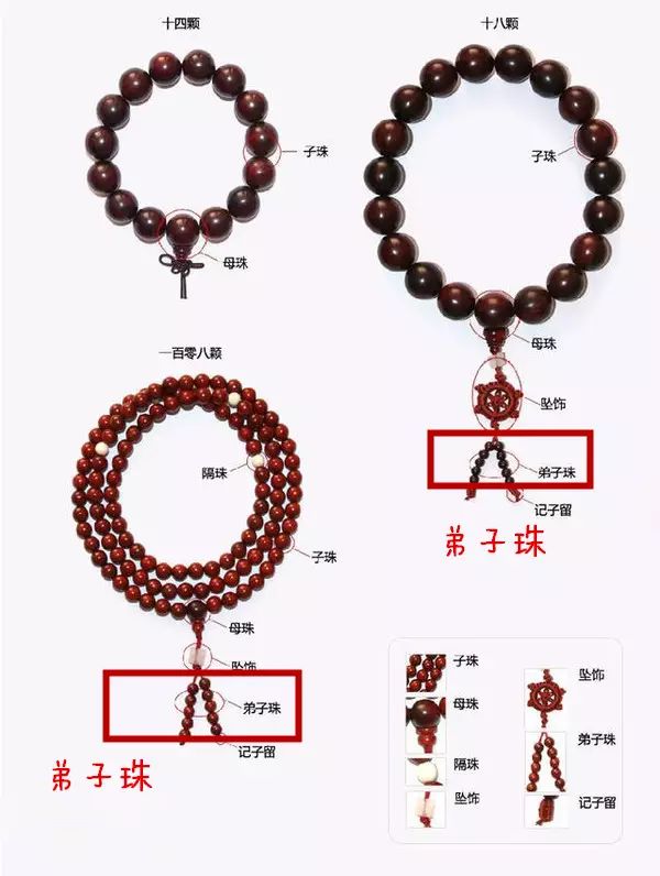 弟子珠的体积一般比子珠要小一些,多用六粒到十二粒不等的数目,平均排列为两例,一般起到装饰作用,也有一些没有安装计数器的佛珠,也可以用弟子珠计数,同样是十粒为一个计数单位,和算盘同理采用十进位,根据自身修行的持咒诵经遍数,也有不同的计数方法。