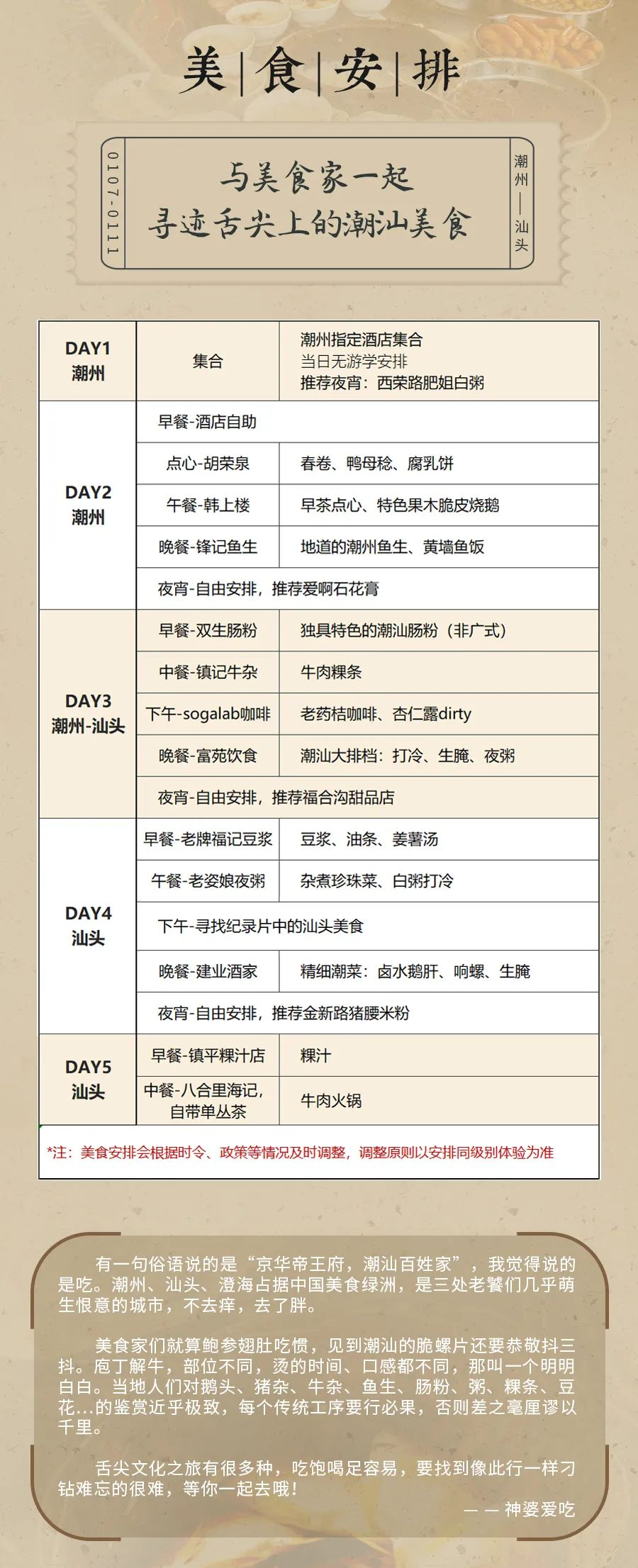 美食家、在地学者双讲师阵容,潮汕学院客座教授黄剑丰老师讲述潮州古建与文化;美食作家神婆老师带队潮汕双城的美食奇遇。多维度、多视角对话交流,呈现丰富细腻的深度旅行体验。