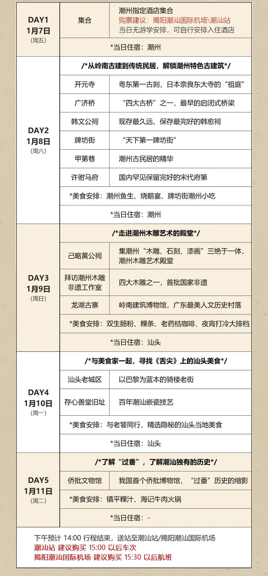 精选9处代表性岭南古建,涵盖古寺、宗祠、官邸、民居 4 种不同类型的建筑遗存;寻味10+处当地美食,包括正餐、间餐、宵夜、点心的地道推荐。一场真正的游、学、食、趣相结合的4日深度潮汕之旅。
