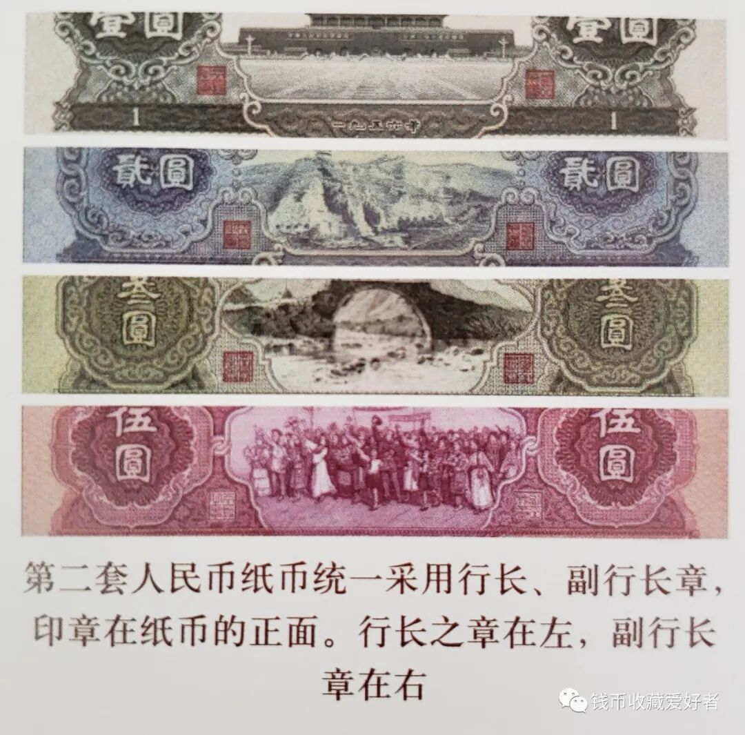 第二套人民币纸币统一采用行长、副行长章,印章在纸币正面。行长之章在左,副行长章在右。