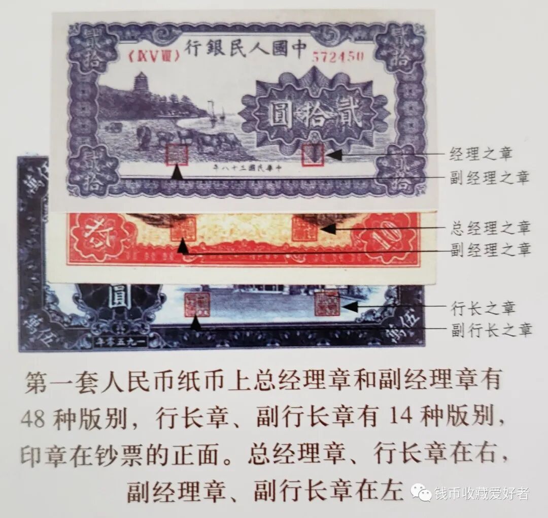 第一套人民币纸币上总经理章和副经理章有48种版别,行长章和副行长章有14种版别,印章在纸币的正面。总经理章、行长章在右,副经理章、副行长章在左。