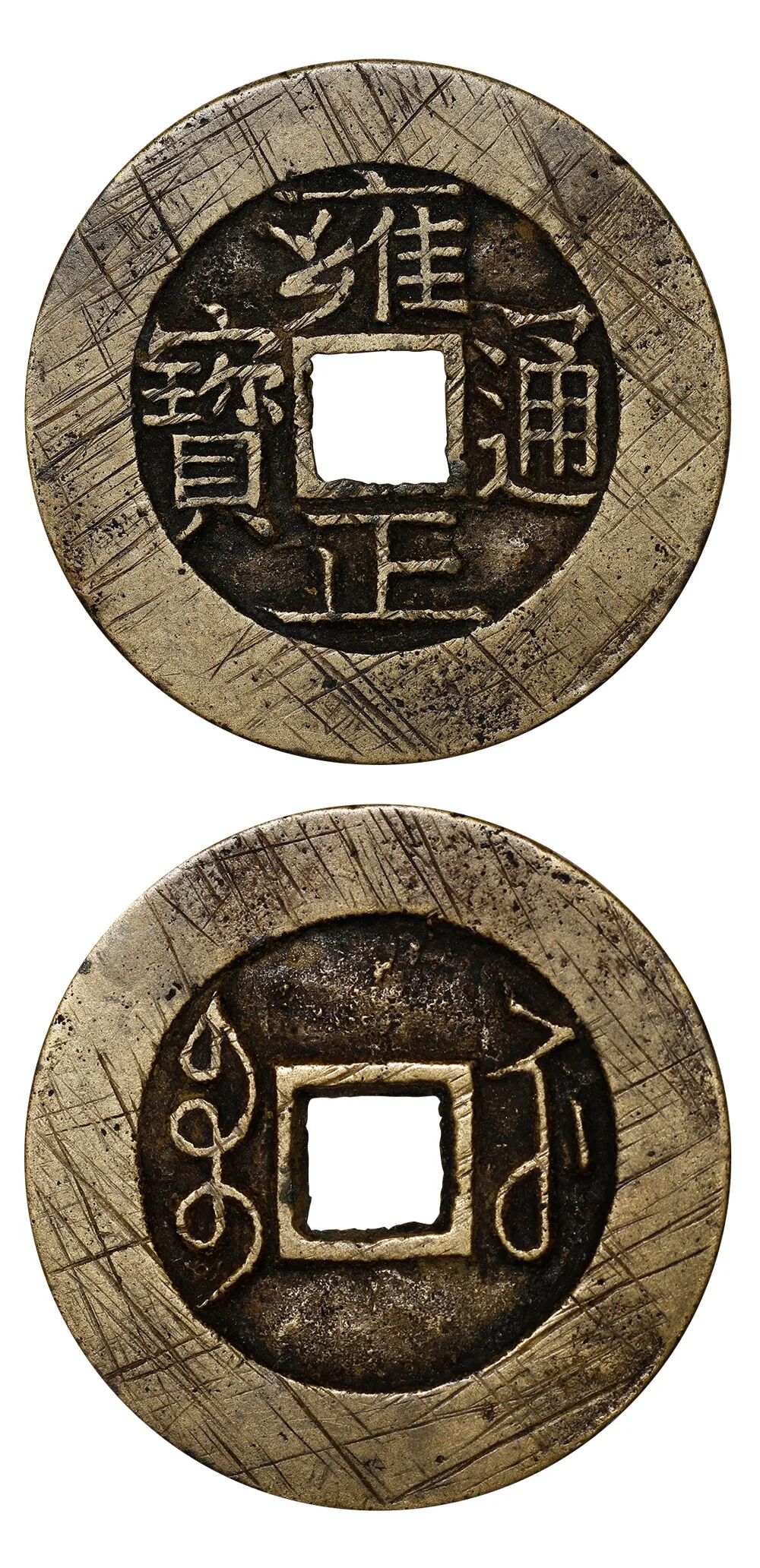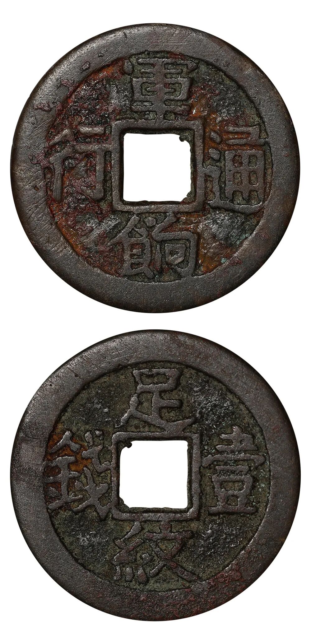 说明:此军饷银币的铜辅币是中国方孔钱中唯一写明军饷用币的当银虚值钱,一旦军饷银币退出流通,其必遭弃用,因此存世极为珍罕。